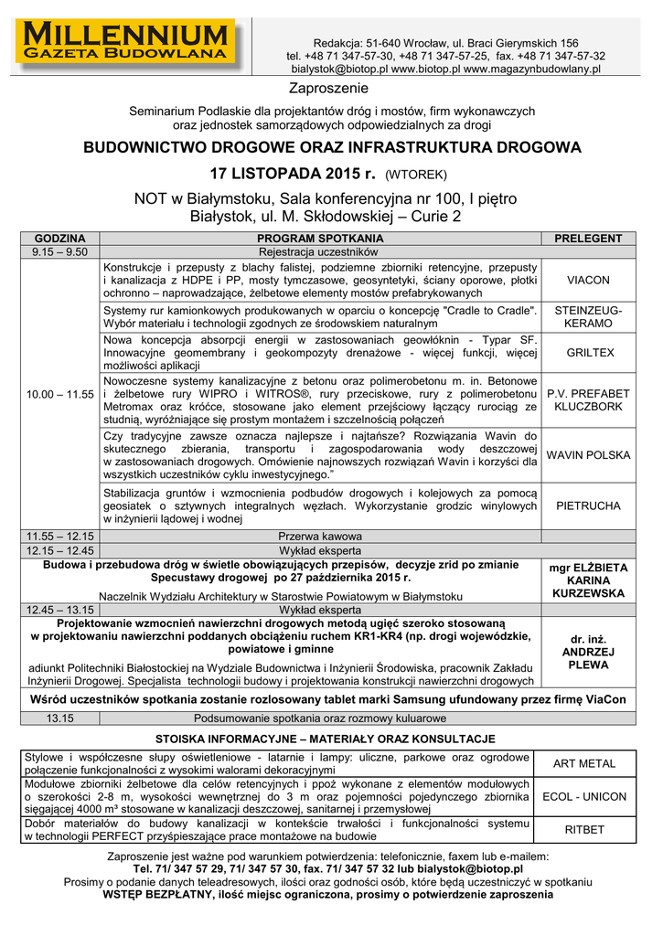 Redakcja: 51-640 Wrocław, ul. Braci Gierymskich 156 tel. +48 71 347-57-30, +48 71 347-57-25, fax. +48 71 347-57-32 [email protected] www.biotop.pl www.magazynbudowlany.pl Zaproszenie Seminarium Podlaskie dla projektantów dróg i mostów, firm wykonawczych oraz jednostek samorządowych odpowiedzialnych za drogi BUDOWNICTWO DROGOWE ORAZ INFRASTRUKTURA DROGOWA 17 LISTOPADA 2015 r. (WTOREK) NOT w Białymstoku, Sala konferencyjna nr 100, I piętro Białystok, ul. M. Skłodowskiej – Curie 2 GODZINA 9.15 – 9.50 PROGRAM SPOTKANIA Rejestracja uczestników Konstrukcje i przepusty z blachy falistej, podziemne zbiorniki retencyjne, przepusty i kanalizacja z HDPE i PP, mosty tymczasowe, geosyntetyki, ściany oporowe, płotki ochronno – naprowadzające, żelbetowe elementy mostów prefabrykowanych PRELEGENT VIACON Systemy rur kamionkowych produkowanych w oparciu o koncepcję "Cradle to Cradle". STEINZEUGWybór materiału i technologii zgodnych ze środowskiem naturalnym KERAMO Nowa koncepcja absorpcji energii w zastosowaniach geowłóknin - Typar SF. Innowacyjne geomembrany i geokompozyty drenażowe - więcej funkcji, więcej GRILTEX możliwości aplikacji Nowoczesne systemy kanalizacyjne z betonu oraz polimerobetonu m. in. Betonowe 10.00 – 11.55 i żelbetowe rury WIPRO i WITROS®, rury przeciskowe, rury z polimerobetonu P.V. PREFABET Metromax oraz króćce, stosowane jako element przejściowy łączący rurociąg ze KLUCZBORK studnią, wyróżniające się prostym montażem i szczelnością połączeń Czy tradycyjne zawsze oznacza najlepsze i najtańsze? Rozwiązania Wavin do skutecznego zbierania, transportu i zagospodarowania wody deszczowej WAVIN POLSKA w zastosowaniach drogowych. Omówienie najnowszych rozwiązań Wavin i korzyści dla wszystkich uczestników cyklu inwestycyjnego.” Stabilizacja gruntów i wzmocnienia podbudów drogowych i kolejowych za pomocą geosiatek o sztywnych integralnych węzłach. Wykorzystanie grodzic winylowych w inżynierii lądowej i wodnej 11.55 – 12.15 Przerwa kawowa 12.15 – 12.45 Wykład eksperta Budowa i przebudowa dróg w świetle obowiązujących przepisów, decyzje zrid po zmianie Specustawy drogowej po 27 października 2015 r. Naczelnik Wydziału Architektury w Starostwie Powiatowym w Białymstoku 12.45 – 13.15 Wykład eksperta Projektowanie wzmocnień nawierzchni drogowych metodą ugięć szeroko stosowaną w projektowaniu nawierzchni poddanych obciążeniu ruchem KR1-KR4 (np. drogi wojewódzkie, powiatowe i gminne adiunkt Politechniki Białostockiej na Wydziale Budownictwa i Inżynierii Środowiska, pracownik Zakładu Inżynierii Drogowej. Specjalista technologii budowy i projektowania konstrukcji nawierzchni drogowych PIETRUCHA mgr ELŻBIETA KARINA KURZEWSKA dr. inż. ANDRZEJ PLEWA Wśród uczestników spotkania zostanie rozlosowany tablet marki Samsung ufundowany przez firmę ViaCon 13.15 Podsumowanie spotkania oraz rozmowy kuluarowe STOISKA INFORMACYJNE – MATERIAŁY ORAZ KONSULTACJE Stylowe i współczesne słupy oświetleniowe - latarnie i lampy: uliczne, parkowe oraz ogrodowe połączenie funkcjonalności z wysokimi walorami dekoracyjnymi Modułowe zbiorniki żelbetowe dla celów retencyjnych i ppoż wykonane z elementów modułowych o szerokości 2-8 m, wysokości wewnętrznej do 3 m oraz pojemności pojedynczego zbiornika sięgającej 4000 m³ stosowane w kanalizacji deszczowej, sanitarnej i przemysłowej Dobór materiałów do budowy kanalizacji w kontekście trwałości i funkcjonalności systemu w technologii PERFECT przyśpieszające prace montażowe na budowie ART METAL ECOL - UNICON RITBET Zaproszenie jest ważne pod warunkiem potwierdzenia: telefonicznie, faxem lub e-mailem: Tel. 71/ 347 57 29, 71/ 347 57 30, fax. 71/ 347 57 32 lub [email protected] Prosimy o podanie danych teleadresowych, ilości oraz godności osób, które będą uczestniczyć w spotkaniu WSTĘP BEZPŁATNY, ilość miejsc ograniczona, prosimy o potwierdzenie zaproszenia