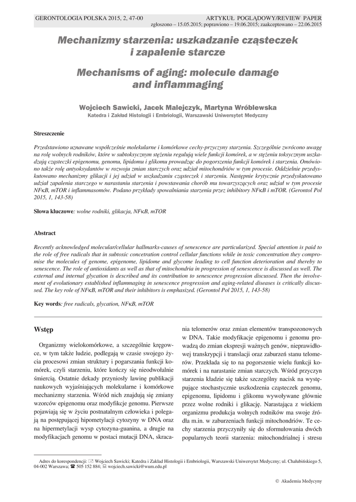 GERONTOLOGIA POLSKA 2015, 2, 47-00 ARTYKUŁ POGLĄDOWY/REVIEW PAPER zgłoszono – 15.05.2015; poprawiono – 19.06.2015; zaakceptowano – 22.06.2015 Mechanizmy starzenia: uszkadzanie cząsteczek i zapalenie starcze Mechanisms of aging: molecule damage and inflammaging Wojciech Sawicki, Jacek Malejczyk, Martyna Wróblewska Katedra i Zakład Histologii i Embriologii, Warszawski Uniwersytet Medyczny Streszczenie Przedstawiono uznawane współcześnie molekularne i komórkowe cechy-przyczyny starzenia. Szczególnie zwrócono uwagę na rolę wolnych rodników, które w subtoksycznym stężeniu regulują wiele funkcji komórek, a w stężeniu toksycznym uszkadzają cząsteczki epigenomu, genomu, lipidomu i glikomu prowadząc do pogorszenia funkcji komórek i starzenia. Omówiono także rolę antyoksydantów w rozwoju zmian starczych oraz udział mitochondriów w tym procesie. Oddzielnie przedyskutowano mechanizmy glikacji i jej udział w uszkadzaniu cząsteczek i starzeniu. Następnie krytycznie przedyskutowano udział zapalenia starczego w narastaniu starzenia i powstawania chorób mu towarzyszących oraz udział w tym procesie NFκB, mTOR i inflammasomów. Podano przykłady spowalniania starzenia przez inhibitory NFκB i mTOR. (Gerontol Pol 2015, 1, 143-58) Słowa kluczowe: wolne rodniki, glikacja, NFκB, mTOR Abstract Recently acknowledged molecular/cellular hallmarks-causes of senescence are particularized. Special attention is paid to the role of free radicals that in subtoxic concetration control cellular functions while in toxic concentration they compromise the molecules of genome, epigenome, lipidome and glycome leading to cell function deterioration and thereby to senescence. The role of antioxidants as well as that of mitochondria in progression of senescence is discussed as well. The external and internal glycation is described and its contribution to senescence progression discussed. Then the involvement of evolutionary established inflammaging in senescence progression and aging-related diseases is critically discussed. The key role of NFκB, mTOR and their inhibitors is emphasized. (Gerontol Pol 2015, 1, 143-58) Key words: free radicals, glycation, NFκB, mTOR Wstęp Organizmy wielokomórkowe, a szczególnie kręgowce, w tym także ludzie, podlegają w czasie swojego życia procesowi zmian struktury i pogarszania funkcji komórek, czyli starzeniu, które kończy się nieodwołalnie śmiercią. Ostatnie dekady przyniosły lawinę publikacji naukowych wyjaśniających molekularne i komórkowe mechanizmy starzenia. Wśród nich znajdują się zmiany wzorców epigenomu oraz modyfikcje genomu. Pierwsze pojawiają się w życiu postnatalnym człowieka i polegają na postępującej hipometylacji cytozyny w DNA oraz na hipermetylacji wysp cytozyna-guanina, a drugie na modyfikacjach genomu w postaci mutacji DNA, skraca- nia telomerów oraz zmian elementów transpozonowych w DNA. Takie modyfikacje epigenomu i genomu prowadzą do zmian ekspresji ważnych genów, nieprawidłowej transkrypcji i translacji oraz zaburzeń stanu telomerów. Przekłada się to na pogorszenie wielu funkcji komórek i na narastanie zmian starczych. Wśród przyczyn starzenia kładzie się także szczególny nacisk na występujące stochastycznie uszkodzenia cząsteczek genomu, epigenomu, lipidomu i glikomu wywoływane głównie przez wolne rodniki i glikację. Narastająca z wiekiem organizmu produkcja wolnych rodników ma swoje źródła m.in. w zaburzeniach funkcji mitochondriów. Te cechy starzenia przyczyniły się do sformułowania dwóch popularnych teorii starzenia: mitochondrialnej i stresu Adres do korespondencji: Wojciech Sawicki; Katedra i Zakład Histologii i Embriologii, Warszawski Uniwersytet Medyczny; ul. Chałubińskiego 5, 04-002 Warszawa; 505 152 884; [email protected] Ó Akademia Medycyny 48 WOJCIECH SAWICKI, JACEK MALEJCZYK I MARTYNA WRÓBLEWSKA oksydacyjnego. Najnowsze dane doświadczalne wskazują jednak, że udział wolnych rodników i zaburzeń mitochondriów w wywoływaniu zmian starczych nie jest typu propter hoc, a może być raczej typu post hoc. Dlatego ciągle poszukuje się pierwotnej przyczyny zmian starczych. Inna teoria przyczyn starzenia doszukuje się ich w pełzającym rozwoju przewlekłego stanu zapalnego (inflammaging) o niewielkim nasileniu. Taki, rozwijający się z wiekiem stan zapalny jest, jak się sądzi, ugruntowany ewolucyjnie i odgrywa rolę w patogenezie postępujących zmian starczych, a także chorób związanych ze starzeniem. Mimo niedoskonałości, teoria zapalenia starczego wyjaśnia wiele problemów z dziedziny teorii i klinicznej terapii. Rola wolnych rodników. Stres oksydacyjny Regulacyjna rola wolnych rodników. Wolne rodniki w stężeniu subtoksycznym pełnią dobrotliwe funkcje informatorów wewnątrzkomórkowych [1,2]. Kontrolują wówczas czynniki transkrypcji i transkrypcję oraz regulują aktywność kinaz i fosfataz. Działają także na białka bogate w cysteinę, np. na kinazę MAP, wytwarzają wiązania S-S, zmieniają jej konformację i aktywność. Regulują również metylację cytozyny w DNA modyfikując epigenom. Wzrost stężenia wolnych rodników z wiekiem zaburza ich regulacyjną rolę prowadząc dodatkowo, według wielu autorów do narastania starzenia entropowego. Uszkadzanie cząsteczek. Jednak wolne rodniki w wysokim stężeniu są przyczyną uszkodzeń cząsteczek, w tym DNA. Jest to szczególnie widoczne w stanach patologicznych i występuje także z wiekiem (stres oksydacyjny) przyczyniając się do narastania procesu starzenia. Dało to asumpt do sformułowania teorii stresu oksydacyjnego, jako jednej z przyczyn starzenia, która obecnie jest krytykowana [3-6]. Tlen jest potencjalnie toksyczny i chociaż jest niezbędny do życia komórek organizmów tlenowych, ujawnia także swoje szkodliwe działanie. Ok. 2% tlenu zużywanego przez komórki ulega niepełnej redukcji poprzez dodawanie elektronów. Prowadzi to do powstawania re