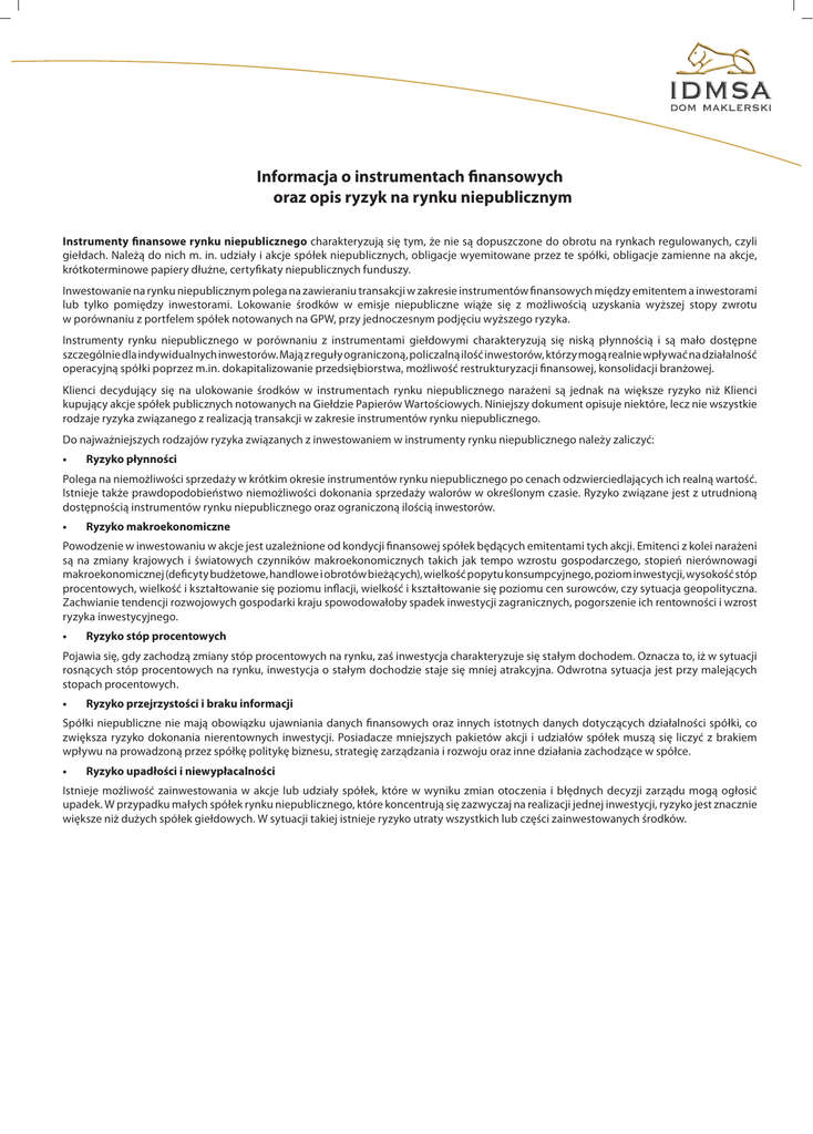 Informacja o instrumentach finansowych oraz opis ryzyk na rynku niepublicznym Instrumenty finansowe rynku niepublicznego charakteryzują się tym, że nie są dopuszczone do obrotu na rynkach regulowanych, czyli giełdach. Należą do nich m. in. udziały i akcje spółek niepublicznych, obligacje wyemitowane przez te spółki, obligacje zamienne na akcje, krótkoterminowe papiery dłużne, certyfikaty niepublicznych funduszy. Inwestowanie na rynku niepublicznym polega na zawieraniu transakcji w zakresie instrumentów finansowych między emitentem a inwestorami lub tylko pomiędzy inwestorami. Lokowanie środków w emisje niepubliczne wiąże się z możliwością uzyskania wyższej stopy zwrotu w porównaniu z portfelem spółek notowanych na GPW, przy jednoczesnym podjęciu wyższego ryzyka. Instrumenty rynku niepublicznego w porównaniu z instrumentami giełdowymi charakteryzują się niską płynnością i są mało dostępne szczególnie dla indywidualnych inwestorów. Mają z reguły ograniczoną, policzalną ilość inwestorów, którzy mogą realnie wpływać na działalność operacyjną spółki poprzez m.in. dokapitalizowanie przedsiębiorstwa, możliwość restrukturyzacji finansowej, konsolidacji branżowej. Klienci decydujący się na ulokowanie środków w instrumentach rynku niepublicznego narażeni są jednak na większe ryzyko niż Klienci kupujący akcje spółek publicznych notowanych na Giełdzie Papierów Wartościowych. Niniejszy dokument opisuje niektóre, lecz nie wszystkie rodzaje ryzyka związanego z realizacją transakcji w zakresie instrumentów rynku niepublicznego. Do najważniejszych rodzajów ryzyka związanych z inwestowaniem w instrumenty rynku niepublicznego należy zaliczyć: • Ryzyko płynności Polega na niemożliwości sprzedaży w krótkim okresie instrumentów rynku niepublicznego po cenach odzwierciedlających ich realną wartość. Istnieje także prawdopodobieństwo niemożliwości dokonania sprzedaży walorów w określonym czasie. Ryzyko związane jest z utrudnioną dostępnością instrumentów rynku niepublicznego oraz ograniczoną ilością inwestorów. • Ryzyko makroekonomiczne Powodzenie w inwestowaniu w akcje jest uzależnione od kondycji finansowej spółek będących emitentami tych akcji. Emitenci z kolei narażeni są na zmiany krajowych i światowych czynników makroekonomicznych takich jak tempo wzrostu gospodarczego, stopień nierównowagi makroekonomicznej (deficyty budżetowe, handlowe i obrotów bieżących), wielkość popytu konsumpcyjnego, poziom inwestycji, wysokość stóp procentowych, wielkość i kształtowanie się poziomu inflacji, wielkość i kształtowanie się poziomu cen surowców, czy sytuacja geopolityczna. Zachwianie tendencji rozwojowych gospodarki kraju spowodowałoby spadek inwestycji zagranicznych, pogorszenie ich rentowności i wzrost ryzyka inwestycyjnego. • Ryzyko stóp procentowych Pojawia się, gdy zachodzą zmiany stóp procentowych na rynku, zaś inwestycja charakteryzuje się stałym dochodem. Oznacza to, iż w sytuacji rosnących stóp procentowych na rynku, inwestycja o stałym dochodzie staje się mniej atrakcyjna. Odwrotna sytuacja jest przy malejących stopach procentowych. • Ryzyko przejrzystości i braku informacji Spółki niepubliczne nie mają obowiązku ujawniania danych finansowych oraz innych istotnych danych dotyczących działalności spółki, co zwiększa ryzyko dokonania nierentownych inwestycji. Posiadacze mniejszych pakietów akcji i udziałów spółek muszą się liczyć z brakiem wpływu na prowadzoną przez spółkę politykę biznesu, strategię zarządzania i rozwoju oraz inne działania zachodzące w spółce. • Ryzyko upadłości i niewypłacalności Istnieje możliwość zainwestowania w akcje lub udziały spółek, które w wyniku zmian otoczenia i błędnych decyzji zarządu mogą ogłosić upadek. W przypadku małych spółek rynku niepublicznego, które koncentrują się zazwyczaj na realizacji jednej inwestycji, ryzyko jest znacznie większe niż dużych spółek giełdowych. W sytuacji takiej istnieje ryzyko utraty wszystkich lub części zainwestowanych środków. Dom Maklerski IDMSA 31-041 Kraków, Mały Rynek 7 tel. 012 397 06 00 fax 012 397 06 01 e-mail: [email protected] www.idmsa.pl NIP: 676-20-70-700 Regon: 35 1528 670 Sąd Rejonowy dla Krakowa-Śródmieścia w Krakowie XI Wydział Gospodarczy Rejestru Sądowego, KRS 0000004483 Kapitał zakładowy pokryty w całości w wysokości 21.817.685,60 zł w tym do wysokości 18.558.842,80 zł opłacony gotówką, w pozostałej części pokryty aportem. infolinia 0801 900 201 Aktywa zdeponowane w DM IDMSA gwarantuje system rekompensat* *podstawa prawna: Dział V Ustawy z 29 lipca 2005 r. o obrocie istrumentami finansowymi Zarząd: Grzegorz Leszczyński – Prezes Zarządu Rafał Abratański – Wiceprezes Zarządu DM IDMSA wspiera Fundację im. Brata Alberta w Radwanowicach m.in. przekazując 0,50 zł od każdego zrealizowanego zlecenia maklerskiego na GPW, na realizację celów statutowych Fundacji. • Ryzyko prawne i podatkowe Zmiany obowiązujących przepisów prawnych dotyczących działalności spółki oraz zmiany w systemie podatkowym mogą negatywnie wpłynąć na osiągane przez spółki wyniki. • Ryzyko branży Sytuacja gospodarcza branży, w której działa spółka, perspektywy rozwoju, jej konkurencyjność w stosunku do innych branż oraz ograniczenia wpływają na wyniki spółki, a tym samym wycenę i wartość związanych z nią instrumentów rynku niepublicznego. ___________________, dnia_______________________ (miejscowość) (data) ______________________________________________ ________________________________________ (Imię i Nazwisko Klienta) (podpis Klienta) Dom Maklerski IDMSA 31-041 Kraków, Mały Rynek 7 tel. 012 397 06 00 fax 012 397 06 01 e-mail: [email protected] www.idmsa.pl NIP: 676-20-70-700 Regon: 35 1528 670 Sąd Rejonowy dla Krakowa-Śródmieścia w Krakowie XI Wydzi