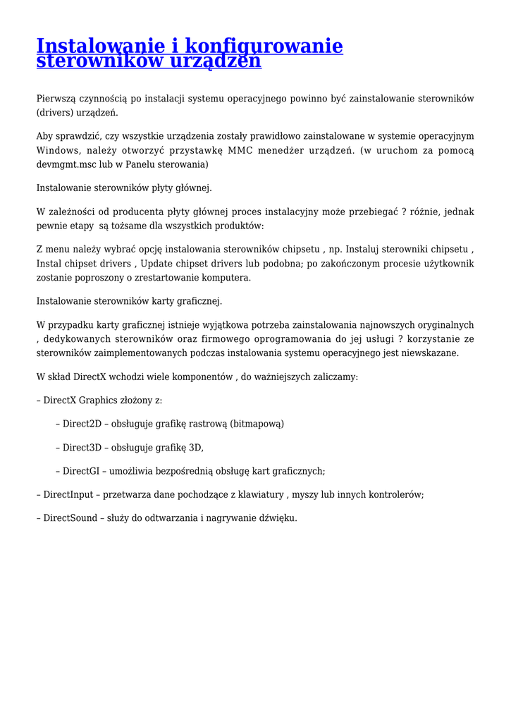 Instalowanie i konfigurowanie sterowników urządzeń Pierwszą czynnością po instalacji systemu operacyjnego powinno być zainstalowanie sterowników (drivers) urządzeń. Aby sprawdzić, czy wszystkie urządzenia zostały prawidłowo zainstalowane w systemie operacyjnym Windows, należy otworzyć przystawkę MMC menedżer urządzeń. (w uruchom za pomocą devmgmt.msc lub w Panelu sterowania) Instalowanie sterowników płyty głównej. W zależności od producenta płyty głównej proces instalacyjny może przebiegać ? różnie, jednak pewnie etapy są tożsame dla wszystkich produktów: Z menu należy wybrać opcję instalowania sterowników chipsetu , np. Instaluj sterowniki chipsetu , Instal chipset drivers , Update chipset drivers lub podobna; po zakończonym procesie użytkownik zostanie poproszony o zrestartowanie komputera. Instalowanie sterowników karty graficznej. W przypadku karty graficznej istnieje wyjątkowa potrzeba zainstalowania najnowszych oryginalnych , dedykowanych sterowników oraz firmowego oprogramowania do jej usługi ? korzystanie ze sterowników zaimplementowanych podczas instalowania systemu operacyjnego jest niewskazane. W skład DirectX wchodzi wiele komponentów , do ważniejszych zaliczamy: – DirectX Graphics złożony z: – Direct2D – obsługuje grafikę rastrową (bitmapową) – Direct3D – obsługuje grafikę 3D, – DirectGI – umożliwia bezpośrednią obsługę kart graficznych; – DirectInput – przetwarza dane pochodzące z klawiatury , myszy lub innych kontrolerów; – DirectSound – służy do odtwarzania i nagrywanie dźwięku.
