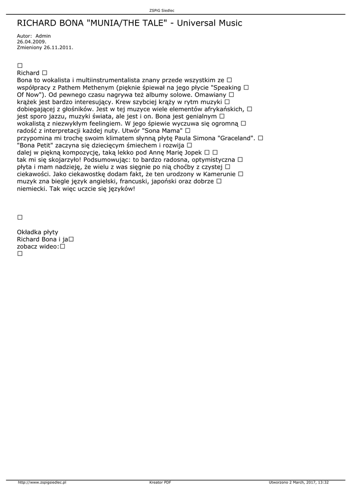 ZSPiG Siedlec RICHARD BONA "MUNIA/THE TALE" - Universal Music Autor: Admin 26.04.2009. Zmieniony 26.11.2011. Richard Bona to wokalista i multiinstrumentalista znany przede wszystkim ze współpracy z Pathem Methenym (pięknie śpiewał na jego płycie "Speaking Of Now"). Od pewnego czasu nagrywa też albumy solowe. Omawiany krążek jest bardzo interesujący. Krew szybciej krąży w rytm muzyki dobiegającej z głośników. Jest w tej muzyce wiele elementów afrykańskich, jest sporo jazzu, muzyki świata, ale jest i on. Bona jest genialnym wokalistą z niezwykłym feelingiem. W jego śpiewie wyczuwa się ogromną radość z interpretacji każdej nuty. Utwór "Sona Mama" przypomina mi trochę swoim klimatem słynną płytę Paula Simona "Graceland". "Bona Petit" zaczyna się dziecięcym śmiechem i rozwija dalej w piękną kompozycję, taką lekko pod Annę Marię Jopek tak mi się skojarzyło! Podsumowując: to bardzo radosna, optymistyczna płyta i mam nadzieję, że wielu z was sięgnie po nią choćby z czystej ciekawości. Jako ciekawostkę dodam fakt, że ten urodzony w Kamerunie muzyk zna biegle język angielski, francuski, japoński oraz dobrze niemiecki. Tak więc uczcie się języków! Okładka płyty Richard Bona i ja zobacz wideo: http://www.zspigsiedlec.pl Kreator PDF Utworzono 2 March, 2017, 13:32
