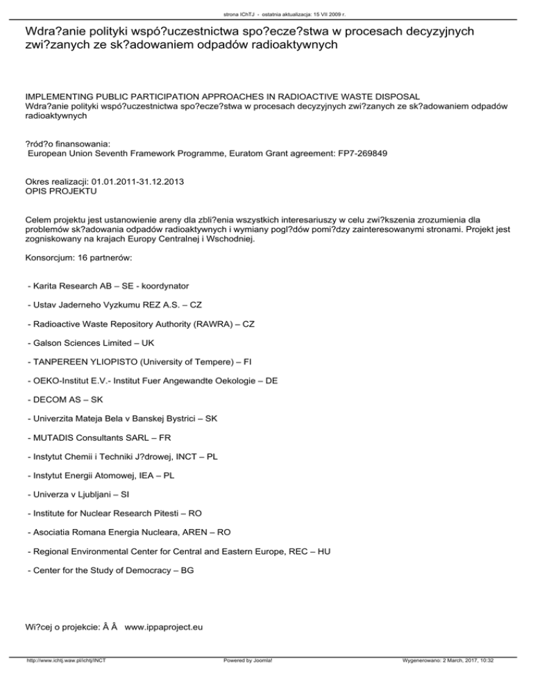 strona IChTJ - ostatnia aktualizacja: 15 VII 2009 r. Wdra?anie polityki wspó?uczestnictwa spo?ecze?stwa w procesach decyzyjnych zwi?zanych ze sk?adowaniem odpadów radioaktywnych IMPLEMENTING PUBLIC PARTICIPATION APPROACHES IN RADIOACTIVE WASTE DISPOSAL Wdra?anie polityki wspó?uczestnictwa spo?ecze?stwa w procesach decyzyjnych zwi?zanych ze sk?adowaniem odpadów radioaktywnych ?ród?o finansowania: European Union Seventh Framework Programme, Euratom Grant agreement: FP7-269849 Okres realizacji: 01.01.2011-31.12.2013 OPIS PROJEKTU Celem projektu jest ustanowienie areny dla zbli?enia wszystkich interesariuszy w celu zwi?kszenia zrozumienia dla problemów sk?adowania odpadów radioaktywnych i wymiany pogl?dów pomi?dzy zainteresowanymi stronami. Projekt jest zogniskowany na krajach Europy Centralnej i Wschodniej. Konsorcjum: 16 partnerów: - Karita Research AB – SE - koordynator - Ustav Jaderneho Vyzkumu REZ A.S. – CZ - Radioactive Waste Repository Authority (RAWRA) – CZ - Galson Sciences Limited – UK - TANPEREEN YLIOPISTO (University of Tempere) – FI - OEKO-Institut E.V.- Institut Fuer Angewandte Oekologie – DE - DECOM AS – SK - Univerzita Mateja Bela v Banskej Bystrici – SK - MUTADIS Consultants SARL – FR - Instytut Chemii i Techniki J?drowej, INCT – PL - Instytut Energii Atomowej, IEA – PL - Univerza v Ljubljani – SI - Institute for Nuclear Research Pitesti – RO - Asociatia Romana Energia Nucleara, AREN – RO - Regional Environmental Center for Central and Eastern Europe, REC – HU - Center for the Study of Democracy – BG Wi?cej o projekcie: Â Â www.ippaproject.eu http://www.ichtj.waw.pl/ichtj/INCT Powered by Joomla! Wygenerowano: 2 March, 2017, 10:32