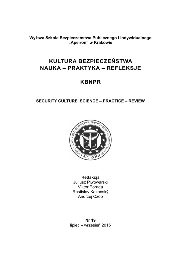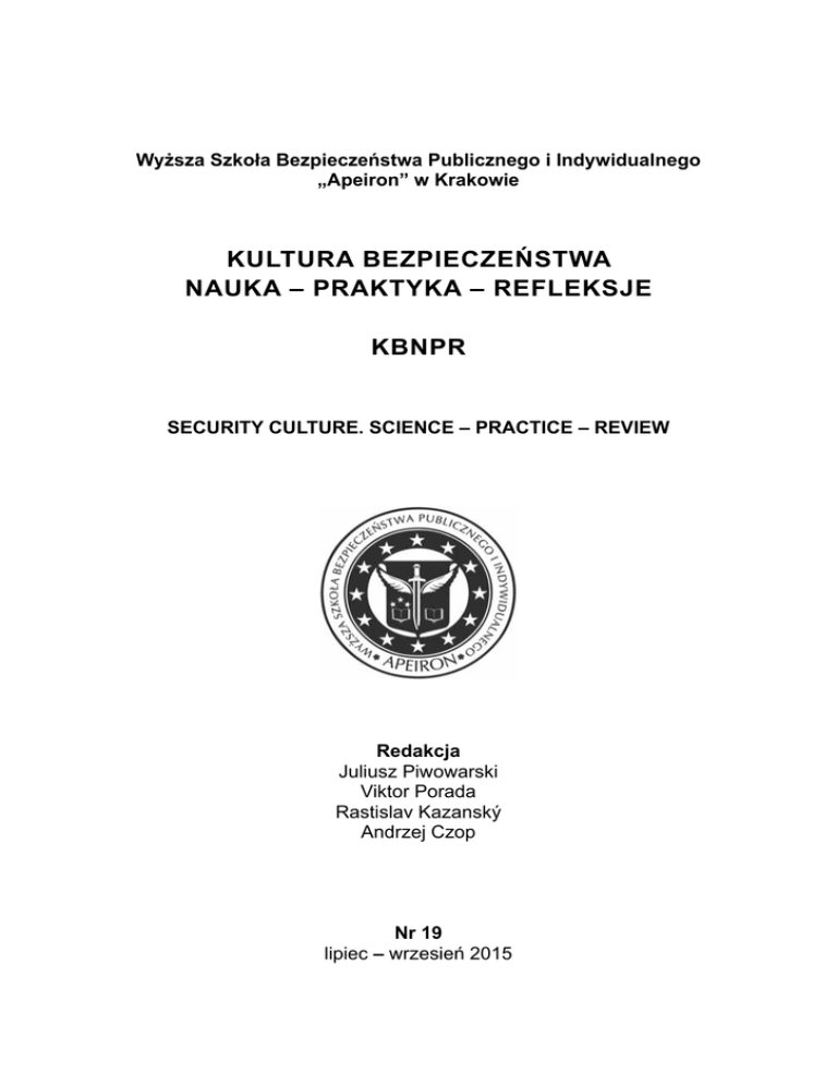 Wyższa Szkoła Bezpieczeństwa Publicznego i Indywidualnego „Apeiron” w Krakowie KULTURA BEZPIECZEŃSTWA NAUKA – PRAKTYKA – REFLEKSJE KBNPR SECURITY CULTURE. SCIENCE – PRACTICE – REVIEW Redakcja Juliusz Piwowarski Viktor Porada Rastislav Kazanský Andrzej Czop Nr 19 lipiec – wrzesień 2015 Redaktorzy tomu ■ Editorial Committee ■ Редакционный совет журнала Assoc. Prof. Juliusz Piwowarski, Ph.D., (Polska ■ Poland ■ Польша) Юлиуш Пивоварски, д-р филос. наук Prof. JUDr. Ing. Viktor Porada, DrSc., dr. h. c. mult., (Czechy ■ Czech Republic ■ Чехия) Проф. Виктор Порада, д-р юрид. наук., д-р инж., dr. h. c. mult Doc. Rastislav Kazanský, Ph.D. (Słowacja ■ Slovak Republic ■ Словакия) Растислав Казански, д-р Andrzej Czop, Ph.D. (Polska ■ Poland ■ Польша) Анджей Чоп, д-р юрид. наук Przygotowanie do wydania ■ Prepared for editing by ■ Подготовили к печати Radosława Rodasik, Jarosław Dziubiński Радослава Родасик, Ярослав Дзюбиньски Copyright © by Wyższa Szkoła Bezpieczeństwa Publicznego i Indywidualnego „Apeiron” w Krakowie Copyright © by University of Public and Individual Security “Apeiron” in Cracow Kwartalnik indeksowany jest w bazach The quartely journal is index in the following databases Ежеквартальник индексирован в следующих базах: 6 pkt. ■ 6 points ■ 6 баллов ICV 60,95 pkt. ■ 60,95 points ■ 60,95 балла ISSN 2299-4033 Nakład: 100 egz. ■ Circulation: 100 cop. ■ Тираж: 100 экз. Wyższa Szkoła Bezpieczeństwa Publicznego i Indywidualnego „Apeiron” w Krakowie University of Public and Individual Security “Apeiron” in Cracow Высшее учебное заведение публичной и индивидуальной безопасности «Апейрон» в Кракове, Польша ul. Krupnicza 3, 31–123 Kraków Tel. (12) 422 30 68; Fax. (12) 421 67 25 e-mail: [email protected] www.kultura-bezpieczenstwa.pl Wersja elektroniczna jest wersją pierwotną Electronic version constitutes a primary version of the journal Электронная версия ежеквартальника является первичной версией. Rada Naukowa Prof. Stanislav Dadelo, Ph.D., (Litwa) Ing. Štefan Galla, Ph.D., (Słowacja) Janusz Gierszewski, Ph.D., (Polska) Assoc. Prof. Teresa Grabińska, Ph.D., (Polska) Doc. Rastislav Kazanský, Ph.D., (Słowacja) Doc. Štefan Kočan, Ph.D., (Słowacja) Zbigniew Kuźniar, Ph.D., (Polska) Doc. PeadDr. Anton Lisnik, Ph.D., (Słowacja) Assist. Prof. Mojmir Mamojka, Ph.D., (Słowacja) Ing. Jozef Martinka, Ph.D., (Słowacja) Doc. Ing. Jana Müllerová, Ph.D., (Słowacja) Brig. Gen. Ondřej Novosad, (Słowacja) Prof. Jerzy Ochmann, Ph.D., (Polska) Assoc. Prof. Juliusz Piwowarski, Ph.D., (Polska) Doc. JUDr. Karel Schelle, CSc., (Czechy) Witold M. Sokołowski, Ph.D., (USA) Prof. Lyubomyr Ivanovych Sopilnyk, (Ukraina) Andrzej Wawrzusiszyn, Ph.D., (Polska) Prof. Zinaida Zhivko, Ph.D. (Ukraina) Recenzenci Assoc. Prof. Tadeusz Ambroży, Ph.D., (Polska) prof. PhDr. Ján Buzalka, CSc. (Słowacja) Wojciech Czajkowski, Ph.D., (Polska) Robert Częścik, Ph.D., (Polska) Assoc. Prof. Krzysztof Kaganek, Ph.D., (Polska) COL Ivo Pikner, Ph.D., (Czechy) prof. JUDr. Ing. Viktor Porada, DrSc., dr h. c. mult. (Czechy) Ing. Dana Roubinková, Ph.D. (Czechy) Bartosz Soliński, Ph.D., (Polska) Rostyslav Sopilnyk, Ph.D. (Ukraina) PaedDr. Samuel Uhrin, CSc. (Słowacja) Prof. Bernard Wiśniewski, Ph.D., (Polska) Vasyl Zaplatynskyi, Doc. Ph.D., (Ukraina) Prof. Janina Zięba-Palus, Ph.D., (Polska) Doc. JUDr. Vladimir Zoubek, LL.M., MBA. (Czechy) Editorial Advisory Board Prof. Stanislav Dadelo, Ph.D., (Lituania) Ing. Štefan Galla, Ph.D., (Slovak Republic) Janusz Gierszewski, Ph.D., (Poland) Assoc. Prof. Teresa Grabińska, Ph.D. (Poland) Doc. Rastislav Kazanský, Ph.D., (Slovakia) Doc. Štefan Kočan, Ph.D., (Slovakia) Zbigniew Kuźniar, Ph.D., (Poland) Doc. PeadDr. Anton Lisnik, Ph.D., (Slovak Republic) Assist. Prof. Mojmir Mamojka, Ph.D., (Slovakia) Ing. Jozef Martinka, Ph.D., (Slovakia) Doc. Ing. Jana Müllerová, Ph.D., (Slovakia) Brig. Gen. Ondřej Novosad, (Slovakia) Prof. Jerzy Ochmann, Ph.D., (Poland) Assoc. Prof. Juliusz Piwowarski, Ph.D., (Poland) Doc. JUDr. Karel Schelle, CSc., (Czech Republic) Witold M. Sokołowski, Ph.D., (USA) Prof. Lyubomyr Ivanovych Sopilnyk, (Ukraine) Andrzej Wawrzusiszyn, Ph.D., (Poland) Prof. Zinaida Zhivko, Ph.D. (Ukraine) Reviewers Assoc. Prof. Tadeusz Ambroży, Ph.D., (Poland) prof. PhDr. Ján Buzalka, CSc. (Slovakia) Wojciech Czajkowski, Ph.D., (Polska) Robert Częścik, Ph.D., (Poland) Assoc. Prof. Krzysztof Kaganek, Ph.D., (Poland) COL Ivo Pikner, Ph.D., (Czech Republic) prof. JUDr. Ing. Viktor Porada, DrSc., dr h. c. mult. (Czech Republic) Ing. Dana Roubinková, Ph.D. (Czech Republic) Bartosz Soliński, Ph.D., (Poland) Rostyslav Sopilnyk, Ph.D. (Ukraine) PaedDr. Samuel Uhrin, CSc. (Slovakia) Prof. Bernard Wiśniewski, Ph.D., (Poland) Vasyl Zaplatynskyi, Doc. Ph.D., (Ukraine) Prof. Janina Zięba-Palus, Ph.D., (Poland) Doc. JUDr. Vladimir Zoubek, LL.M., MBA. (Czech Republic) Научный совет Проф. Станислав Дадело, д-р., (Литва) Штефан Галла, д-р инж., (Словакия) Януш Гершевски, д-р, (Польша) Проф. Тереза Грабинска, д-р, (Польша) Барбара Качмарчик, д-р, (Польша) Растислав Казански, д-р, доц., (Словакия) Штефан Кочан, д-р, доц., (Словакия) Збигнев Кузняр, д-р, (Польша) Антон Лисник, д-р, доц., (Словакия) Асс. проф. Моймир Мамойка, д-р, (Словакия) Йозеф Ма