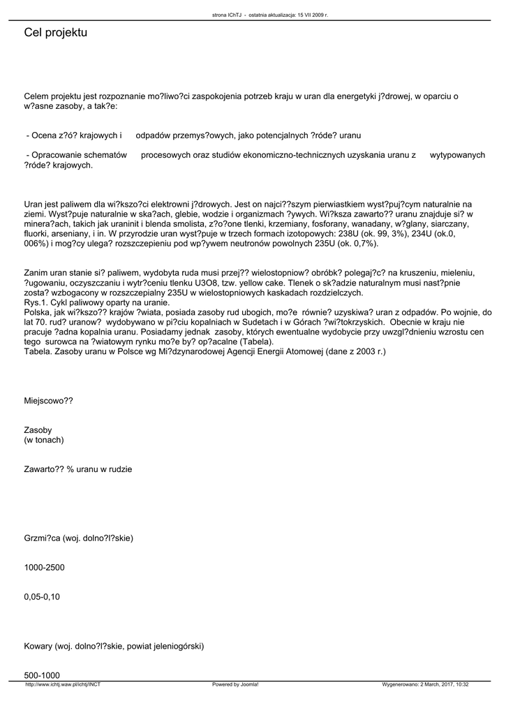 strona IChTJ - ostatnia aktualizacja: 15 VII 2009 r. Cel projektu Celem projektu jest rozpoznanie mo?liwo?ci zaspokojenia potrzeb kraju w uran dla energetyki j?drowej, w oparciu o w?asne zasoby, a tak?e: - Ocena z?ó? krajowych i - Opracowanie schematów ?róde? krajowych. odpadów przemys?owych, jako potencjalnych ?róde? uranu procesowych oraz studiów ekonomiczno-technicznych uzyskania uranu z wytypowanych Uran jest paliwem dla wi?kszo?ci elektrowni j?drowych. Jest on najci??szym pierwiastkiem wyst?puj?cym naturalnie na ziemi. Wyst?puje naturalnie w ska?ach, glebie, wodzie i organizmach ?ywych. Wi?ksza zawarto?? uranu znajduje si? w minera?ach, takich jak uraninit i blenda smolista, z?o?one tlenki, krzemiany, fosforany, wanadany, w?glany, siarczany, fluorki, arseniany, i in. W przyrodzie uran wyst?puje w trzech formach izotopowych: 238U (ok. 99, 3%), 234U (ok.0, 006%) i mog?cy ulega? rozszczepieniu pod wp?ywem neutronów powolnych 235U (ok. 0,7%). Zanim uran stanie si? paliwem, wydobyta ruda musi przej?? wielostopniow? obróbk? polegaj?c? na kruszeniu, mieleniu, ?ugowaniu, oczyszczaniu i wytr?ceniu tlenku U3O8, tzw. yellow cake. Tlenek o sk?adzie naturalnym musi nast?pnie zosta? wzbogacony w rozszczepialny 235U w wielostopniowych kaskadach rozdzielczych. Rys.1. Cykl paliwowy oparty na uranie. Polska, jak wi?kszo?? krajów ?wiata, posiada zasoby rud ubogich, mo?e równie? uzyskiwa? uran z odpadów. Po wojnie, do lat 70. rud? uranow? wydobywano w pi?ciu kopalniach w Sudetach i w Górach ?wi?tokrzyskich. Obecnie w kraju nie pracuje ?adna kopalnia uranu. Posiadamy jednak zasoby, których ewentualne wydobycie przy uwzgl?dnieniu wzrostu cen tego surowca na ?wiatowym rynku mo?e by? op?acalne (Tabela). Tabela. Zasoby uranu w Polsce wg Mi?dzynarodowej Agencji Energii Atomowej (dane z 2003 r.) Miejscowo?? Zasoby (w tonach) Zawarto?? % uranu w rudzie Grzmi?ca (woj. dolno?l?skie) 1000-2500 0,05-0,10 Kowary (woj. dolno?l?skie, powiat jeleniogórski) 500-1000 http://www.ichtj.waw.pl/ichtj/INCT Powered by Joomla! Wygenerowano: 2 March, 2017, 10:32 strona IChTJ - ostatnia aktualizacja: 15 VII 2009 r. 0,20-0,50 Krynica Morska(woj. pomorskie, powiat nowodworski) 2500-5000 0,05-0,10 Okrzeszyn (woj. dolno?l?skie, powiat kamiennogórski) 1000-2500 0,05-0,10 Radoniów (woj. dolno?l?skie, powiat lwówecki) 500-1000 0,20-0,50 Rajsk (woj. podlaskie, powiat bielski) 5000-10000 0,03-0,05 Wambierzyce (woj. dolno?l?skie, powiat k?odzki) 1000-2500 0,03-0,05 http://www.ichtj.waw.pl/ichtj/INCT Powered by Joomla! Wygenerowano: 2 March, 2017, 10:32