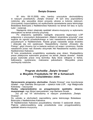 Święto Drzewa W dniu 09.10.2009 roku bardzo uroczyście obchodziliśmy w naszym przedszkolu „Święto Drzewa”. W tym dniu poprosiliśmy rodziców, aby wszystkie dzieci przyszły ubrane w kolorze zielonym. Uroczystość rozpoczęliśmy od wysłuchania opowiadania pana leśniczego Bolesława Bobrzyka z Nadleśnictwa Katowice na temat roli lasu w Ŝyciu ludzi i zwierząt. Następnie dzieci obejrzały spektakl słowno-muzyczny w wykonaniu starszaków na temat ochrony przyrody. Po obejrzeniu spektaklu nastąpiło wręczenie legitymacji LOP połączone z uroczystym ślubowaniem „Małych straŜników przyrody” oraz wyjście do ogrodu przedszkolnego w celu nasadzenia sadzonek drzew pozyskanych w Nadleśnictwie. KaŜda grupa nasadziła swoje drzewko i obiecała się nim opiekować. Nasadziliśmy równieŜ „Drzewko dla Pokoju”, gdyŜ chcemy Ŝyć w świecie wolnym od wojen i przemocy. KaŜde nasadzone przez nas drzewko otrzymało Akt Nasadzenia wydany przez Nadleśnictwo Katowice. W holu przedszkola urządziliśmy wystawkę prac dzieci. Wystawiliśmy prace plastyczne wykonane grupowo na temat „Nasze drzewa”. KaŜda grupa wykonała prace inną technika. Były liście odbijane w farbie, kalkowane, wydzierane, malowane paluszkami. Wszystkie prace zachwyciły rodziców. Program obchodów „Święto Drzewa” w Miejskim Przedszkolu Nr 99 w Katowicach 9 PAŹDZIERNIKA 2009r. Opracowanie programu obchodów „Święta Drzewa” oraz koordynacja działań - mgr Gabriela Skrzypczak – opiekun koła LOP, mgr Małgorzata Kołodziej – nauczyciel Osoby odpowiedzialne za przygotowanie spektaklu słownomuzycznego: mgr Alicja Ławrywianiec, mgr Barbara Grosik. JuŜ po raz VII obchodzimy w naszym przedszkolu „Święto Drzewa”. Do udziału w obchodach zaprosiliśmy pana leśniczego Bolesława Bobrzyka z Nadleśnictwa Katowice. W Nadleśnictwie Katowice pozyskaliśmy równieŜ 5 sadzonek drzew. Pięknie udekorowaliśmy aulę przedszkola oraz przygotowaliśmy spektakl słowno-muzyczny. Organizowaniu uroczystości przedszkolnej przewodziły następujące cele: • Przedstawienie koloru zielonego jako koloru przyjaznego środowisku • Ukazanie znaczenia drzew w Ŝyciu człowieka i zwierząt • Uświadomienie konieczności dbania o najbliŜsze otoczenie i ochronę przyrody • Nasadzenie sadzonek drzew w ogrodzie przedszkolnym – kaŜda grupa nasadziła swoje drzewko • Nasadzenie drzewka dla pokoju • Przyjęcie nowych członków w szeregi LOP • Wykorzystanie róŜnorodnych technik plastycznych do wykonania drzewa, zorganizowanie wystawki prac dzieci Środki dydaktyczne: Kolorowe liście, plansze, plakaty Klubu Gaja, przebrania dzieci, sadzonki drzew. I etap: 1. Wywieszenie plakatów informujących o obchodach Święta Drzewa II etap: 2. ZłoŜenie prośby w Nadleśnictwie Katowice o przekazanie sadzonek drzew - w związku z udziałem w Święcie Drzewa – pozyskaliśmy 5 sadzonek drzew. 3. Przygotowanie scenariusza spektaklu słowno-muzycznego – rozdanie ról dzieciom 4. Przystrojenie i dekoracja auli przedszkolnej przed uroczystością 5. Zorganizowanie wystawki prac plastycznych dzieci na temat „Nasze drzewa” III etap: 6. Zaproszenie leśniczego na uroczystość z prośbą o prelekcję na temat znaczenia drzew dla ludzi i zwierząt. 7. Odśpiewanie przez wszystkie dzieci hymnu specjalnie ułoŜonego z okazji Święta Drzewa autorstwa Gabrieli Skrzypczak ( koordynatora działań) do melodii „Jestem sobie ogrodniczka” Święto drzew dziś obchodzimy, Zdrowia, szczęścia im Ŝyczymy. Niechaj rosną wzwyŜ do góry, Niech sięgają aŜ pod chmury. Ref.: Nasze ukochane drzewa, w waszych liściach ptaszek śpiewa, wasza zieleń da powietrze to dla ludzi jest najlepsze. Sadźmy krzaki, sadźmy drzewa, śeby zawsze ptak mógł śpiewać, By powietrze było czyste Dbaj o zieleń oczywiście Ref.: Nasze ukochane drzewa....... 8. Prezentacja inscenizacji w wykonaniu starszaków. 9. Przyjęcie nowych członków do LOP, wręczenie legitymacji, złoŜenie ślubowania 10. Nasadzenie drzew w ogrodzie przedszkolnym. Autorka: Gabriela Skrzypczak - nauczyciel oraz opiekun Koła Koordynator działań ekologicznych w Miejskim Przedszkolu nr 99 w Katowicach Osoby zainteresowane nawiązaniem kontaktu proszę o wiadomość na adres: [email protected].