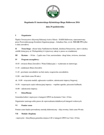 Regulamin II Amatorskiego Rybnickiego Biegu Halloween 2016 dnia 29 października I Organizator Śląskie Towarzystwo Aktywnej Rekreacji Active Silesia - IIARB Halloween, reprezentowany przez Przewodniczącego Komitetu Organizacyjnego - Arkadiusz Stec, nr tel. 510 228 379 (tylko w dniu zawodów). II Trasa biegu - obszar leśny Nadleśnictwa Rybnik, dzielnica Paruszowiec, start w okolicy szkółki leśnej przy ul. Wielopolskiej 6 A (pierwszy zakręt w prawo za wiaduktem). III Dystans - 10 km - 2 pętle oraz 5 km, nawierzchnia - drogi leśne, żwirowe, trawiaste. IV Program szczegółowy: 10.45 - otwarcie Biura Zawodów ( Wiata Edukacyjna ) - wydawanie nr startowego. 11.45 - zamknięcie Biura Zawodów. 11.45 - powitanie zawodników na linii startu; rozgrzewka zawodników. 12.00 – start (limit czasu 90 min.). ok. 14.00 - wręczenie medali, ogłoszenie wyników, zakończenie imprezy biegowej. 14.30 – rozpoczęcie części rekreacyjnej imprezy – wspólne ognisko, pieczenie kiełbasek. 16.00 – zakończenie imprezy. V Klasyfikacja Generalna kobiet i mężczyzn w kategorii OPEN na dystansie 5 km i 10 km. Organizator zastrzega sobie prawo do wprowadzania dodatkowych kategorii wiekowych. VI Pomiar czasu Pomiar czasu będzie prowadzony metodą elektroniczną – chip zwrotny; limit czasu 90 min. VII Medale i Dyplomy - mężczyźni - klasyfikacja generalna miejsca I-III w kategorii OPEN na 5 km i 10 km; - kobiety - klasyfikacja generalna miejsca I-III w kategorii OPEN na 5 km i 10 km; Uczestnicy, którzy ukończą bieg otrzymają medal okolicznościowy. VIII Uczestnictwo - limit startujących – 150 osób; - uczestnik przyjmuje do wiadomości, że udział w biegu wiąże się z wysiłkiem fizycznym i pociąga za sobą naturalne ryzyko i zagrożenie wypadkami, możliwość odniesienia obrażeń ciała i urazów fizycznych, w tym śmierci; - przekazanie organizatorowi podpisanej karty zgłoszenia oznacza, że uczestnik rozważył i ocenił charakter, zakres i stopień ryzyka wiążącego się z uczestnictwem w imprezie i dobrowolnie zdecydował się podjąć to ryzyko startując w biegu wyłącznie na własną odpowiedzialność; - pobranie numeru startowego przez zawodnika oznacza, że zawodnik zapoznał się z regulaminem biegu, akceptuje go i zobowiązuje się do jego przestrzegania; - wszyscy zawodnicy startujący w biegu muszą zostać zweryfikowani w biurze zawodów w dniu 29.10.2016. - w przypadku wątpliwości Organizatora - podczas weryfikacji zawodnicy muszą okazać dowód osobisty lub inny dowód stwierdzający tożsamość; - uczestnik wyraża zgodę na przetwarzanie danych osobowych oraz wizerunku na potrzebę imprezy; - każdy zawodnik ma obowiązek zapoznać się z regulaminem biegu i zobowiązany jest do jego przestrzegania. IX Opłata startowa Od zgłaszających się do biegu pobierana będzie opłata startowa w wysokości 20 zł oraz w wysokości 10 zł od członków stowarzyszenia Active Silesia, opłatę startową należy przelać na konto: Śląskie Towarzystwo Aktywnej Rekreacji Active Silesia, ul.Tęczowa 5/17-18 44-200 Rybnik nr rachunku: 31194010763169159000000000 w tytule przelewu proszę wpisać : IMIĘ NAZWISKO – opłata startowa bieg Halloween Elektroniczne zgłoszenia można przesyłać do dnia 26 października 2016 r. Po tym terminie rejestracja będzie niemożliwa. W ramach opłaty startowej zawodnik otrzymuje numer startowy, obsługę pomiaru czasu biegu, wodę mineralną na mecie, ma zapewnioną logistykę zaplecza przed i po biegu. Świadczenia dodatkowe - posiłek po biegu - każdy uczestnik biegu jest uprawniony do odbioru aprowizacji oraz napoju na podstawie okazanego nr startowego. X Zgłoszenia - zapisy - elektronicznie - po wypełnieniu ELEKTRONICZNEGO formularza zgłoszeniowego na stronie firmy realizującej elektroniczny pomiar czasy (TIMESPORT) – link dostępny na stronie naszego Stowarzyszenia - każdy zawodnik ma obowiązek wcześniejszego sprawdzenia czy jego zgłoszenie zostało ujęte na liście startujących; - w dniu biegu organizator nie przyjmuje żadnych reklamacji z tym związanych. Ostateczna interpretacja regulaminu należy do organizatora.