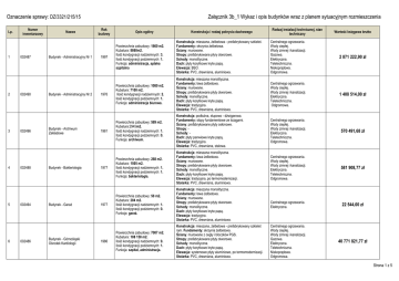 Oznaczenie sprawy: DZ/3321/215/15 Lp. 1 2 3 4 5 6 Numer inwentarzowy 002487 002490 002496 002488 002494 002486 Nazwa Budynek - Administracyjny Nr 1 Budynek - Administracyjny Nr 2 Budynek - Archiwum Zakładowe Budynek - Bakteriologia Budynek - Garaż Budynek - Górnośląski Ośrodek Kardiologii Załącznik 3b_1 Wykaz i opis budynków wraz z planem sytuacyjnym rozmieszczenia Rok budowy Opis ogólny Konstrukcja i rodzaj pokrycia dachowego Rodzaj instalacji technicznej, stan techniczny Wartość księgowa brutto Powierzchnia zabudowy: 1860 m2. Kubatura: 8860m2. Ilość kondygnacji nadziemnych: 3. Ilość kondygnacji podziemnych: 1. Funkcja: administracja, apteka szpitalna Konstrukcja: mieszana, żelbetowa - prefabrykowany szkielet. Fundamenty: skrzynia żelbetowa. Ściany: murowane. Stropy: prefabrykowane płyry otworowe. Schody: monolityczne. Dach: płyty korytkowe kryte papą. Elewacja: BSO. Stolarka: PVC, drewniana, aluminiowa. Centralnego ogrzewania. Wody ciepłej. Wody zimnej i kanalizacji. Gazowa. Elektryczna. Teletechniczna. Niskoprądowa. Odgromowa. 2 871 222,90 zł 1976 Powierzchnia zabudowy: 1080 m2. Kubatura: 7100 m2. Ilość kondygnacji nadziemnych: 2. Ilość kondygnacji podziemnych: 1. Funkcja: administracja biurowa. Konstrukcja: mieszana monolityczna. Fundamenty: ława żelbetowa. Ściany: murowane. Stropy: prefabrykowane płyty otworowe. Schody: monolityczne. Dach: płyty korytkowe kryte papą. Elewacja: tradycyjna. Stolarka: PVC, drewniana, aluminiowa. Centralnego ogrzewania. Wody ciepłej. Wody zimnej i kanalizacji. Elektryczna. Teletechniczna. Odgromowa. 1 408 514,00 zł 1981 Powierzchnia zabudowy: 589 m2. Kubatura:2945m2. Ilość kondygnacji nadziemnych: 1. Ilość kondygnacji podziemnych: 0. Funkcja: archiwum. Konstrukcja: podłużna, słupowo - dźwigarowa. Fundamenty: stopy fundamentowe ze ściągami. Ściany: prefabrykowane płyty osłonowe. Stropy: Schody: Dach: płyty panwiowe kryte papą. Elewacja: tradycyjna. Stolarka: PVC, drewniana, stalowa. Centralnego ogrzewania. Wody ciepłej. Wody zimnej i kanalizacji. Elektryczna. Teletechniczna. Odgromowa. 570 491,68 zł 1977 Powierzchnia zabudowy: 268 m2. Kubatura: 1505 m2. Ilość kondygnacji nadziemnych: 1. Ilość kondygnacji podziemnych: 1. Funkcja: bakteriologia. Konstrukcja: mieszana monolityczna. Fundamenty: ława żelbetowa. Ściany: murowane. Stropy: prefabrykowane płyty otworowe. Schody: monolityczne. Dach: płyty korytkowe kryte papą. Elewacja: tradycyjna, po termomodernizacji. Stolarka: PVC, drewniana, aluminiowa. Centralnego ogrzewania. Wody ciepłej. Wody zimnej i kanalizacji. Elektryczna. Teletechniczna. Odgromowa. 581 908,77 zł 1977 Powierzchnia zabudowy: 58 m2. Kubatura: 204 m2. Ilość kondygnacji nadziemnych: 1. Ilość kondygnacji podziemnych: 0. Funkcja: garaż. Konstrukcja: mieszana monolityczna. Fundamenty: ława żelbetowa. Ściany: murowane. Stropy: prefabrykowane płyty otworowe. Schody: monolityczne. Dach: płyty korytkowe kryte papą. Elewacja: tradycyjna. Stolarka: PVC, drewniana, aluminiowa. Centralnego ogrzewania. Elektryczna. 22 544,00 zł 1986 Powierzchnia zabudowy: 7007 m2. Kubatura: 108 150 m2. Ilość kondygnacji nadziemnych: 9. Ilość kondygnacji podziemnych: 1. Funkcja: szpital, administracja. Konstrukcja: mieszana, żelbetowa - prefabrykowany szkielet ram. Fundamenty: skrzynia żelbetowa. Ściany: murowane z cegły i bloczków PGS. Stropy: prefabrykowane płyty otworowe. Schody: monolityczne. Dach: płyty korytkowe kryte papą. Elewacja: systemowe płyty aluminiowe, po termomodernizacji. Stolarka: PVC, drewniana, aluminiowa. Centralnego ogrzewania. Wody ciepłej. Wody zimnej i kanalizacji. Gazowa. Elektryczna. Teletechniczna. Niskoprądowa. Odgromowa. 40 771 821,77 zł 1997 Strona 1 z 5 Lp. 7 8 9 10 11 12 Numer inwentarzowy 002500 002482 002493 002491 002497 002489 Nazwa Budynek - Hotel Budynek - Hydroforownia Budynek - Kotłownia Budynek - Kuchnia Budynek - Magazyn mater. łatwopalnych Budynek - Patomorfologia Rok budowy Opis ogólny Konstrukcja i rodzaj pokrycia dachowego Rodzaj instalacji technicznej, stan techniczny Wartość księgowa brutto Powierzchnia zabudowy: 7053 m2. Kubatura: 26 936 m2. Ilość kondygnacji nadziemnych: 9. Ilość kondygnacji podziemnych: 1. Funkcja: hotel. Konstrukcja: mieszana, żelbetowa i murowana. Fundamenty: skrzynia żelbetowa. Ściany: prefabrykowane - wielka płyta. Stropy: prefabrykowane płyty otworowe. Schody: monolityczne. Dach: płyty panwiowe kryte papą. Elewacja: tradycyjna, frag. z płyt trapezowych. Stolarka: PVC, drewniana, aluminiowa. Centralnego ogrzewania. Wody ciepłej. Wody zimnej i kanalizacji. Elektryczna. Teletechniczna. Niskoprądowa. Odgromowa. 4 490 203,60 zł 1977 Powierzchnia zabudowy: 148 m2. Kubatura: 2810 m2. Ilość kondygnacji nadziemnych: 1. Ilość kondygnacji podziemnych: 0. Funkcja: hydroforownia. Konstrukcja: mieszana żelbetowa i murowana. Fundamenty: ława żelbetowa. Ściany: murowane. Stropy: . Schody: Dach: płyty panwiowe kryte papą. Elewacja: tradycyjna. Stolarka: stalowa. Centralnego ogrzewania. Wody zimnej i kanalizacji. Elektryczna. Teletechniczna. Odgromowa. 144 092,34 zł 1978 Powierzchnia zabudowy: 1166 m2. Kubatura: 5025 m2. Ilość kondygnacji nadziemnych: 4. Ilość kondygnacji podziemnych: 0. Funkcja: kotłownia. Konstrukcja: mieszana żelbetowa i murowana. Fundamenty: ława żelbetowa. Ściany: prefabrykowane i tradycyjne. Stropy: monolityczne żelbetowe. Schody: monolityczne. Dach: płyty panwiowe kryte papą. Elewacja: tradycyjna. Stolarka: PVC, drewniana, aluminiowa. Centralnego ogrzewania. Wody ciepłej. Wody zimnej i kanalizacji. Gazowa. Elektryczna. Teletechniczna. Odgromowa. 1 377 591,23 zł Powierzchnia zabudowy: 2021 m2. Kubatura: 14 069 m2. Ilość kondygnacji nadziemnych: 1. Ilość kondygnacji podziemnych: 1. Funkcja: kuchnia. Konstrukcja: mieszana słupowo - ryglowa. Fundamenty: ława żelbetowa. Ściany: prefabrykowane i tradycyjne. Stropy: monolityczne żelbetowe. Schody: mon