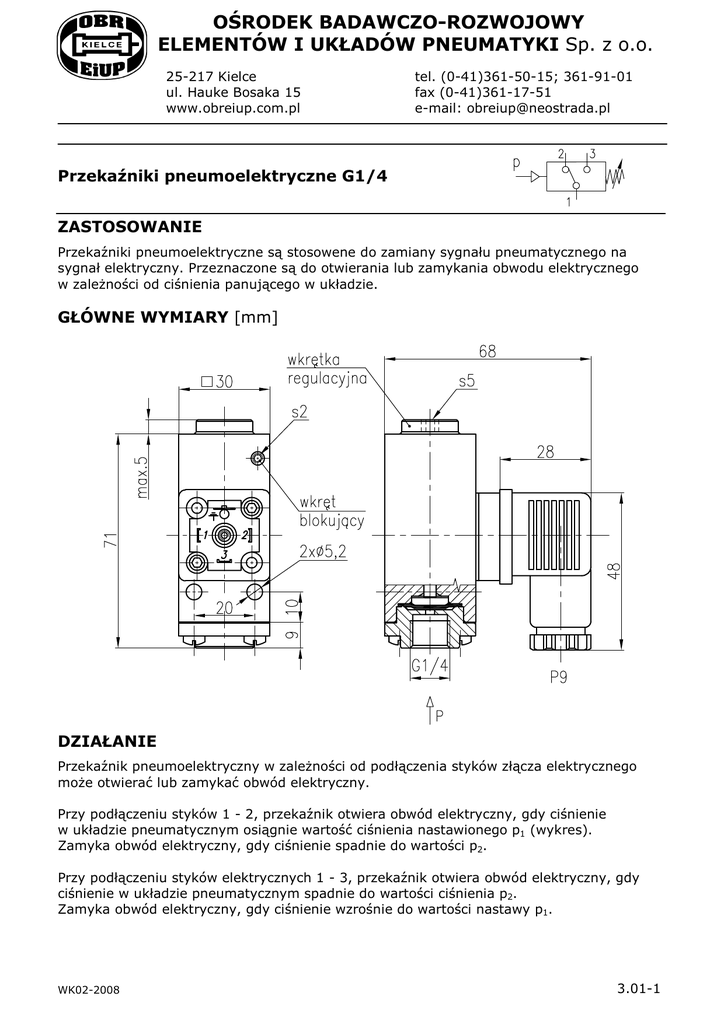 OŚRODEK BADAWCZO-ROZWOJOWY ELEMENTÓW I UKŁADÓW PNEUMATYKI Sp. z o.o. 25-217 Kielce ul. Hauke Bosaka 15 www.obreiup.com.pl tel. (0-41)361-50-15; 361-91-01 fax (0-41)361-17-51 e-mail: [email protected] Przekaźniki pneumoelektryczne G1/4 ZASTOSOWANIE Przekaźniki pneumoelektryczne są stosowene do zamiany sygnału pneumatycznego na sygnał elektryczny. Przeznaczone są do otwierania lub zamykania obwodu elektrycznego w zaleŜności od ciśnienia panującego w układzie. GŁÓWNE WYMIARY [mm] DZIAŁANIE Przekaźnik pneumoelektryczny w zaleŜności od podłączenia styków złącza elektrycznego moŜe otwierać lub zamykać obwód elektryczny. Przy podłączeniu styków 1 - 2, przekaźnik otwiera obwód elektryczny, gdy ciśnienie w układzie pneumatycznym osiągnie wartość ciśnienia nastawionego p1 (wykres). Zamyka obwód elektryczny, gdy ciśnienie spadnie do wartości p2. Przy podłączeniu styków elektrycznych 1 - 3, przekaźnik otwiera obwód elektryczny, gdy ciśnienie w układzie pneumatycznym spadnie do wartości ciśnienia p2. Zamyka obwód elektryczny, gdy ciśnienie wzrośnie do wartości nastawy p1. WK02-2008 3.01-1 Przekaźniki pneumoelektryczne G1/4 OBREiUP Kielce NASTAWA Wielkość ciśnienia przełączania p nastawia się pokręcając wkrętką regulacyjną, którą przed samoczynną zmianą nastawy zabezpiecza się wkrętem blokującym. MATERIAŁY Korpus, docisk Wkrętka Membrana - stop Al mosiądz silikon, poliuretan DANE TECHNICZNE spręŜone powietrze, filtrowane lub inne gazy o podobnych właściwościach. Czynnik roboczy Przyłącze pneumatyczne G1/4 Maksymalne ciśnienie wejściowe 1,6 MPa Zakres ciśnień nastawy 0,02 ÷ 0,2 MPa 0,05 ÷ 0,8 MPa Zakres temperatur pracy 0,2 ÷ 1,2 MPa -20 ÷ +65 ºC Pozycja pracy dowolna RóŜnica ciśnień załączania i wyłączania wg wykresu Powtarzalność punktu przełączania ±3% Częstotliwość przełączania 60 cykli/min Rodzaj prądu zasilającego stały, przemienny Przyłącze dla kabla elektrycznego P9 (dla kabli max. ø6,5) Stopień zabezpieczenia elektrycznego IP 65 Parametry prądu elektrycznego wg tabeli Masa 0,21 kg Numer zamówieniowy przekaźnika 971.000.031 971.000.032 971.000.033 Parametry prądu elektrycznego 3.01-2 Maksymalne obciąŜenie prądowe [A] Napięcie znamionowe [V] Rezystancyjne (cosϕ = 1) Indukcyjne (cosϕ = 0,6-0,7) 125 AC 250 AC 30 DC 125 DC 5,0 5,0 5,0 0,4 3,0 3,0 3,0 0,05 Przekaźniki pneumoelektryczne G1/4 OBREiUP Kielce RóŜnica ciśnień załączenia i wyłączenia przekaźników 971.000.031 971.000.032 971.000.033 p1 – górne ciśnienie przełączania przy wzroście ciśnienia, p2 – dolne ciśnienie przełączania przy spadku ciśnienia, x – histereza (maksymalna róŜnica ciśnień włączania i wyłączania). SPOSÓB ZAMAWIANIA W zamówieniu naleŜy podać nazwę i numer zamówieniowy przekaźnika, np.: Przekaźnik pneumoelektryczny G1/4, 971.000.031 3.01-3 OŚRODEK BADAWCZO-ROZWOJOWY ELEMENTÓW I UKŁADÓW PNEUMATYKI Sp. z o.o. 25-217 Kielce ul. Hauke Bosaka 15 www.obreiup.com.pl tel. (0-41)361-50-15; 361-91-01 fax (0-41)361-17-51 e-mail: [email protected] Przekaźnik pneumoelektryczny G1/4 p=0,015 ÷ 0,2 MPa ZASTOSOWANIE Przekaźniki pneumoelektryczne są stosowene do zamiany sygnału pneumatycznego na sygnał elektryczny. Przeznaczone są do otwierania lub zamykania obwodu elektrycznego w zaleŜności od ciśnienia panującego w układzie. GŁÓWNE WYMIARY [mm] DZIAŁANIE Przekaźnik pneumoelektryczny w zaleŜności od podłączenia styków złącza elektrycznego moŜe otwierać lub zamykać obwód elektryczny. Przy podłączeniu styków 1 - 2, przekaźnik otwiera obwód elektryczny, gdy ciśnienie w układzie pneumatycznym osiągnie wartość ciśnienia nastawionego p1 (wykres). Zamyka obwód elektryczny, gdy ciśnienie spadnie do wartości p2. Przy podłączeniu styków elektrycznych 1 - 3, przekaźnik otwiera obwód elektryczny, gdy ciśnienie w układzie pneumatycznym spadnie do wartości ciśnienia p2. Zamyka obwód elektryczny, gdy ciśnienie wzrośnie do wartości nastawy p1. WK02-2008 3.01-5 Przekaźnik pneumoelektryczny G1/4 OBREiUP Kielce NASTAWA Wielkość ciśnienia przełączania p nastawia się pokręcając wkrętką regulacyjną, którą przed samoczynną zmianą nastawy zabezpiecza się wkrętem blokującym. MATERIAŁY Korpus, docisk Wkrętka Membrana - stop Al mosiądz silikon DANE TECHNICZNE spręŜone powietrze, filtrowane lub inne gazy o podobnych właściwościach. Czynnik roboczy Przyłącze pneumatyczne G1/4 Maksymalne ciśnienie wejściowe 1 MPa Zakres ciśnień nastawy 0,015 ÷ 0,2 MPa Zakres temperatur pracy -20 ÷ +80 ºC Pozycja pracy dowolna RóŜnica ciśnień załączania i wyłączania 0,005 MPa Powtarzalność punktu przełączania ±3% Częstotliwość przełączania 30 cykli/min Rodzaj prądu zasilającego stały, przemienny Przyłącze dla kabla elektrycznego P9 (dla kabli max. ø6,5) Stopień zabezpieczenia elektrycznego IP 65 Parametry prądu elektrycznego wg tabeli Masa 0,55 kg Numer zamówieniowy przekaźnika 971.000.028 Parametry prądu elektrycznego Maksymalne obciąŜenie prądowe [A] Napięcie znamionowe [V] Rezystancyjne (cosϕ = 1) Indukcyjne (cosϕ = 0,6-0,7) 125 AC 250 AC 30 DC 125 DC 5,0 5,0 5,0 0,4 3,0 3,0 3,0 0,05 SPOSÓB ZAMAWIANIA W zamówieniu naleŜy podać nazwę i numer zamówieniowy przekaźnika: Przekaźnik pneumoelektryczny G1/4, 971.000.028 3.01-6 OŚRODEK BADAWCZO-ROZWOJOWY ELEMENTÓW I UKŁADÓW PNEUMATYKI Sp. z o.o. 25-217 Kielce ul. Hauke Bosaka 15 www.obreiup.com.pl tel. (0-41)361-50-15; 361-91-01 fax (0-41)361-17-51 e-mail: [email protected] Przekaźnik pneumoelektryczny do bloku przygotowania powietrza G1/4 ZASTOSOWANIE Przekaźniki pneumoelektryczne są stosowene do zamiany sygnału pneumatycznego na sygnał elektryczny. Przeznaczone są do otwierania lub zamykania obwodu elektrycznego w zaleŜności od ciśnienia panującego w układzie. GŁÓWNE WYMIARY [mm] DZIAŁANIE Przekaźnik pneumoelektryczny w z