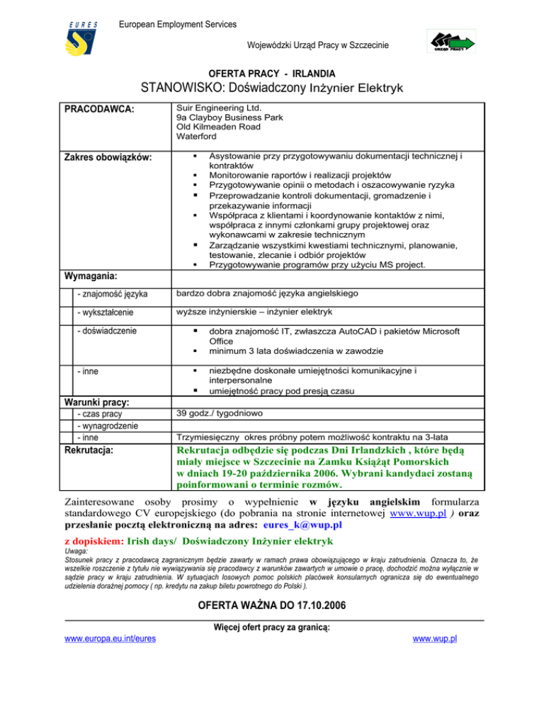 European Employment Services Wojewódzki Urząd Pracy w Szczecinie OFERTA PRACY - IRLANDIA STANOWISKO: Doświadczony Inżynier Elektryk PRACODAWCA: Zakres obowiązków: Suir Engineering Ltd. 9a Clayboy Business Park Old Kilmeaden Road Waterford Asystowanie przy przygotowywaniu dokumentacji technicznej i kontraktów Monitorowanie raportów i realizacji projektów Przygotowywanie opinii o metodach i oszacowywanie ryzyka Przeprowadzanie kontroli dokumentacji, gromadzenie i przekazywanie informacji Współpraca z klientami i koordynowanie kontaktów z nimi, współpraca z innymi członkami grupy projektowej oraz wykonawcami w zakresie technicznym Zarządzanie wszystkimi kwestiami technicznymi, planowanie, testowanie, zlecanie i odbiór projektów Przygotowywanie programów przy użyciu MS project. Wymagania: - znajomość języka bardzo dobra znajomość języka angielskiego - wykształcenie wyższe inżynierskie – inżynier elektryk - doświadczenie - inne dobra znajomość IT, zwłaszcza AutoCAD i pakietów Microsoft Office minimum 3 lata doświadczenia w zawodzie niezbędne doskonałe umiejętności komunikacyjne i interpersonalne umiejętność pracy pod presją czasu Warunki pracy: - czas pracy - wynagrodzenie - inne Rekrutacja: 39 godz./ tygodniowo Trzymiesięczny okres próbny potem możliwość kontraktu na 3-lata Rekrutacja odbędzie się podczas Dni Irlandzkich , które będą miały miejsce w Szczecinie na Zamku Książąt Pomorskich w dniach 19-20 października 2006. Wybrani kandydaci zostaną poinformowani o terminie rozmów. Zainteresowane osoby prosimy o wypełnienie w języku angielskim formularza standardowego CV europejskiego (do pobrania na stronie internetowej www.wup.pl ) oraz przesłanie pocztą elektroniczną na adres: [email protected] z dopiskiem: Irish days/ Doświadczony Inżynier elektryk Uwaga: Stosunek pracy z pracodawcą zagranicznym będzie zawarty w ramach prawa obowiązującego w kraju zatrudnienia. Oznacza to, że wszelkie roszczenie z tytułu nie wywiązywania się pracodawcy z warunków zawartych w umowie o pracę, dochodzić można wyłącznie w sądzie pracy w kraju zatrudnienia. W sytuacjach losowych pomoc polskich placówek konsularnych ogranicza się do ewentualnego udzielenia doraźnej pomocy ( np. kredytu na zakup biletu powrotnego do Polski ). OFERTA WAŻNA DO 17.10.2006 Więcej ofert pracy za granicą: www.europa.eu.int/eures www.wup.pl