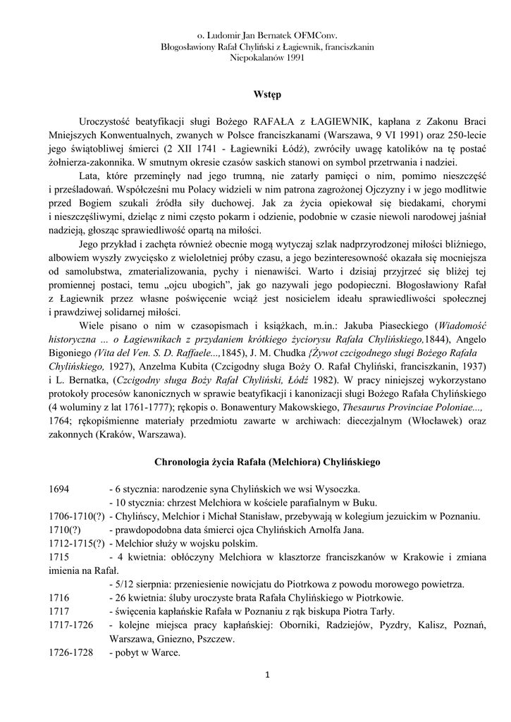 i L. Bernatka, (Czcigodny sługa Boży Rafał Chyliński, Łódź 1982). W pracy niniejszej wykorzystano