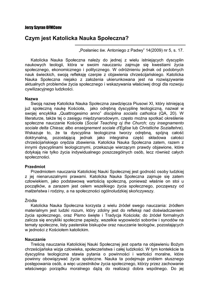Jerzy Szyran OFMConv Czym jest Katolicka Nauka Społeczna? „Posłaniec św. Antoniego z Padwy” 14(2009) nr 5, s. 17. Katolicka Nauka Społeczna należy do jednej z wielu istniejących dyscyplin naukowych teologii, która w swoim nauczaniu zajmuje się kwestiami życia społecznego, ekonomicznego i politycznego. W odróżnieniu jednak od podobnych nauk świeckich, swoją refleksję czerpie z objawienia chrześcijańskiego. Katolicka Nauka Społeczna niejako z założenia ukierunkowana jest na rozwiązywanie aktualnych problemów życia społecznego i wskazywania właściwej drogi dla rozwoju cywilizacyjnego ludzkości. Nazwa Swoją nazwę Katolicka Nauka Społeczna zawdzięcza Piusowi XI, który istniejącą już społeczną naukę Kościoła, jako odrębną dyscyplinę teologiczną, nazwał w swojej encyklika „Quattrogesimo anno” disciplina socialis catholica (QA, 20). W literaturze, także tej o zasięgu międzynarodowym, często można spotkać określenie społeczne nauczanie Kościoła (Social Teaching oj the Church; czy insegnamento sociale delta Chiesa; albo enseignement sociale d'Eglise lub Christliche Sozialtehre). Wskazuje to, że ta dyscyplina teologiczna tworzy odrębną, spójną całość doktrynalną, pozostającą jednak jako integralna część składowa całości chrześcijańskiego orędzia zbawienia. Katolicka Nauka Społeczna zatem, razem z innymi dyscyplinami teologicznymi, przekazuje wierzącym prawdy objawione, które dotykają nie tylko życia indywidualnego poszczególnych osób, lecz również całych społeczności. Przedmiot Przedmiotem nauczania Katolickiej Nauki Społecznej jest godność osoby ludzkiej z jej nienaruszalnymi prawami. Katolicka Nauka Społeczna zajmuje się zatem człowiekiem, jako podstawową wartością społeczną, ponieważ właśnie on stoi u początków, a zarazem jest celem wszelkiego życia społecznego, począwszy od małżeństwa i rodziny, a na społeczności ogólnoludzkiej skończywszy. Źródła Katolicka Nauka Społeczna korzysta z wielu źródeł swego nauczania: źródłem materialnym jest ludzki rozum, który zdolny jest do refleksji nad doświadczeniem życia społecznego, oraz Pismo święte i Tradycja Kościoła; do źródeł formalnych zalicza się encykliki społeczne papieży, wszelkie wypowiedzi soborów i synodów na tematy społeczne, listy pasterskie biskupów oraz nauczanie teologów, pozostających w jedności z Kościołem katolickim. Nauczanie Treścią nauczania Katolickiej Nauki Społecznej jest oparta na objawieniu Bożym chrześcijańska wizja człowieka, społeczeństwa i całej ludzkości. W tym kontekście ta dyscyplina teologiczna stawia pytania o powinności i wartości moralne, które powinny obowiązywać życie społeczne. Nauka ta podejmuje problem słusznego postępowania osób, a więc uczestników życia społecznego, którzy przez zachowanie właściwego porządku moralnego dążą do realizacji dobra wspólnego. Do jej szczególnych zainteresowań należy ład gospodarczo-polityczny oraz instytucje i systemy społeczne. Katolicka Nauka Społeczna poszukując odpowiedzi na stawiane pytania etyczne wyrosłe na gruncie doświadczania problemów i zagrożeń społecznych, przeprowadza opis i analizę rzeczywistości społecznej, posiłkując się naukami socjologicznymi, psychologicznymi, ekonomicznymi, politologią oraz prawno-historycznymi, by następnie ocenić ją w świetle właściwych sobie źródeł i wskazać na właściwe środki do rozwiązania danej kwestii. Nauczanie społeczne Kościoła przyjmuje istnienie obiektywnych powinności i wartości, które są wpisane w naturę człowieka, oraz przekonanie, że odniesienie do Boga określa działania człowieka i charakter struktur społecznych. Na tej bazie Katolicka Nauka Społeczna podaje zasady społeczne: personalizm; dobro wspólne; solidarność; pomocniczość; prawda; sprawiedliwość; miłość; wolność. Zasady te są podstawowymi kryteriami właściwego funkcjonowania każdego społeczeństwa. Sens Katolickiej Nauki Społecznej Współczesny Kościół zatroskany o zbawienie człowieka, podejmuje w swoim nauczaniu wszystkie elementy ludzkiego życia, które dotykają ludzkiej egzystencji. Dotyczy to również doktryny społecznej, która w ostatnich latach odczuwa poważny kryzys na polu rodziny, pracy czy stosunków międzynarodowych, targanych raz po raz wojnami i konfliktami. Wszystkie te dziedziny życia społecznego, którego podstawową jednostką jest człowiek stanowią troskę i refleksję Kościoła katolickiego, który proponuje im normy, oceny i wytyczne działania (por. SRS, 41). Nauczanie Kościoła zmierza do ukazania prawdy, sprawiedliwości i miłości w życiu społecznym oraz zabiega o prawdziwy postęp człowieka i społeczeństwa (por. LE, 1). Stąd Kościół dotyka kwestii społecznych i w kontekście ewangelicznego przesłania mówi o „Ewangelii życia" [EV 2], „Ewangelii pracy" [LE 6; 25] czy ,,Ewangelii miłosierdzia" [DM 3). Nauczanie społeczne Kościoła dąży do wcielenie w życie społeczne uniwersalnych wartości: pokoju, solidarności, sprawiedliwości i wolności, które znajdują swoje urzeczywistnienie w Chrystusie i są odpowiedzią na globalny kryzys cywilizacji (por. TMA, 52). Prawdziwy zatem sens Katolickiej Nauki Społecznej zawiera się w dążeniu, by człowiek dla człowieka był bratem w Chrystusie albo przynajmniej kierował się w relacjach z nim zasadami prawdy i sprawiedliwości.