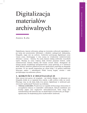 113 J o an n a Ł u b a Digitalizacja, inaczej cyfryzacja, polega na tworzeniu cyfrowych reprodukcji, a jej istotą jest przenoszenie informacji z obiektów analogowych (dokumenty, fotografie, mapy etc) na cyfrowe. Archiwiści poświęcają digitalizacji coraz więcej czasu, dostrzegając w niej szansę na zwiększenie zainteresowania zbiorami i szerzej – historią. Na szybę skanera trafiają archiwalia wszystkich typów. Skanują na coraz większą skalę również pasjonaci historii, osoby zainteresowane historią lokalną lub losami swoich rodzin. Dostępność do taniego sprzętu, bezpłatnego oprogramowania i pasja sprawiają, że w internecie obok zbiorów archiwów państwowych oraz społecznych, pojawiają się fotografie prywatne. W ten sposób rozproszone po całym kraju i za granicą archiwalia dotyczące makro- i mikrohistorii Polski tworzą bogate, otwarte i stale powiększające się archiwum cyfrowe. 1. KORZYŚCI Z DIGITALIZAC JI Skan zawsze jest gorszy od oryginału – już choćby dlatego, że dokument czy fotografia działa na co najmniej dwa zmysły, a plik cyfrowy tylko na wzrok. Dlaczego więc na tak dużą skalę trwa proces digitalizacji w archiwach państwowych i społecznych? Korzyści są ewidentne. » Ochrona archiwaliów. Po pierwsze na wypadek ich fizycznego zniszczenia (w szczególności dotyczy to materiałów archiwalnych, których nośnikiem jest kwaśny papier oraz negatywów nitrocelulozowych, które mogą ulec samodestrukcji) lub utracenia (np. na skutek klęsk żywiołowych), po drugie – ograniczamy ich eksploatację przez użytkowników archiwum. digitalizacja materiałów archiwalnych Digitalizacja materiałów archiwalnych 114 » Poszerzenie dostępu do materiałów archiwalnych. Dzięki dostępności archiwaliów w przestrzeni internetowej znikają ograniczenia terytorialne (przykładem może być projekt „Elektroniczne łączenie spuścizn”, którego efektem ma być wspólna, internetowa prezentacja zbiorów Instytutu Piłsudskiego w Ameryce i Archiwum Akt Nowych dotyczących Ignacego Paderewskiego, Władysława Sikorskiego i Ignacego Mościckiego). Poszerza się również grono użytkowników – dzięki internetowi do archiwaliów sięgają osoby, które nigdy nie przekroczyłyby progu archiwum. Idąc dalej, digitalizacja ułatwia również badania naukowe i wspiera działania edukacyjne (pliki cyfrowe są łatwiejsze do dydaktycznego wykorzystania). » Integracja społeczności. To cel digitalizacji szczególnie ważny dla archiwów społecznych. Przykładem może być wystawa Ludzie od Schmitzlera: mieszkańcy przedwojennego Śniatynia, eksponowana w 2012 w Domu Spotkań z Historią w Warszawie. Materiały do niej były gromadzone przede wszystkim dzięki wykorzystywaniu internetowych portali społecznościowych i genealogicznych. Wydaje się, że dzięki korzystaniu z takich form komunikacji i gromadzenia zbiorów cyfrowych można odbudować wiele spalonych lub wywiezionych archiwów polskich miast. » Ułatwienie pracy archiwisty i badacza. Zeskanowane w dużej rozdzielczości zdjęcie można powiększać i dzięki temu łatwiej je zidentyfikować. Dziś nie trzeba już nikogo przekonywać do celowości digitalizacji. Nikt już nie pyta, czy digitalizować. Pojawiają się natomiast pytania, jak robić to profesjonalnie. Tu z odsieczą przychodzą archiwiści państwowi i pracownicy instytucji kultury specjalizujący się w digitalizacji. Najważniejszym źródłem informacji o cyfryzacji jest Katalog Dobrych Praktyk Digitalizacji Materiałów Archiwalnych (http://www.nina.gov.pl/docs/instytut /katalog-dobrychpraktyk-digitalizacji-materia%C5%82%C3%B3w-archiwalnych.pdf ). Rzetelnym kompendium wiedzy jest również dostępny on-line (http://www.bn.org.pl/ download/document/1342175805.pdf ) pierwszy polski podręcznik digitalizacji obiektów piśmienniczych Digitalizacja piśmiennictwa pod redakcją Dariusza Parandowskiego (Warszawa 2010). 2. CZYM DIGITALIZOWAĆ? Wybór sprzętu najczęściej zależy od dwóch czynników: rodzaju skanowanego materiału i – częściej – możliwości finansowych. Najtańsze i najpowszechniejsze są skanery płaskie, w których umieszczany na szybie obiekt jest przykrywany pokrywą. Są wśród nich takie, które skanują również materiały transparentne czyli negatywy i slajdy. Znacznie droższe są skanery planetarne, w których jednostka skanująca położona jest około metra nad specjalistycznym stołem, na którym układany jest digitalizowany obiekt. Używa się ich zwłaszcza do skanowania zbiorów bibliotecznych oraz archiwaliów o dużych formatach. Na rynku bywają również dostępne skanery przelotowe (pojedynczy arkusz jest przesuwany przez szczelinę we wnętrzu 115 3. CO DIGITALIZOWAĆ? Wiele archiwów utożsamiając digitalizację z zabezpieczaniem zbiorów przed fizycznym zniszczeniem, skanuje wszystkie swoje materiały (digitalizacja masowa). Jeśli jednak digitalizacja jest selektywna, trzeba sobie jasno wyznaczyć kryteria dokonywania takiej selekcji. Można wartościować archiwalia poprzez ich znaczenie dla kultury i historii, stan zachowania, unikatowość, wartość edukacyjną oraz wartość naukową. Z digitalizacji powinny być wyłączone dublety. W przypadku digitalizacji masowej, gdy archiwum nie ma odpowiedniej infrastruktury, łatwiej zlecić skanowanie zewnętrznej firmie (tzw. outsourcing). Czasem jest to rozwiązanie tańsze niż zakup skanera i przeszkolenie pracowników. 4. W JAKI SPOSÓB DIGITALIZOWAĆ? » Przygotowanie sprzętu. Przed skanowaniem należy zadbać o sprzęt – skaner powinien być ustawiony w miejscu nienarażonym na wstrząsy, w pomieszczeniu o stałej wilgotności i temperaturze bez obecności pyłów. Szybę skanera należy przecierać niepylącym materiałem. » Sprawdzenie obiektów. Materiały przeznaczone do skanowania powinny być sprawdzone pod względem ich kompletności oraz stanu zachowania. Należy wyjąć z nich materiały mogą
