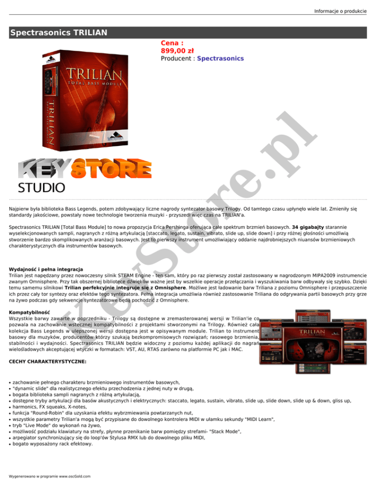 Informacje o produkcie Spectrasonics TRILIAN Cena : 899,00 zł or e. pl Producent : Spectrasonics Najpierw była biblioteka Bass Legends, potem zdobywający liczne nagrody syntezator basowy Trilogy. Od tamtego czasu upłynęło wiele lat. Zmieniły się standardy jakościowe, powstały nowe technologie tworzenia muzyki - przyszedł więc czas na TRILIAN'a. St Spectrasonics TRILIAN [Total Bass Module] to nowa propozycja Erica Pershinga oferująca całe spektrum brzmień basowych. 34 gigabajty starannie wyselekcjonowanych sampli, nagranych z różną artykulacją [staccato, legato, sustain, vibrato, slide up, slide down] i przy różnej głośności umożliwią stworzenie bardzo skomplikowanych aranżacji basowych. Jest to pierwszy instrument umożliwiający oddanie najdrobniejszych niuansów brzmieniowych charakterystycznych dla instrumentów basowych. ey Wydajność i pełna integracja Trilian jest napędzany przez nowoczesny silnik STEAM Engine - ten sam, który po raz pierwszy został zastosowany w nagrodzonym MIPA2009 instrumencie zwanym Omnisphere. Przy tak obszernej bibliotece dźwięków ważne jest by wszelkie operacje przełączania i wyszukiwania barw odbywały się szybko. Dzięki temu samemu silnikowi Trilian perfekcyjnie integruje się z Omnisphere. Możliwe jest ładowanie barw Triliana z poziomu Omnisphere i przepuszczenie ich przez cały tor syntezy oraz efektów tego syntezatora. Pełna integracja umożliwia również zastosowanie Triliana do odgrywania partii basowych przy grze na żywo podczas gdy sekwencje syntezatorowe będą pochodzić z Omnisphere. K Kompatybilność Wszystkie barwy zawarte w poprzedniku - Trilogy są dostępne w zremasterowanej wersji w Trilian'ie co pozwala na zachowanie wstecznej kompatybilności z projektami stworzonymi na Trilogy. Również cała kolekcja Bass Legends w ulepszonej wersji dostępna jest w opisywanym module. Trilian to instrument basowy dla muzyków, producentów którzy szukają bezkompromisowych rozwiązań; rasowego brzmienia, stabilności i wydajności. Spectrasonics TRILIAN będzie widoczny z poziomu każdej aplikacji do nagrań wielośladowych akceptującej wtyczki w formatach: VST, AU, RTAS zarówno na platformie PC jak i MAC. CECHY CHARAKTERYSTYCZNE: ● ● ● ● ● ● ● ● ● ● ● zachowanie pełnego charakteru brzmieniowego instrumentów basowych, "dynamic slide" dla realistycznego efektu przechodzenia z jednej nuty w drugą, bogata biblioteka sampli nagranych z różną artykulacją, dostępne tryby artykulacji dla basów akustycznych i elektrycznych: staccato, legato, sustain, vibrato, slide up, slide down, slide up & down, gliss up, harmonics, FX squeaks, X-notes, funkcja "Round-Robin" dla uzyskania efektu wybrzmiewania powtarzanych nut, wszystkie parametry Trilian'a mogą być przypisane do dowolnego kontrolera MIDI w ułamku sekundy "MIDI Learn", tryb "Live Mode" do wykonań na żywo, możliwość podziału klawiatury na strefy, płynne przenikanie barw pomiędzy strefami- "Stack Mode", arpegiator synchronizujący się do loop'ów Stylusa RMX lub do dowolnego pliku MIDI, bogato wyposażony rack efektowy. Wygenerowano w programie www.oscGold.com ● ● ● ● ● ● ● or e. pl BIBLIOTEKA INSTRUMENTU TRILIAN: 34 gigabajty precyzyjnie nagranych sampli [10 razy więcej niż w Trilogy], ponad 60 elektrycznych basów "Electric Bass", gitary 4,5,6 i 8 strunowe, 6 basistów, wszystkie techniki gry charakterystyczne dla basistów: Fingered, Picked, Fretless, Slapped, Tapped, Muted, basy akustyczne nagrane w wielu wariantach artykulacji [ponad 21000 sampli], ogromna biblioteka barw syntezatorowych: Novation™ Bass Station, Yamaha® CS-80, Cwejman™ Modular, Moog Minimoog™, Little Phatty™, Voyager™, Taurus™ Pedals, Korg MS-20, Oberheim, ARP 2600, Roland Juno 60/106, Waldorf Pulse™, DSI Mopho™ & Tetra™, Roland TB-303, SH-101, Metasonix KV-100 Assblaster, SE-1, Omega. ATC-1 i wiele innych; zremasterowana biblioteka Spectrasonics Trilogy, zremasterowana biblioteka Bass Legends, cały potencjał zawartych sampli scalają specjalnie zaprojektowane algorytmy syntezy: Juicy Filter oraz Power Filter. ❍ ❍ ❍ K ey St Spectrasonics TRILIAN - wirtualny basista, realne brzmienie!