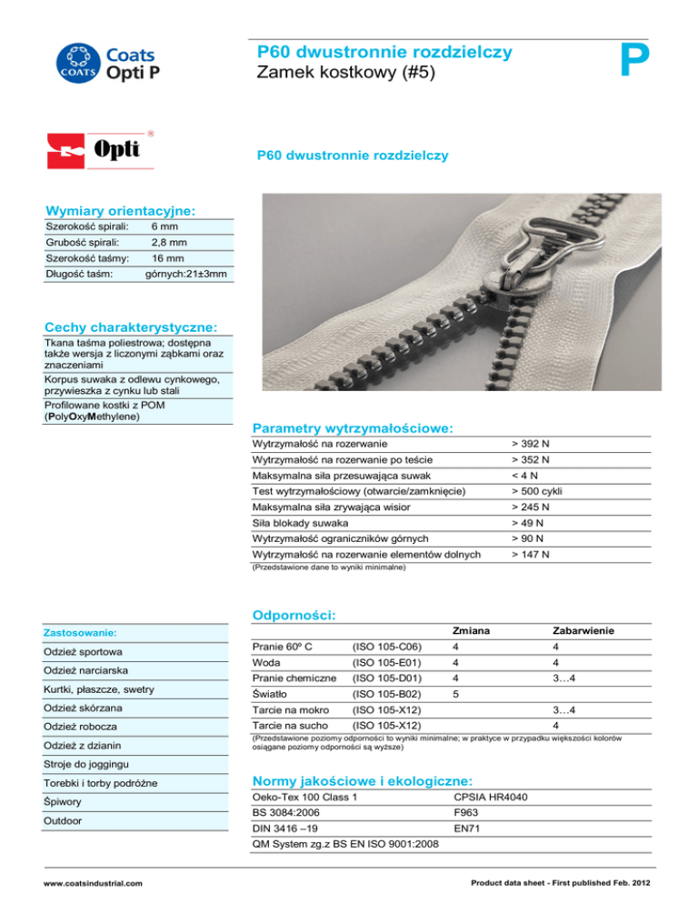 P P60 dwustronnie rozdzielczy Zamek kostkowy (#5) P60 dwustronnie rozdzielczy Wymiary orientacyjne: Szerokość spirali: 6 mm Grubość spirali: 2,8 mm Szerokość taśmy: 16 mm Długość taśm: górnych:21±3mm Cechy charakterystyczne: Tkana taśma poliestrowa; dostępna także wersja z liczonymi ząbkami oraz znaczeniami Korpus suwaka z odlewu cynkowego, przywieszka z cynku lub stali Profilowane kostki z POM (PolyOxyMethylene) Parametry wytrzymałościowe: Wytrzymałość na rozerwanie > 392 N Wytrzymałość na rozerwanie po teście > 352 N Maksymalna siła przesuwająca suwak <4N Test wytrzymałościowy (otwarcie/zamknięcie) > 500 cykli Maksymalna siła zrywająca wisior > 245 N Siła blokady suwaka > 49 N Wytrzymałość ograniczników górnych > 90 N Wytrzymałość na rozerwanie elementów dolnych > 147 N (Przedstawione dane to wyniki minimalne) Odporności: Zastosowanie: Zmiana Zabarwienie Pranie 60º C (ISO 105-C06) 4 4 Woda (ISO 105-E01) 4 4 Pranie chemiczne (ISO 105-D01) 4 3…4 Kurtki, płaszcze, swetry Światło (ISO 105-B02) 5 Odzież skórzana Tarcie na mokro (ISO 105-X12) 3…4 Odzież robocza Tarcie na sucho (ISO 105-X12) 4 Odzież z dzianin (Przedstawione poziomy odporności to wyniki minimalne; w praktyce w przypadku większości kolorów osiągane poziomy odporności są wyższe) Odzież sportowa Odzież narciarska Stroje do joggingu Torebki i torby podróżne Śpiwory Outdoor Normy jakościowe i ekologiczne: Oeko-Tex 100 Class 1 CPSIA HR4040 BS 3084:2006 F963 DIN 3416 –19 EN71 QM System zg.z BS EN ISO 9001:2008 www.coatsindustrial.com Product data sheet - First published Feb. 2012