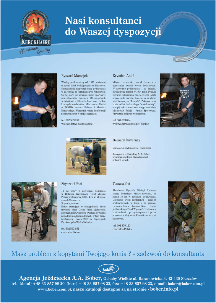 Nasi konsultanci do Waszej dyspozycji Ryszard Mamajek Krystian Anioł Wiedzę podkuwniczą od 1971 zdobywał u kowali koni wyścigowych na Służewcu. Samodzielnie rozpoczął pracę podkuwacza w 1976 roku na Partynicach we Wrocławiu. Od tej pory kuł również konie sportowe: uczestniczki Igrzysk Olimpijskich w Moskwie - Elżbiety Morciniec, kilkukrotnych medalistów Mistrzostw Polski w WKKW Artura Bobera i Marcina Konarskiego. Uczestnik wielu konferencji podkuwniczych w kraju i za granicą. Mistrz kowalski, wnuk kowala – uczestnika dwóch wojen światowych. W zawodzie podkuwacza – od dziecka. Swoją firmę założył w 1994 roku. Pracuje z synem Łukaszem, a drugiego syna Rafała przyucza do zawodu. Kuje m. in. w klubie ujeżdżeniowym “Lewada” Zakrzów oraz konie od lat doskonałego “wukakawisty”, olimpijczyka i sześciokrotnego medalisty Mistrzostw Polski - Artura Społowicza. Prywatnie pasjonat wędkarstwa. tel. 602 589 257 województwo dolnośląskie tel. 604 093 894 województwo opolskie i śląskie Bernard Duvernay szwajcarski wykładowca - podkuwacz dla Agencji Jeździeckiej A. A. Bober prowadzi szkolenia dla najlepszych polskich kowali Zbyszek Ufnal Tomasz Fiet 12 lat pracy w zawodzie. Szkolenia w Holandii, Niemczech. Tytuł Mistrza Polski podkuwaczy 2006, 4-ty w Mistrzostwach Mazowsza. Stajnie sportowe. Konie startujące w dyscyplinach: skoki (również klasy Grand Prix), ujeżdżenie, zaprzęgi, rajdy, western. Obsługa kowalska zawodów międzynarodowych, w tym także Mistrzostw Świata 2007 w Zaprzęgach Parokonnych - Warka Sielanka. Absolwent Wydziału Biologii Uniwersytetu Łódzkiego. Mistrz kowalski, od ponad 10 lat w zawodzie podkuwacza. Uczestnik wielu konferencji i szkoleń podkuwniczych w kraju i za granicą. Firmowy kowal Stadniny Koni i Klubu Jeździeckiego “Nad Wigrami”. Podkuwacz koni arabskich przygotowywanych przez prezentera Wojciecha Kowalika oraz koni rajdowych. tel. 602 553 651 centralna Polska tel. 601 879 123 centralna Polska Masz problem z kopytami Twojego konia ? - zadzwoń do konsultanta Agencja Jeździecka A.A. Bober, Ochaby Wielkie ul. Baranowicka 3, 43-430 Skoczów tel.: (detal) +48-33-857 98 20, (hurt) +48-33-857 98 22, fax: +48-33-857 98 23, e-mail: [email protected] www.bober.com.pl, nasze katalogi dostępne są na stronie - bober.info.pl