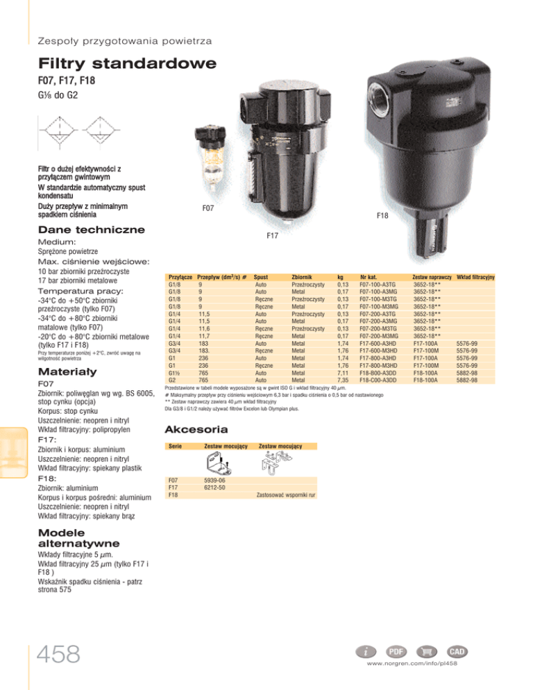 Zespo∏y przygotowania powietrza Filtry standardowe F07, F17, F18 G do G2 Filtr o du˝ej efektywnoÊci z przy∏àczem gwintowym W standardzie automatyczny spust kondensatu Du˝y przep∏yw z minimalnym spadkiem ciÊnienia F07 F18 Dane techniczne Medium: Spr´˝one powietrze Max. ciÊnienie wejÊciowe: 10 bar zbiorniki przeêroczyste 17 bar zbiorniki metalowe Temperatura pracy: -34°C do +50°C zbiorniki przeêroczyste (tylko F07) -34°C do +80°C zbiorniki matalowe (tylko F07) -20°C do +80°C zbiorniki metalowe (tylko F17 i F18) Przy temperaturze poni˝ej +2°C, zwróç uwag´ na wilgotnoÊç powietrza Materia∏y F07 Zbiornik: poliw´glan wg wg. BS 6005, stop cynku (opcja) Korpus: stop cynku Uszczelnienie: neopren i nitryl Wk∏ad filtracyjny: polipropylen F17: Zbiornik i korpus: aluminium Uszczelnienie: neopren i nitryl Wk∏ad filtracyjny: spiekany plastik F18: Zbiornik: aluminium Korpus i korpus poÊredni: aluminium Uszczelnienie: neopren i nitryl Wk∏ad filtracyjny: spiekany bràz F17 Przy∏àcze Przep∏yw (dm3/s) # G1/8 9 G1/8 9 G1/8 9 G1/8 9 G1/4 11,5 G1/4 11,5 G1/4 11,6 G1/4 11,7 G3/4 183 G3/4 183. G1 236 G1 236 G1Ë 765 G2 765 Spust Auto Auto R´czne R´czne Auto Auto R´czne R´czne Auto R´czne Auto R´czne Auto Auto Zbiornik Przeêroczysty Metal Przeêroczysty Metal Przeêroczysty Metal Przeêroczysty Metal Metal Metal Metal Metal Metal Metal kg 0,13 0,17 0,13 0,17 0,13 0,17 0,13 0,17 1,74 1,76 1,74 1,76 7,11 7,35 Nr kat. F07-100-A3TG F07-100-A3MG F07-100-M3TG F07-100-M3MG F07-200-A3TG F07-200-A3MG F07-200-M3TG F07-200-M3MG F17-600-A3HD F17-600-M3HD F17-800-A3HD F17-800-M3HD F18-B00-A3DD F18-C00-A3DD Zestaw naprawczy 3652-18** 3652-18** 3652-18** 3652-18** 3652-18** 3652-18** 3652-18** 3652-18** F17-100A F17-100M F17-100A F17-100M F18-100A F18-100A Wk∏ad filtracyjny 5576-99 5576-99 5576-99 5576-99 5882-98 5882-98 Przedstawione w tabeli modele wyposa˝one sà w gwint ISO G i wk∏ad filtracyjny 40 µm. # Maksymalny przep∏yw przy ciÊnieniu wejÊciowym 6,3 bar i spadku ciÊnienia o 0,5 bar od nastawionego ** Zestaw naprawczy zawiera 40 µm wk∏ad filtracyjny Dla G3/8 i G1/2 nale˝y u˝ywaç filtrów Excelon lub Olympian plus. Akcesoria Serie Zestaw mocujàcy F07 F17 F18 5939-06 6212-50 Zestaw mocujàcy Zastosowaç wsporniki rur Modele alternatywne Wk∏ady filtracyjne 5 µm. Wk∏ad filtracyjny 25 µm (tylko F17 i F18 ) Wskaênik spadku ciÊnienia - patrz strona 575 458 www.norgren.com/info/pl458 Filtry standardowe F07, F17, F18 G do G2 Mocowanie F07 Serie F07 F17 Spust automatyczny F17 Przy∏àcze G1/8, G1/4 G3/4, G1 A 38 130 D 35 81 E 34 25 F 6 76 G 52 43 H 9 * Minimalny odst´p konieczny do demonta˝u zbiornika. Serie F07 Przy∏àcze G1/8, G1/4 F17 G3/4, G1 F18 G1Ë, G2 Spust Auto R´czny Auto R´czny Auto A 104 108 288 236 431 B 154 158 424 372 584 C 10 10 32 32 47 F 42 42 121 121 209 ØG 37 37 110 110 207 kg 0,13 0,13 1,93 1,88 6,76 Charakterystyki przep∏ywowe Przy∏àcze: 1/4" Wk∏ad filtracyjny 40 µm Przep∏yw powietrza CiÊnienie wejÊciowe (bar) CiÊnienie wejÊciowe (bar) Przy∏àcze: 2" Wk∏ad filtracyjny 40 µm Przep∏yw powietrza Spadek ciÊnienia F17 F18 Spadek ciÊnienia CiÊnienie wejÊciowe (bar) Spadek ciÊnienia F07 Przy∏àcze : 1" Wk∏ad filtracyjny 50 µm Przep∏yw powietrza 459