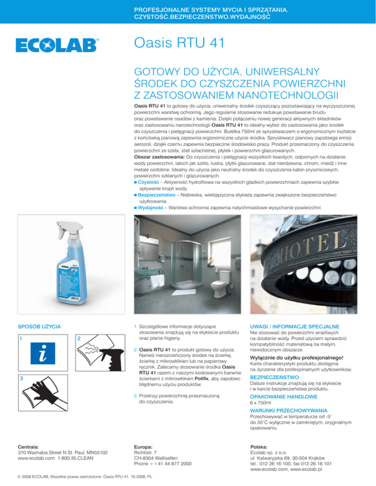 PROFESJONALNE SYSTEMY MYCIA I SPRZĄTANIA. CZYSTOŚĆ.BEZPIECZEŃSTWO.WYDAJNOŚĆ Oasis RTU 41 GOTOWY DO UŻYCIA, UNIWERSALNY ŚRODEK DO CZYSZCZENIA POWIERZCHNI Z ZASTOSOWANIEM NANOTECHNOLOGII Oasis RTU 41 to gotowy do użycia, uniwersalny środek czyszczący pozostawiający na wyczyszczonej powierzchni warstwę ochronną. Jego regularne stosowanie redukuje powstawanie brudu oraz powstawanie osadów z kamienia. Dzięki połączeniu nowej generacji aktywnych składników oraz zastosowaniu nanotechnologii Oasis RTU 41 to idealny wybór do zastosowania jako środek do czyszczenia i pielęgnacji powierzchni. Butelka 750ml ze spryskiwaczem o ergonomicznym kształcie z końcówką pianową zapewnia ergonomiczne użycie środka. Spryskiwacz pianowy zapobiega emisji aerozoli, dzięki czemu zapewnia bezpieczne środowisko pracy. Produkt przeznaczony do czyszczenia powierzchni ze szkła, stali szlachetnej, płytek i powierzchni glazurowanych. Obszar zastosowania: Do czyszczenia i pielęgnacji wszystkich twardych, odpornych na działanie wody powierzchni, takich jak szkło, lustra, płytki glazurowane, stal nierdzewna, chrom, miedź i inne metale ozdobne. Idealny do użycia jako neutralny środek do czyszczenia kabin prysznicowych, powierzchni szklanych i glazurowanych. Czystość – Aktywność hydrofilowa na wszystkich gładkich powierzchniach zapewnia szybkie spływanie kropli wody. Bezpieczeństwo – Niebieska, wielojęzyczna etykieta zapewnia zwiększone bezpieczeństwo użytkowania. Wydajność – Warstwa ochronna zapewnia natychmiastowe wysychanie powierzchni. SPOSÓB UŻYCIA 1 3 2 4 1. Szczegółowe informacje dotyczące stosowania znajdują się na etykiecie produktu oraz planie higieny. 2. Oasis RTU 41 to produkt gotowy do użycia. Nanieś nierozcieńczony środek na ścierkę, ścierkę z mikrowłókien lub na papierowy ręcznik. Zalecamy stosowanie środka Oasis RTU 41 razem z naszymi kodowanymi barwnie ścierkami z mikrowłókien Polifix, aby zapobiec błędnemu użyciu produktów. 3. Przetrzyj powierzchnię przeznaczoną do czyszczenia. UWAGI / INFORMACJE SPECJALNE Nie stosować do powierzchni wrażliwych na działanie wody. Przed użyciem sprawdzić kompatybilność materiałową na małym, niewidocznym obszarze. Wyłącznie do użytku profesjonalnego! Karta charakterystyki produktu dostępna na życzenie dla profesjonalnych użytkowników. BEZPIECZEŃSTWO Dalsze instrukcje znajdują się na etykiecie i w karcie bezpieczeństwa produktu. OPAKOWANIE HANDLOWE 6 x 750ml WARUNKI PRZECHOWYWANIA Przechowywać w temperaturze od -5° do 35°C wyłącznie w zamkniętym, oryginalnym opakowaniu. Centrala: 370 Washaba Street N St. Paul, MN55102 www.ecolab.com 1.800.35.CLEAN Europa: Richtistr. 7 CH-8304 Wallisellen Phone ++41 44 877 2000 © 2008 Ecolab, Wszelkie prawa zastrzeżone. Oasis RTU 41. 10.2008. PL Polska: Ecolab sp. z o.o. ul. Kalwaryjska 69, 30-504 Kraków tel.: 012 26 16 100; fax 012 26 16 101 www.ecolab.com, www.ecolab.pl
