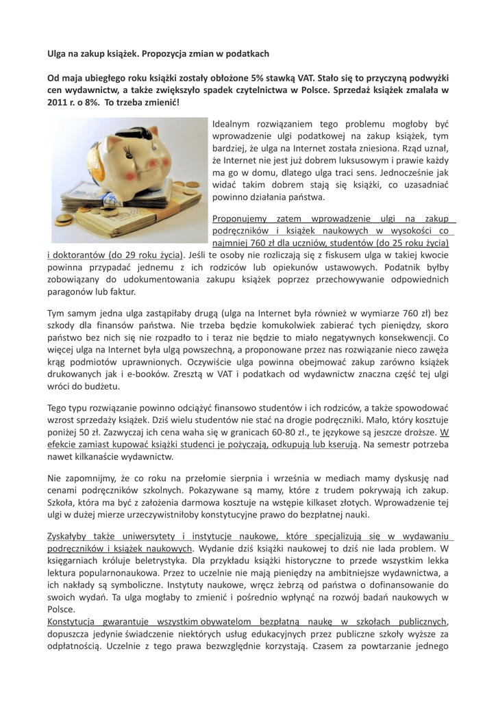 Ulga na zakup książek. Propozycja zmian w podatkach Od maja ubiegłego roku książki zostały obłożone 5% stawką VAT. Stało się to przyczyną podwyżki cen wydawnictw, a także zwiększyło spadek czytelnictwa w Polsce. Sprzedaż książek zmalała w 2011 r. o 8%. To trzeba zmienić! Idealnym rozwiązaniem tego problemu mogłoby być wprowadzenie ulgi podatkowej na zakup książek, tym bardziej, że ulga na Internet została zniesiona. Rząd uznał, że Internet nie jest już dobrem luksusowym i prawie każdy ma go w domu, dlatego ulga traci sens. Jednocześnie jak widać takim dobrem stają się książki, co uzasadniać powinno działania państwa. Proponujemy zatem wprowadzenie ulgi na zakup podręczników i książek naukowych w wysokości co najmniej 760 zł dla uczniów, studentów (do 25 roku życia) i doktorantów (do 29 roku życia). Jeśli te osoby nie rozliczają się z fiskusem ulga w takiej kwocie powinna przypadać jednemu z ich rodziców lub opiekunów ustawowych. Podatnik byłby zobowiązany do udokumentowania zakupu książek poprzez przechowywanie odpowiednich paragonów lub faktur. Tym samym jedna ulga zastąpiłaby drugą (ulga na Internet była również w wymiarze 760 zł) bez szkody dla finansów państwa. Nie trzeba będzie komukolwiek zabierać tych pieniędzy, skoro państwo bez nich się nie rozpadło to i teraz nie będzie to miało negatywnych konsekwencji. Co więcej ulga na Internet była ulgą powszechną, a proponowane przez nas rozwiązanie nieco zawęża krąg podmiotów uprawnionych. Oczywiście ulga powinna obejmować zakup zarówno książek drukowanych jak i e-booków. Zresztą w VAT i podatkach od wydawnictw znaczna część tej ulgi wróci do budżetu. Tego typu rozwiązanie powinno odciążyć finansowo studentów i ich rodziców, a także spowodować wzrost sprzedaży książek. Dziś wielu studentów nie stać na drogie podręczniki. Mało, który kosztuje poniżej 50 zł. Zazwyczaj ich cena waha się w granicach 60-80 zł., te językowe są jeszcze droższe. W efekcie zamiast kupować książki studenci je pożyczają, odkupują lub kserują. Na semestr potrzeba nawet kilkanaście wydawnictw. Nie zapomnijmy, że co roku na przełomie sierpnia i września w mediach mamy dyskusję nad cenami podręczników szkolnych. Pokazywane są mamy, które z trudem pokrywają ich zakup. Szkoła, która ma być z założenia darmowa kosztuje na wstępie kilkaset złotych. Wprowadzenie tej ulgi w dużej mierze urzeczywistniłoby konstytucyjne prawo do bezpłatnej nauki. Zyskałyby także uniwersytety i instytucje naukowe, które specjalizują się w wydawaniu podręczników i książek naukowych. Wydanie dziś książki naukowej to dziś nie lada problem. W księgarniach króluje beletrystyka. Dla przykładu książki historyczne to przede wszystkim lekka lektura popularnonaukowa. Przez to uczelnie nie mają pieniędzy na ambitniejsze wydawnictwa, a ich nakłady są symboliczne. Instytuty naukowe, wręcz żebrzą od państwa o dofinansowanie do swoich wydań. Ta ulga mogłaby to zmienić i pośrednio wpłynąć na rozwój badań naukowych w Polsce. Konstytucja gwarantuje wszystkim obywatelom bezpłatną naukę w szkołach publicznych, dopuszcza jedynie świadczenie niektórych usług edukacyjnych przez publiczne szkoły wyższe za odpłatnością. Uczelnie z tego prawa bezwzględnie korzystają. Czasem za powtarzanie jednego przedmiotu trzeba zapłacić ponad tysiąc złotych. Do tego dochodzą koszty opłaty akademika lub mieszkania oraz biletu miesięcznego o wyżywieniu przy dzisiejszych cenach nie wspominając. Przy proponowanej uldze książkowej państwo przynajmniej w części pokryłoby koszty zakupu niezbędnych materiałów do edukacji. Alternatywnym rozwiązanie mogłoby być chociażby obniżenie VAT-u na książki z 5% do 4% jak to ma się w Hiszpanii. Natomiast w Wielkiej Brytanii i Irlandii VAT na książki wynosi nadal 0%. Powyższy artykuł jest dopiero propozycją, którą chcemy rozpocząć dyskusję na temat wprowadzenia tego typu ulgi, a pośrednio także na temat sprzedaży podręczników i książek naukowych. Wszystkich zainteresowanych naszym pomysłem zachęcamy do kontaktu z nami na adres: [email protected](w temacie wpiszcie "ulga"). Po dyskusji finalną wersję naszego projektu przedstawimy politykom i złożymy go w Ministerstwie Finansów. Inicjatorem akcji jest redakcji portalu historycznego „historia.org.pl” zrzeszającego pasjonatów historii. W razie pytań zachęcamy do kontaktu: [email protected]
