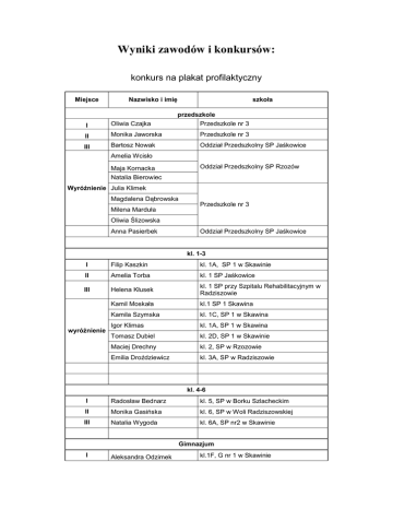 Wyniki zawodów i konkursów: konkurs na plakat profilaktyczny Miejsce Nazwisko i imię szkoła przedszkole I Oliwia Czajka Przedszkole nr 3 II Monika Jaworska Przedszkole nr 3 III Bartosz Nowak Oddział Przedszkolny SP Jaśkowice Amelia Wcisło Maja Kornacka Natalia Bierowiec Oddział Przedszkolny SP Rzozów Wyróżnienie Julia Klimek Magdalena Dąbrowska Milena Marduła Przedszkole nr 3 Oliwia Ślizowska Anna Pasierbek Oddział Przedszkolny SP Jaśkowice kl. 1-3 I Filip Kaszkin kl. 1A, SP 1 w Skawinie II Amelia Torba kl. 1 SP Jaśkowice III Helena Kłusek kl. 1 SP przy Szpitalu Rehabilitacyjnym w Radziszowie Kamil Moskała kl.1 SP 1 Skawina Kamila Szymska kl. 1C, SP 1 w Skawina Igor Klimas kl. 1A, SP 1 w Skawina Tomasz Dubiel kl. 2D, SP 1 w Skawinie Maciej Drechny kl. 2, SP w Rzozowie Emilia Droździewicz kl. 3A, SP w Radziszowie wyróżnienie kl. 4-6 I Radosław Bednarz kl. 5, SP w Borku Szlacheckim II Monika Gasińska kl. 6, SP w Woli Radziszowskiej III Natalia Wygoda kl. 6A, SP nr2 w Skawinie Gimnazjum I Aleksandra Odzimek kl.1F, G nr 1 w Skawinie II Julia Siedlaczek, Karolina Turek, Olga Chromniak kl. 2C, Gimnazjum nr 1 w Skawinie III Karolina Łołek, Gabriela Lelek, Natalia Klimczyk, Wiktoria Węgielewska kl.2E, Gimnazjum nr 1 w Skawinie Szkoły ponadgimnazjalne kl.1C, Liceum Ogólnokształcące w Skawinie Monika Sikora, Anna Karwacik I konkurs multimedialny "Zdrowy styl życia" Nazwisko i imię Miejsce szkoła I Magdalena Rumińska kl. 3D Gimnazjum nr 1 II Sophia Krupnik kl. 3D Gimnazjum nr 1 II Aleksandra Łojek kl. 1H Gimnazjum nr 1 III Aleksandra Odzimek kl. 1F Gimnazjum nr 1 Joanna Andruszczyszyn kl. 3F Gimnazjum nr 1 wyróżnienie Współzawodnictwo rodzin 1. 2. 3. Rodzina Dudziak Rodzina Zwada Rodzina Ożóg Wyniki biegów dzieci i młodzieży: Kategoria dziewcząt do lat 4 1. Antonina Dudziak Kategoria chłopców do lat 4 1. Franciszek Klimczyk 2. Kamil Jop 3. Jakub Włoch Kategoria dziewcząt od 5 do 7 lat 1. Amelia Klimczyk 2. Kornelia Kumala 3. Julia Sadowa Kategoria chłopców od 5 do 7 lat 1. Krystian Haja 2. Kamil Moskała 3. Stanisław Krawczyk Kategoria dziewcząt od 8 do 10 lat 1. Maja Sudecka 2. Paulina Młodzik 3. Gabriela Krupnik Kategoria chłopców od 8 do 10 lat 1. Michał Litwa 2. Bartłomiej Moskała 3. Łukasz Wyzgał Kategoria dziewcząt od 11 do 13 lat 1. Klaudia Jop 2. Jadwiga Smęder 3. Oliwia Bartyzel Kategoria chłopców od 11 do 13 lat 1. Kacper Morawski 2. Konrad Pasternak 3. Wiktor Orłoś Kategoria dziewcząt od 14 do 16 lat 1. Agnieszka Lis 2. Aleksandra Golonka 3. Dominika Przebinda Kategoria chłopców od 14 do 16 lat 1. Paweł Sitko 2. Hubert Pakosz 3. Kamil Urban