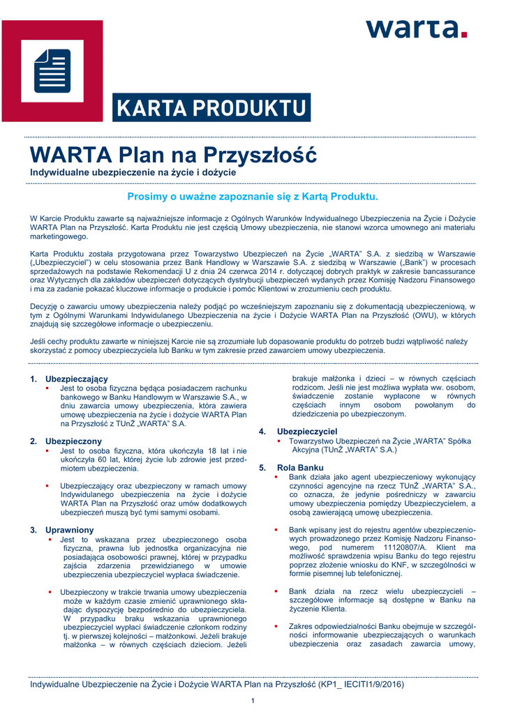 WARTA Plan na Przyszłość Indywidualne ubezpieczenie na życie i dożycie Prosimy o uważne zapoznanie się z Kartą Produktu. W Karcie Produktu zawarte są najważniejsze informacje z Ogólnych Warunków Indywidualnego Ubezpieczenia na Życie i Dożycie WARTA Plan na Przyszłość. Karta Produktu nie jest częścią Umowy ubezpieczenia, nie stanowi wzorca umownego ani materiału marketingowego. Karta Produktu została przygotowana przez Towarzystwo Ubezpieczeń na Życie „WARTA” S.A. z siedzibą w Warszawie („Ubezpieczyciel”) w celu stosowania przez Bank Handlowy w Warszawie S.A. z siedzibą w Warszawie („Bank”) w procesach sprzedażowych na podstawie Rekomendacji U z dnia 24 czerwca 2014 r. dotyczącej dobrych praktyk w zakresie bancassurance oraz Wytycznych dla zakładów ubezpieczeń dotyczących dystrybucji ubezpieczeń wydanych przez Komisję Nadzoru Finansowego i ma za zadanie pokazać kluczowe informacje o produkcie i pomóc Klientowi w zrozumieniu cech produktu. Decyzję o zawarciu umowy ubezpieczenia należy podjąć po wcześniejszym zapoznaniu się z dokumentacją ubezpieczeniową, w tym z Ogólnymi Warunkami Indywidulanego Ubezpieczenia na życie i Dożycie WARTA Plan na Przyszłość (OWU), w których znajdują się szczegółowe informacje o ubezpieczeniu. Jeśli cechy produktu zawarte w niniejszej Karcie nie są zrozumiałe lub dopasowanie produktu do potrzeb budzi wątpliwość należy skorzystać z pomocy ubezpieczyciela lub Banku w tym zakresie przed zawarciem umowy ubezpieczenia. 1. Ubezpieczający brakuje małżonka i dzieci – w równych częściach rodzicom. Jeśli nie jest możliwa wypłata ww. osobom, świadczenie zostanie wypłacone w równych częściach innym osobom powołanym do dziedziczenia po ubezpieczonym. Jest to osoba fizyczna będąca posiadaczem rachunku bankowego w Banku Handlowym w Warszawie S.A., w dniu zawarcia umowy ubezpieczenia, która zawiera umowę ubezpieczenia na życie i dożycie WARTA Plan na Przyszłość z TUnŻ „WARTA” S.A. 4. Ubezpieczyciel 2. Ubezpieczony Jest to osoba fizyczna, która ukończyła 18 lat i nie ukończyła 60 lat, której życie lub zdrowie jest przedmiotem ubezpieczenia. 5. Rola Banku Bank działa jako agent ubezpieczeniowy wykonujący czynności agencyjne na rzecz TUnŻ „WARTA” S.A., co oznacza, że jedynie pośredniczy w zawarciu umowy ubezpieczenia pomiędzy Ubezpieczycielem, a osobą zawierającą umowę ubezpieczenia. Bank wpisany jest do rejestru agentów ubezpieczeniowych prowadzonego przez Komisję Nadzoru Finansowego, pod numerem 11120807/A. Klient ma możliwość sprawdzenia wpisu Banku do tego rejestru poprzez złożenie wniosku do KNF, w szczególności w formie pisemnej lub telefonicznej. Bank działa na rzecz wielu ubezpieczycieli – szczegółowe informacje są dostępne w Banku na życzenie Klienta. Zakres odpowiedzialności Banku obejmuje w szczególności informowanie ubezpieczających o warunkach ubezpieczenia oraz zasadach zawarcia umowy, Ubezpieczający oraz ubezpieczony w ramach umowy Indywidulanego ubezpieczenia na życie i dożycie WARTA Plan na Przyszłość oraz umów dodatkowych ubezpieczeń muszą być tymi samymi osobami. 3. Uprawniony Jest to wskazana przez ubezpieczonego osoba fizyczna, prawna lub jednostka organizacyjna nie posiadająca osobowości prawnej, której w przypadku zajścia zdarzenia przewidzianego w umowie ubezpieczenia ubezpieczyciel wypłaca świadczenie. Ubezpieczony w trakcie trwania umowy ubezpieczenia może w każdym czasie zmienić uprawnionego składając dyspozycję bezpośrednio do ubezpieczyciela. W przypadku braku wskazania uprawnionego ubezpieczyciel wypłaci świadczenie członkom rodziny tj. w pierwszej kolejności – małżonkowi. Jeżeli brakuje małżonka – w równych częściach dzieciom. Jeżeli Towarzystwo Ubezpieczeń na Życie „WARTA” Spółka Akcyjna (TUnŻ „WARTA” S.A.) Indywidualne Ubezpieczenie na Życie i Dożycie WARTA Plan na Przyszłość (KP1_ IECITI1/9/2016) 1 przedstawianie i odbieranie od ubezpieczających niezbędnych dokumentów do zawarcia umowy lub innych dyspozycji dotyczących umowy, a następnie przekazywanie do ubezpieczyciela. 6. Typ, zakres i okres umowy ubezpieczenia – SZCZEGÓLNIE WAŻNE 7. Indywidualna umowa ubezpieczenia na życie i dożycie (umowa) o charakterze ochronno-oszczędnościowym zawierana pomiędzy ubezpieczającym a ubezpieczycielem za pośrednictwem Banku. Przedmiotem ubezpieczenia jest życie ubezpieczonego. Zakres ubezpieczenia obejmuje w zakresie podstawowym zgon w okresie ubezpieczenia oraz dożycie ubezpieczonego do końca okresu ubezpieczenia. Umowa ubezpieczenia zawierana jest na czas określony wskazany w polisie, nie krótszy jednak niż 10 lat, nie dłuższy niż 30 lat oraz nie dłuższy niż do dnia pierwszej rocznicy polisy przypadającej po dniu, w którym ubezpieczony ukończy 70 rok życia (okres ubezpieczenia). Ubezpieczyciel może zażądać dokumentów na podstawie, których dokonuje oceny ryzyka lub skierować ubezpieczonego na badania lekarskie lub diagnostyczne, których koszt ponosi ubezpieczyciel. 9. Koniec ochrony ubezpieczeniowej – SZCZEGÓLNIE WAŻNE Ochrona ubezpieczeniowa rozpoczyna się od dnia wskazanego w polisie, nie wcześniej jednak niż po zapłaceniu pierwszej składki w wysokości wskazanej w polisie. Ubezpieczający może odstąpić od umowy ubezpieczenia w terminie 30 dni od dnia jej zawarcia bez dodatkowych kosztów, przy czym nie zwalnia to ubezpieczającego z obowiązku zapłaty składki za czas trwania ochrony ubezpieczeniowej. Ubezpieczający może w każdym czasie wypowiedzieć umowę ubezpieczenia bez dodatkowych kosztów, przy czym rozwiązanie nastąpi na koniec miesiąca polisowego, w którym ubezpieczyciel otrzymał pisemne wypowiedzenie tj. w dniu odpowiadającym w danym miesiącu dacie zawarcia umowy, bądź w ostatnim dniu kalendarzowym tego miesiąca, jeśli dnia o takiej dacie w danym miesiącu nie ma. Przez cały okr