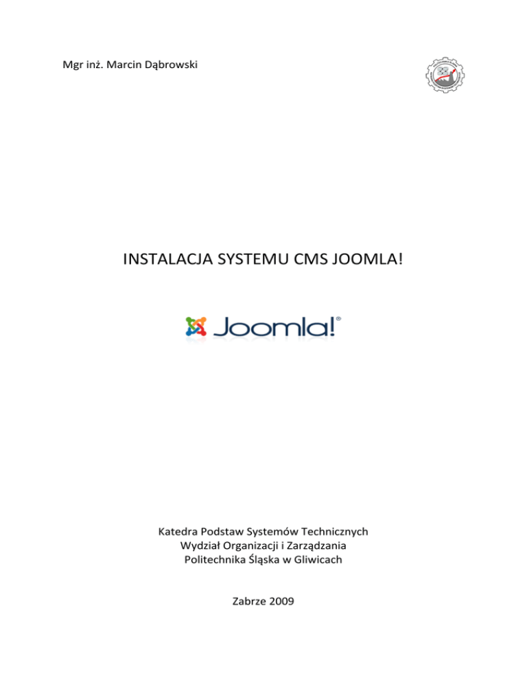 Mgr inż. Marcin Dąbrowski INSTALACJA SYSTEMU CMS JOOMLA! Katedra Podstaw Systemów Technicznych Wydział Organizacji i Zarządzania Politechnika Śląska w Gliwicach Zabrze 2009 Instalacja serwera lokalnego KRASNAL SERV 2.7 1. Instalacja Systemu CMS Joomla! Kliknij na ikonę pliku instalacyjnego JoomlaPE1_0_15a.exe, wybierz opcję pełnego tłumaczenia. Po zakończeniu procedury – na dysku C powstanie folder joomlaPE zawierający pliki systemu CMS Joomla. Zmień nazwę wypakowanego folderu na „Strona_joomla” i skopiuj następnie ten folder do katalogu: C:\usr\krasnal\www. Po skopiowaniu plików systemu Joomla! na serwer Krasnal – na stronie głównej serwera w obszarze Użytkownicy pojawi się link do Strony_joomla (rys. 1). Rys. 1. Link do strony_joomla. Należy kliknąć na link Strona_joomla. Po kliknięciu pojawi się strona przeglądu ustawień serwera (rys. 3). Na wspomnianej stronie poprawne ustawienia serwera wyświetlane będą w kolorze zielonym. Ustawienia niepoprawne wyświetlane będą w kolorze czerwonym (na rys. 3 wszystkie ustawienia są poprawne). W celu modyfikacji wskazanych na liście parametrów należy dokonać ich modyfikacji w odpowiednich plikach źródłowych. Zmiany mogą dotyczyć następujących parametrów: - parametr register_globals=ON ->zmienić na OFF (rys. 2) - parametr allow_url_fopen = OFF -> zmienić na ON - parametr short_open_tag = OFF -> zmienić na ON. Rys. 2. Zmiana parametru register_globals. Wszystkie wspomniane parametry znajdują się w pliku o następującej lokalizacji właściwości serwera Krasnal: Ustawienia/PHP/php.ini. Każdorazowo po dokonaniu zmiany należy zapisać zmiany w pliku (CTRL+S) oraz restartować serwer Apache. ---- Instrukcję opracował mgr inż. Marcin Dąbrowski --Katedra Podstaw Systemów Technicznych 2 Instalacja serwera lokalnego KRASNAL SERV 2.7 Rys. 3. Strona przeglądu ustawień serwera. Po dokonaniu wspomnianych modyfikacji parametrów serwera można przejść do właściwej instalacji systemu CMS – należy kliknąć na link Dalej >> znajdujący się w prawym górnym narożniku strony przeglądu ustawień serwera. Instalacja będzie się odbywać w czterech krokach: Konfiguracja bazy danychMySQL, Po kliknięciu otworzy się kolejna strona zawierająca licencję GNU/GPL systemu Joomla! , na której należy ponownie kliknąć na link Dalej >>. ---- Instrukcję opracował mgr inż. Marcin Dąbrowski --Katedra Podstaw Systemów Technicznych 3 Instalacja serwera lokalnego KRASNAL SERV 2.7 Otwarte zostanie okno konfiguracji bazy danych MySQL (rys. 4), w którym należy wypełnić wskazane pola. Dla początkujących użytkowników zalecane jest wczytanie przykładowych danych do systemu. UWAGA! Należy odnaleźć kartkę z hasłem oraz nazwą użytkownika dla serwera lokalnego oraz zapisać na kartce poniższe ustawienia: Nazwę serwera MySQL – ta sama co w przypadku ustawień na serwerze Krasnal - localhost, Użytkownika MySQL – ta sama co w phpMySQL, Hasło użytkownika - to samo co w phpMySQL, Nazwa bazy danych. Wprowadzone nazwy i hasła będą niezbędne aby w przyszłości uzyskać dostęp do bazy danych – nie można ich zapomnieć! Rys. 4. Okno konfiguracji bazy danych MySQL. Po wprowadzeniu wymaganych haseł oraz nazw klikamy po raz kolejny na link Dalej >>. W kolejnym oknie należy wpisać nazwę witryny – np. Moja_joomla (rys. 5), po czym należy kliknąć na link Dalej >>. ---- Instrukcję opracował mgr inż. Marcin Dąbrowski --Katedra Podstaw Systemów Technicznych 4 Instalacja serwera lokalnego KRASNAL SERV 2.7 Rys. 5. Wprowadzanie nazwy witryny. W kolejnym kroku (rys. 6) należy dopisać adres mailowy administratora oraz zweryfikować poprawność danych, po czym należy kliknąć na link Dalej >>. Rys. 6. Krok 3 instalacji systemu CMS. W ostatnim kroku instalacji systemu CMS (rys. 7) należy: - zapamiętać wygenerowane hasło dla profilu administratora (zaznaczone czerwoną elipsą na rys. 7). ---- Instrukcję opracował mgr inż. Marcin Dąbrowski --Katedra Podstaw Systemów Technicznych 5 Instalacja serwera lokalnego KRASNAL SERV 2.7 - Usunąć folder instalacyjny – o nazwie w formacie *******installation1, znajdujący się pod adresem: C:\usr\krasnal\www\Moja_joomla Rys. 7. Ostatni krot instalacji systemu CMS. Po kliknięciu na link Uruchom – otworzy się strona główna zainstalowanego systemu CMS Joomla. Kliknięcie na link administrator spowoduje wyświetlenie okna logowania do panelu administracyjnego Joomli. Jako dane niezbędne do zalogowania się w panelu administracyjnym – należy wykorzystać login i hasło – wskazane czerwoną elipsą na rys 7. Po wykonaniu powyższych kroków można przejść do edycji istniejącej struktury systemu CMS. Edycji dokonujemy z poziomu panelu administracyjnego. Najlepszą metodą na opanowanie zaplecza administracyjnego systemu CMS jest stopniowe modfikowanie wszystkich poszczególnych opcji i sprawdzanie jaki efekt zostanie dzięki temu osiągnięty. 1 Gdzie ******* oznacza numer losowo wygenerowany przy instalacji. ---- Instrukcję opracował mgr inż. Marcin Dąbrowski --Katedra Podstaw Systemów Technicznych 6