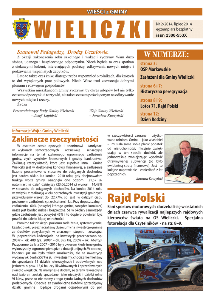 WIEŚCI z GMINY Nr 2/2014, lipiec 2014 egzemplarz bezpłatny issn 2300-553X Szanowni Pedagodzy, Drodzy Uczniowie. Z okazji zakończenia roku szkolnego i wakacji życzymy Wam dużo słońca, udanego i bezpiecznego odpoczynku. Niech będzie to czas spotkań z ciekawymi ludźmi, interesujących podróży, odkrywania nowych miejsc i podziwiania wspaniałych zabytków. Lato to także czas żniw, dlatego trzeba wspomnieć o rolnikach, dla których to dni wytężonych prac polowych. Niech Wasz trud zaowocuje dobrymi plonami i rozwojem gospodarstw. Wszystkim mieszkańcom gminy życzymy, by okres urlopów był nie tylko czasem odpoczynku i rozrywki, ale także czasem poświęconym na odkrywanie nowych miejsc i rzeczy. Życzą Przewodniczący Rady Gminy Wieliczki – Józef Łapiński Wójt Gminy Wieliczki – Jarosław Kuczyński Informacje Wójta Gminy Wieliczki Zaklinacze rzeczywistości W ostatnim czasie opozycja i anonimowi kandydaci w wyborach samorządowych rozsiewają sensacyjne informacje na temat rzekomego ogromnego zadłużenia gminy, złych wyników finansowych i groźby bankructwa. Zaklinają rzeczywistość, która jest zupełnie inna. Gmina Wieliczki jest w doskonałej kondycji finansowej, a zadłużenie liczone procentowo w stosunku do osiąganych dochodów jest bardzo niskie. Na koniec 2010 roku, gdy obejmowałem funkcję wójta gminy, osiągnęło ono poziom 21,57 %, natomiast na dzień dzisiejszy (23.06.2014 r.) wynosi 14,48% w stosunku do osiąganych dochodów. Na koniec 2014 roku w związku z realizacją wielu potrzebnych inwestycji gminnych przewidujemy wzrost do 22,77%, co jest w dalszym ciągu poziomem zadłużenia sprzed czterech lat. Przy dopuszczalnym zadłużeniu 60% (powyżej którego gminą zarządza komisarz) nasze jest bardzo niskie i bezpieczne. Są w okolicy samorządy, gdzie zadłużenie jest powyżej 45% i to dopiero powinien być powód do daleko idącej ostrożności. Pomimo tak niskiego poziomu zadłużenia, systematycznie, każdego roku przeznaczaliśmy duże sumy na inwestycje gminne ze środków pozyskanych w znacznym stopniu zewnątrz. W poprzednich kadencjach na inwestycje przeznaczano np: 2007r – ok. 489 tys, 2008r – ok. 895 tys, 2009r – ok. 669 tys. Przypomnę, że lata 2007 – 2010 były okresem kiedy inne gminy wykorzystały ogromne pieniądze z dotacji unijnych. W obecnej kadencji już nie było takich możliwości, ale na inwestycje wydamy ok. 6 mln 557 tys zł. Inwestujemy, chociaż nie mieliśmy do sprzedania 31 działek rekreacyjnych i budowlanych nad jeziorem o pow. 13,6 ha, czy likwidowanych i sprzedawanych świetlic wiejskich. Na marginesie dodam, że tereny rekreacyjne nad jeziorem zostały sprzedane jako nieużytki i działki rolne VI klasy, przez co nie mamy z tego tytułu żadnych dochodów podatkowych. Obecnie za symboliczne złotówki sprzedajemy działki gminne będą ce drogami dojazdowymi do pól, W NUMERZE: strona 3: OSP Markowskie Zasłużeni dla Gminy Wieliczki strona 6 i 7: Historyczna peregrynacja strona 8 i 9: Lotos 71. Rajd Polski strona 12: Dzień Rodziny w rzeczywistości zaorane i użytko wane rolniczo. Gmina – jako właściciel – musiała sama sobie płacić podatek od nieruchomości, fikcyjnie zwięk szając w ten sposób dochód, ale jednocześnie zmniejszając wysokość otrzymywanej subwencji (co było ewidentną stratą finansową). Jest to kolejne naprawianie zaniedbań z lat poprzednich. Jarosław Kuczyński Rajd Polski Fani sportów motorowych doczekali się w ostatnich dniach czerwca rywalizacji najlepszych rajdowych kierowców świata na OS Wieliczki. Specjalna fotorelacja dla Czytelników - na str. 8–9. WIEŚCI z GMINY WIELICZKI Wycieczka do Suwałk W dniu 10 czerwca 2014r. uczniowie Zespołu Szkolno-Przedszkolnego w Cimochach wzięli udział w jednodniowej wycieczce do Suwałk. W programie znalazło się m.in. zwiedzanie Muzeum Marii Konopnickiej, które u dzieci cieszyło się dużym zainteresowaniem. Kolejną niespodzianką był pobyt na placu zabaw w Fantasy Parku. Tutaj przez godzinę dzieci podzielone na dwie grupy bawiły się wyśmienicie: biegały, skakały i „kąpały się” w basenach z piłeczkami, korzystały też z kręgielni. Zabawa była wyczerpująca, toteż na zakończenie wszyscy udali się na obiad do McDonald’s. Wyjazd był finansowany ze środków Programu Profilaktyki i Rozwiązywania Problemów Alkoholowych na 2014 r. Po dniu pełnym wrażeń uczestnicy wycieczki żegnali się w bardzo miłej i wesołej atmosferze. Dzieci wracały do domów trochę zmęczone, ale pełne wrażeń. (ug) POŻEGNANIE STRÓŻA PORZĄDKU Podczas obrad Rady Gminy Wieliczki 29 kwietnia 2014 r. Wójt Gminy Jarosław Kuczyński i Przewodniczący Rady Gminy Józef Łapiński podziękowali Panu Markowi Opalińskiemu za wieloletnią pracę na stanowisku dzielnicowego. Po ponad 30 latach służby na terenie gminy Wieliczki sierżant Marek Opaliński przeszedł na zasłużoną emeryturę. (ug) STR. 2 XI MIĘDZYSZKOLNY KONKURS ORTOGRAFICZNY 28 maja w Szkole Podstawowej w Wieliczkach odbył się XI Międzyszkolny Konkurs Ortograficzny dla uczniów klas IV-VI szkół podstawowych z powiatu oleckiego, zorganizowany pod hasłem „Serdecznie zapraszamy na corridę … ortograficzną”. W konkursie wzięło udział18 uczniów. Dyktando najlepiej napisała Urszula Kamińska ze SP Nr 1 w Olecku, przygotowana przez Ewę Ciechanowską. Drugie miejsce zajęła jej szkolna koleżanka Róża Stankiewicz, pracująca pod kierunkiem Małgorzaty Jakubowskiej. Kolejne miejsca zajęli: Nina Wasilewska - SP w Kowalach Oleckich (nauczyciel Barbara Gulbierz), Hubert Rudziewicz - SP w Filipowie (nauczyciel Helena Wiśniewska), Zuzanna Bartoszewicz - SP w Świętajnie (nauczyciel Grażyna Sertel-Chlebus). Wszyscy otrzymali dyplomy i upominki, a zwycięzców nagrodzono cennymi książkami. Konkurs zorganizowały i przeprowadziły Grażyna Jankowska i Izabela Czapuryn. Gratulujemy zwycięzcom i ich nauczycielom. Wszystkich zap