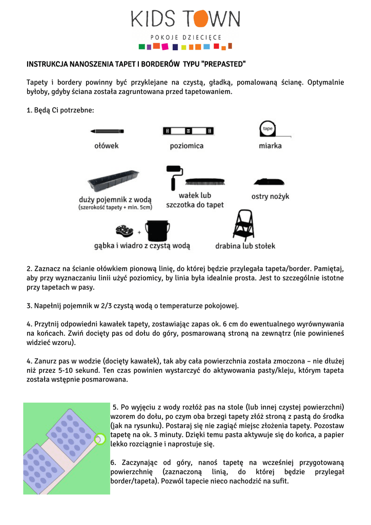 INSTRUKCJA NANOSZENIA TAPET I BORDERÓW TYPU "PREPASTED" Tapety i bordery powinny być przyklejane na czystą, gładką, pomalowaną ścianę. Optymalnie byłoby, gdyby ściana została zagruntowana przed tapetowaniem. 1. Będą Ci potrzebne: 2. Zaznacz na ścianie ołówkiem pionową linię, do której będzie przylegała tapeta/border. Pamiętaj, aby przy wyznaczaniu linii użyć poziomicy, by linia była idealnie prosta. Jest to szczególnie istotne przy tapetach w pasy. 3. Napełnij pojemnik w 2/3 czystą wodą o temperaturze pokojowej. 4. Przytnij odpowiedni kawałek tapety, zostawiając zapas ok. 6 cm do ewentualnego wyrównywania na końcach. Zwiń docięty pas od dołu do góry, posmarowaną stroną na zewnątrz (nie powinieneś widzieć wzoru). 4. Zanurz pas w wodzie (docięty kawałek), tak aby cała powierzchnia została zmoczona – nie dłużej niż przez 5-10 sekund. Ten czas powinien wystarczyć do aktywowania pasty/kleju, którym tapeta została wstępnie posmarowana. 5. Po wyjęciu z wody rozłóż pas na stole (lub innej czystej powierzchni) wzorem do dołu, po czym oba brzegi tapety złóż stroną z pastą do środka (jak na rysunku). Postaraj się nie zagiąć miejsc złożenia tapety. Pozostaw tapetę na ok. 3 minuty. Dzięki temu pasta aktywuje się do końca, a papier lekko rozciągnie i naprostuje się. 6. Zaczynając od góry, nanoś tapetę na wcześniej przygotowaną powierzchnię (zaznaczoną linią, do której będzie przylegał border/tapeta). Pozwól tapecie nieco nachodzić na sufit. Użyj gąbki, wałka do tapet lub innego odpowiedniego narzędzia by docisnąć tapetę do ściany, wyrównać powierzchnię i zapewnić właściwe przyleganie tapety/borderu. Pamiętaj, aby nie dopuścić do wyschnięcia brzegów. NIGDY NIE NACIĄGAJ TAPETY! NACIĄGNIĘTA TAPETA PO WYSCHNIĘCIU "ZEJDZIE" SIĘ, POZOSTAWIAJĄC SZPARY MIĘDZY PASAMI. Po naniesieniu całego pasa wyrównaj tapetę na górze, odcinając zapas ostrym nożykiem. Na tapetach z wzorami, których równe ułożenie mogłoby sprawiać pewien problem, naniesione zostały punkty styku "easy-match". Dzięki nim bez problemu można dopasować odpowiednio docięte kawałki tapety, tak by otrzymać idealny rezultat. Oznaczenia te wystarczy zetrzeć mokrą gąbką. Kolejne pasy tapety kładź "na styk", tak, by nie zachodziły na siebie. Powierzchnia produktu może być czyszczona przy użyciu ciepłej wody i miękkiej gąbki z łagodnym mydłem. Produkt może być łatwo usunięty ze ściany bez użycia specjalnych narzędzi albo chemikaliów. Wystarczy chwycić za róg tapety i ciągnąć wzdłuż ściany aż do całkowitego usunięcia. Na powierzchni pozostanie „pasta”, którą należy usunąć przy pomocy czystej, ciepłej wody i gąbki.