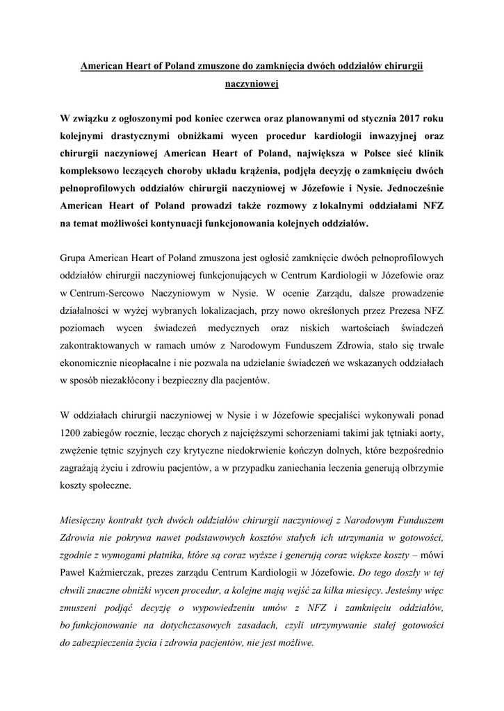 American Heart of Poland zmuszone do zamknięcia dwóch oddziałów chirurgii naczyniowej W związku z ogłoszonymi pod koniec czerwca oraz planowanymi od stycznia 2017 roku kolejnymi drastycznymi obniżkami wycen procedur kardiologii inwazyjnej oraz chirurgii naczyniowej American Heart of Poland, największa w Polsce sieć klinik kompleksowo leczących choroby układu krążenia, podjęła decyzję o zamknięciu dwóch pełnoprofilowych oddziałów chirurgii naczyniowej w Józefowie i Nysie. Jednocześnie American Heart of Poland prowadzi także rozmowy z lokalnymi oddziałami NFZ na temat możliwości kontynuacji funkcjonowania kolejnych oddziałów. Grupa American Heart of Poland zmuszona jest ogłosić zamknięcie dwóch pełnoprofilowych oddziałów chirurgii naczyniowej funkcjonujących w Centrum Kardiologii w Józefowie oraz w Centrum-Sercowo Naczyniowym w Nysie. W ocenie Zarządu, dalsze prowadzenie działalności w wyżej wybranych lokalizacjach, przy nowo określonych przez Prezesa NFZ poziomach wycen świadczeń medycznych oraz niskich wartościach świadczeń zakontraktowanych w ramach umów z Narodowym Funduszem Zdrowia, stało się trwale ekonomicznie nieopłacalne i nie pozwala na udzielanie świadczeń we wskazanych oddziałach w sposób niezakłócony i bezpieczny dla pacjentów. W oddziałach chirurgii naczyniowej w Nysie i w Józefowie specjaliści wykonywali ponad 1200 zabiegów rocznie, lecząc chorych z najcięższymi schorzeniami takimi jak tętniaki aorty, zwężenie tętnic szyjnych czy krytyczne niedokrwienie kończyn dolnych, które bezpośrednio zagrażają życiu i zdrowiu pacjentów, a w przypadku zaniechania leczenia generują olbrzymie koszty społeczne. Miesięczny kontrakt tych dwóch oddziałów chirurgii naczyniowej z Narodowym Funduszem Zdrowia nie pokrywa nawet podstawowych kosztów stałych ich utrzymania w gotowości, zgodnie z wymogami płatnika, które są coraz wyższe i generują coraz większe koszty – mówi Paweł Kaźmierczak, prezes zarządu Centrum Kardiologii w Józefowie. Do tego doszły w tej chwili znaczne obniżki wycen procedur, a kolejne mają wejść za kilka miesięcy. Jesteśmy więc zmuszeni podjąć decyzję o wypowiedzeniu umów z NFZ i zamknięciu oddziałów, bo funkcjonowanie na dotychczasowych zasadach, czyli utrzymywanie stałej gotowości do zabezpieczenia życia i zdrowia pacjentów, nie jest możliwe. Choroby serca i naczyń stanowią narastający problem zdrowotny ze względu na starzejące się społeczeństwo oraz stale wzrastającą przeciętną długość życia. W ciągu roku w Polsce z ich powodu umiera ponad 170 000 osób. Ponadto Polska jest jedynym krajem w Unii Europejskiej charakteryzującym się bardzo wysoką zapadalnością na udary i zachorowalnością na tętniaki aorty oraz wzrastającą liczbą amputacji kończyn, których główną przyczyną jest miażdżyca tętnic. Oddziały chirurgii naczyniowej w Nysie i Józefowie wpisały się na stałe w regionalną mapę medyczną. W obliczu ogromnego zagrożenia udarami mózgu i amputacjami kończyn, ich zamknięcie zwiększy okres oczekiwania na konsultacje i specjalistyczne leczenie, powodując znaczące ograniczenie dostępności do procedur ratujących zdrowie i życie mieszkańców tych regionów. W Polsce średnio co godzinę ktoś traci nogę w wyniku amputacji i dotyczy to nie tylko osób starszych, ale również osób w wieku produkcyjnym. Dlatego szokujące jest, że w tej sytuacji obcina się pieniądze na leczenie pacjentów, które mogłoby odwrócić ten negatywny trend – mówi prof. Stefan Kiesz, współzałożyciel i wiceprzewodniczący rady nadzorczej American Heart of Poland. W ciągu ponad dwuletniej działalności w obu zamykanych oddziałach leczyło się ponad 4000 pacjentów. Przeprowadzano w nich najbardziej skomplikowane zabiegi w pełnym zakresie chirurgii naczyniowej, zarówno technikami otwartymi jak i wewnątrznaczyniowymi, od wysokospecjalistycznego leczenia tętniaków aorty po udrażnianie tętnic dogłowowych i obwodowych. Ponadto w Centrum Kardiologii w Józefowie przeprowadzone były nowatorskie zabiegi ratujące nogi przed amputacjami, które dzięki zastosowaniu technik małoinwazyjnych sprawiły, że pacjenci już po kilku godzinach od zabiegu, byli gotowi do opuszczenia oddziału na własnych nogach. Oddziały chirurgii naczyniowej w Nysie i Józefowie utrzymywały bardzo dobre wyniki liczenia, przyjmując całodobowo ciężko chorych pacjentów z zaawansowanymi chorobami układu krążenia. Śmiertelność wewnątrzszpitalna w tych jednostkach była bardzo niska i utrzymywała się na poziomie poniżej 1 %. Tak dobre wyniki medyczne osiągnięto dzięki bezpośredniej współpracy tych oddziałów z funkcjonującymi w tej samej lokalizacji oddziałami kardiologii inwazyjnej oraz stworzeniem zespołów specjalistów sercowonaczyniowych opiekujących się chorymi. Ten nowoczesny model organizacji usługi sercowonaczyniowej, stworzony przez Grupę American Heart of Poland kosztem wysokich nakładów finansowych, jest unikalny nie tylko w Polsce, ale i zagranicą. Taki model pozwala na kompleksowe zaopatrzenie chorych, które jest wysoko kosztowo-efektywne i obniża ogromne koszty społeczne związane z przedwczesnym zgonem i ciężkim kalectwem. Bardzo dziwi nas to, że ani decydenci polityczni, ani NFZ nie docenili tej wartości – tłumaczy prof. Paweł Buszman, kardiolog i absolwent prestiżowego TRIUM EMBA. Dwa lata temu, kiedy przyjechałem otworzyć oddział chirurgii naczyniowej w Józefowie, wszyscy cieszyliśmy się, że tak nowoczesne zabiegi mogą być przeprowadzane w Polsce – mówi prof. Stefan Kiesz. A dziś z wielkim bólem serca muszę ogłaszać jego zamknięcie. Niestety tylko my i pacjenci cieszymy się z tego, że możemy ratować ludziom kończyny i dbać o ich szybki powrót do normalnego funkcjonowania. NFZ zdaje się tego nie doceniać. Polska to dynamicznie rozwijający się kraj, zajmuj