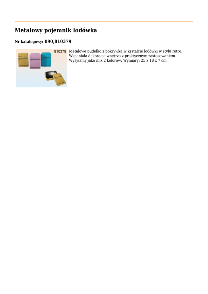 Metalowy pojemnik lodówka Nr katalogowy: 090,810379 Metalowe pudełko z pokrywką w kształcie lodówki w stylu retro. Wspaniała dekoracja wnętrza z praktycznym zastosowaniem. Wysyłamy jako mix 2 kolorów. Wymiary: 25 x 18 x 7 cm.