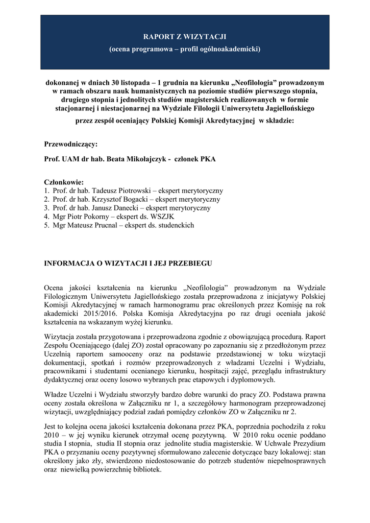 RAPORT Z WIZYTACJI (ocena programowa – profil ogólnoakademicki) dokonanej w dniach 30 listopada – 1 grudnia na kierunku „Neofilologia” prowadzonym w ramach obszaru nauk humanistycznych na poziomie studiów pierwszego stopnia, drugiego stopnia i jednolitych studiów magisterskich realizowanych w formie stacjonarnej i niestacjonarnej na Wydziale Filologii Uniwersytetu Jagiellońskiego przez zespół oceniający Polskiej Komisji Akredytacyjnej w składzie: Przewodniczący: Prof. UAM dr hab. Beata Mikołajczyk - członek PKA Członkowie: 1. Prof. dr hab. Tadeusz Piotrowski – ekspert merytoryczny 2. Prof. dr hab. Krzysztof Bogacki – ekspert merytoryczny 3. Prof. dr hab. Janusz Danecki – ekspert merytoryczny 4. Mgr Piotr Pokorny – ekspert ds. WSZJK 5. Mgr Mateusz Prucnal – ekspert ds. studenckich INFORMACJA O WIZYTACJI I JEJ PRZEBIEGU Ocena jakości kształcenia na kierunku „Neofilologia” prowadzonym na Wydziale Filologicznym Uniwersytetu Jagiellońskiego została przeprowadzona z inicjatywy Polskiej Komisji Akredytacyjnej w ramach harmonogramu prac określonych przez Komisję na rok akademicki 2015/2016. Polska Komisja Akredytacyjna po raz drugi oceniała jakość kształcenia na wskazanym wyżej kierunku. Wizytacja została przygotowana i przeprowadzona zgodnie z obowiązującą procedurą. Raport Zespołu Oceniającego (dalej ZO) został opracowany po zapoznaniu się z przedłożonym przez Uczelnią raportem samooceny oraz na podstawie przedstawionej w toku wizytacji dokumentacji, spotkań i rozmów przeprowadzonych z władzami Uczelni i Wydziału, pracownikami i studentami ocenianego kierunku, hospitacji zajęć, przeglądu infrastruktury dydaktycznej oraz oceny losowo wybranych prac etapowych i dyplomowych. Władze Uczelni i Wydziału stworzyły bardzo dobre warunki do pracy ZO. Podstawa prawna oceny została określona w Załączniku nr 1, a szczegółowy harmonogram przeprowadzonej wizytacji, uwzględniający podział zadań pomiędzy członków ZO w Załączniku nr 2. Jest to kolejna ocena jakości kształcenia dokonana przez PKA, poprzednia pochodziła z roku 2010 – w jej wyniku kierunek otrzymał ocenę pozytywną. W 2010 roku ocenie poddano studia I stopnia, studia II stopnia oraz jednolite studia magisterskie. W Uchwale Prezydium PKA o przyznaniu oceny pozytywnej sformułowano zalecenie dotyczące bazy lokalowej: stan określony jako zły, stwierdzono niedostosowanie do potrzeb studentów niepełnosprawnych oraz niewielką powierzchnię bibliotek. OCENA SPEŁNIENIA KRYTERIÓW OCENY PROGRAMOWEJ DLA KIERUNKÓW STUDIÓW O PROFILU OGÓLNOAKADEMICKIM Ocena końcowa spełnienia kryterium Kryterium oceny Wyróżniaj ąco 1. Jednostka sformułowała koncepcję kształcenia i realizuje na ocenianym kierunku studiów program kształcenia umożliwiający osiągnięcie zakładanych efektów kształcenia 2. Liczba i jakość kadry naukowodydaktycznej oraz prowadzone w jednostce badania naukowe1zapewniają realizację programu kształcenia na ocenianym kierunku oraz osiągnięcie przez studentów zakładanych efektów kształcenia 3. Współpraca z otoczeniem społecznym, gospodarczym lub kulturalnym w procesie kształcenia 4. Jednostka dysponuje infrastrukturą dydaktyczną i naukową umożliwiającą realizację programu kształcenia o profilu ogólnoakademickim i osiągnięcie przez studentów zakładanych efektów kształcenia, oraz prowadzenie badań naukowych 5. Jednostka zapewnia studentom wsparcie w procesie uczenia się, prowadzenia badań i wchodzenia na rynek pracy 6. W jednostce działa skuteczny wewnętrzny system zapewniania 1 w peł ni X znaczą co częścio wo niedostatec znie X X X X X Określenia: obszar wiedzy, dziedzina nauki i dyscyplina naukowa, dorobek naukowy, osiągnięcia naukowe, stopień i tytuł naukowy oznaczają odpowiednio: obszar sztuki, dziedziny sztuki i dyscypliny artystyczne, dorobek artystyczny, osiągnięcia artystyczne oraz stopień i tytuł w zakresie sztuki. jakości kształcenia zorientowany na ocenę realizacji efektów kształcenia i doskonalenia programu kształcenia oraz podniesienie jakości na ocenianym kierunku studiów Oceny dotyczą kształcenia na kierunku neofilologia zarówno na studiach 1. jak i 2. stopnia. Jeżeli argumenty przedstawione w odpowiedzi na raport z wizytacji lub wniosku o ponowne rozpatrzenie sprawy będą uzasadniały zmianę uprzednio sformułowanych ocen, raport powinien zostać uzupełniony. Należy, w odniesieniu do każdego z kryteriów, w obrębie któregoocena została zmieniona, wskazać dokumenty, przedstawić dodatkowe informacje i syntetyczne wyjaśnienia przyczyn, które spowodowały zmianę,a ostateczną ocenę umieścić w tabeli nr 1. W odniesieniu do kryterium 6 W jednostce działa skuteczny wewnętrzny system zapewniania jakości kształcenia zorientowany na ocenę realizacji efektów kształcenia i doskonalenia programu kształcenia oraz podniesienie jakości na ocenianym kierunku studiów, Zespół Oceniający potwierdza skuteczność funkcjonowania wewnętrznego systemu zapewnienia jakości kształcenia, który spotkał się z pełnym uznaniem Zespołu Oceniającego. Przedstawione przez Uczelnię informacje o działaniach doskonalących i wpływających na poprawę skuteczności funkcjonowania procedur jakościowych na ocenianym kierunku gwarantują ciągłe podnoszenie jakości prowadzonego kształcenia. Wobec przedstawionych wyjaśnień oraz przykładów efektywnego działania mechanizmów zapewniania jakości kształcenia postanowiono podwyższyć ocenę w zakresie omawianego krytrium z „w pełni” na „wyróżniająco”. Tabela nr 1 Ocena końcowa spełnienia kryterium Kryterium 6. W jednostce działa skuteczny wewnętrzny system zapewniania jakości kształcenia zorientowany na ocenę realizacji efektów kształcenia i doskonalenia programu kształcenia oraz podniesienie wyróżniająco X w pełni znacząco częściowo niedostatecznie jakości na ocenianym kierunku studi