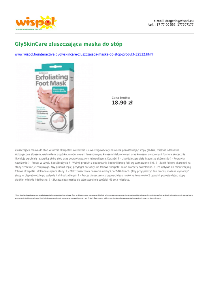e-mail: [email protected] tel. : 17 77 00 557, 177707177 GlySkinCare złuszczająca maska do stóp www.wispol.tiointeractive.pl/glyskincare-zluszczajaca-maska-do-stop-produkt-32532.html Cena brutto: 18.90 zł Złuszczająca maska do stóp w formie skarpetek skutecznie usuwa zrogowaciały naskórek pozostawiając stopy gładkie, miękkie i delikatne. Wzbogacona aloesem, ekstraktem z ogórka, miodu, olejem lawendowym, kwasem hialuronowym oraz kwasami owocowymi formuła skutecznie likwiduje zgrubiałą i szorstką skórę stóp oraz poprawia poziom jej nawilżenia. Korzyści ? - Likwiduje zgrubiałą i szorstką skórę stóp ? - Poprawia nawilżenie ? - Prosta w użyciu Sposób użycia ? - Wyjmij produkt z opakowania i odetnij brzeg folii wg zaznaczonej linii. ? - Załóż foliowe skarpetki na stopy szczelnie je zamykając. Aby produkt lepiej przylegał do skóry, na foliowe skarpetki załóż skarpety bawełniane. ? - Po upływie 40 minut zdejmij foliowe skarpetki i dokładnie opłucz stopy. ? - Efekt złuszczania naskórka nastąpi po 7-10 dniach. (Aby przyspieszyć ten proces, możesz wymoczyć stopy w ciepłej wodzie po upływie 4 dni od zabiegu). ? - Proces złuszczania zrogowaciałego naskórka trwa około 2 tygodni, pozostawiając stopy gładkie, miękkie i delikatne. ? - Złuszczającą maskę do stóp stosuj nie częściej niż co 3 miesiące. *Ceny obowiązują wyłącznie przy składaniu zamówień przez sklep internetowy. Ceny w sklepach mogą nieznacznie różnić się od cen prezentowanych na stronach sklepu internetowego. Przedstawiona oferta w sklepie internetowym nie stanowi oferty w rozumieniu Kodeksu Cywilnego, i jest jedynie zaproszeniem do rozpoczęcia rokowań (zgodnie z art. 71 k.c.). Zastrzegamy sobie prawo do niezrealizowania zamówień z ważnych przyczyn ekonomicznych.