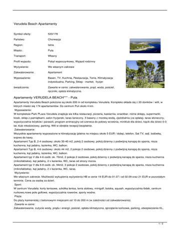 Verudela Beach Apartamenty Symbol oferty: 533/178 Państwo: Chorwacja Region: Istria Miasto: Pula Transport: Własny Profil wyjazdu: Pobyt wypoczynkowy, Wyjazd rodzinny Wyżywienie: We własnym zakresie Zakwaterowanie: Apartament Wyposażenie: Basen, TV, Kuchnia, Restauracja, Tenis, Klimatyzacja świadczenia: Zawarte w cenie: zakwaterowanie, prąd, woda, pościel, indywidualna, Parking, Sklep - market, fryzjer ręczniki, opłata klimatyczna. Apartamenty VERUDELA BEACH*** - Pula Apartamenty Verudela Beach położone są około 200 m od kompleksu Verudela. Kompleks składa się z 20 domków / willi, w których mieści się 174 apartamentów. Do centrum Puli około 4 km. Wyposażenie: W kompleksie Park PLaza Verudela znajduje sie kilka restauracji, pizzeria, kawiarnia, snackbar, różne sklepy, supermarkt, kiosk, sklep z pamiątkami, salon fryzjerski, taras taneczny, 3 baseny z morską wodą, zjeżdżalnia (za opłatą), taras słoneczny, wypożyczalnia leżaków i parasoli, program animacyjny od czerwca do połowy września, miniklub dla dzieci, kącik dla dzieci 0-3 lat, klub młodzieżowy, parking. Wifi w obrębie recepcji bezpłatnie. Zakwaterowanie: Wszystkie apartamenty wyposażone w klimatyzację (płatna na miejscu około 5 EUR / dobę), telefon, Sat TV, sejf, lodówkę, expres do kawy. Apartament Typ B, 2-4 osobowy: około 30-40 m2, pokój 2 osobowy, pokój dzienny z podwójną kanapą do spania, nisza kuchenna, kąt jadalny, łazienka, WC, balkon. Apartament Typ B, 4-6 osobowy: około 44 m2, 2 pokoje 2 osobowe, pokój dzienny z podwójną kanapą do spania, nisza kuchenna, kąt jadalny, łazienka, WC, balkon. Apartament typ V dla 4-6 osób: ok. 70m2, 2 pokoje 2 osobowe, pokój dzienny z podwójną kanapą do spania, nisza kuchenna (mikrofalówka), kąt jadalny, 2 x łazienka, WC, taras od strony morza. Apartament typ V dla 6-8 osób: ok. 94m2, 3 pokoje 2 osobowe, pokój dzienny z podwójną kanapą do spania, nisza kuchenna (mikrofalówka), kąt jadalny, 2 x łazienka, WC, taras. Wyżywienie: We własnym zakresie. Możliwość wykupienia wyżywienia HB w cenie 19 EUR do 01.07 i od 02.09 oraz 21 EUR w pozostałym terminie. Cena za osobę za dzień. Sport: W centrum Verudela: korty tenisowe, szkółka tenisa, tenis stołowy, minigolf, boiska, squash, wypożyczalnia łódek, centrum nurkowe,nowe pole golfowe, wypożyczalnia rowerów, sporty wodne. Plaża: Do plaży kamienistej z betonowymi miejscami od 10 do 200 m (w zależności od zakwaterowania). Zawarte w cenie: Zakwaterowanie, zużycie wody, prądu i energii, pościel, opłata klimatyczna, sprzątanie końcowe, parking, ubezpieczenie KL, 1/2 NW. TERMINY: od: 2017-04-22 do: 2017-04-29 (8 dni), miejsca: zamów cena od: 335 PLN = 81 EUR od: 2017-04-29 do: 2017-05-06 (8 dni), miejsca: zamów cena od: 335 PLN = 81 EUR od: 2017-05-06 do: 2017-05-13 (8 dni), miejsca: zamów cena od: 335 PLN = 81 EUR od: 2017-05-13 do: 2017-05-20 (8 dni), miejsca: zamów cena od: 446 PLN = 108 EUR od: 2017-05-20 do: 2017-05-27 (8 dni), miejsca: zamów cena od: 446 PLN = 108 EUR od: 2017-05-27 do: 2017-06-03 (8 dni), miejsca: zamów cena od: 446 PLN = 108 EUR od: 2017-06-03 do: 2017-06-10 (8 dni), miejsca: zamów cena od: 446 PLN = 108 EUR od: 2017-06-10 do: 2017-06-17 (8 dni), miejsca: zamów cena od: 446 PLN = 108 EUR od: 2017-06-17 do: 2017-06-24 (8 dni), miejsca: zamów cena od: 656 PLN = 158 EUR od: 2017-06-24 do: 2017-07-01 (8 dni), miejsca: zamów cena od: 656 PLN = 158 EUR od: 2017-07-01 do: 2017-07-08 (8 dni), miejsca: zamów cena od: 810 PLN = 195 EUR od: 2017-07-08 do: 2017-07-15 (8 dni), miejsca: zamów cena od: 810 PLN = 195 EUR od: 2017-07-15 do: 2017-07-22 (8 dni), miejsca: zamów cena od: 853 PLN = 206 EUR od: 2017-07-22 do: 2017-07-29 (8 dni), miejsca: zamów cena od: 853 PLN = 206 EUR od: 2017-07-29 do: 2017-08-05 (8 dni), miejsca: zamów cena od: 933 PLN = 225 EUR od: 2017-08-05 do: 2017-08-12 (8 dni), miejsca: zamów cena od: 933 PLN = 225 EUR od: 2017-08-12 do: 2017-08-19 (8 dni), miejsca: zamów cena od: 933 PLN = 225 EUR od: 2017-08-19 do: 2017-08-26 (8 dni), miejsca: zamów cena od: 933 PLN = 225 EUR od: 2017-08-26 do: 2017-09-02 (8 dni), miejsca: zamów cena od: 853 PLN = 206 EUR od: 2017-09-02 do: 2017-09-09 (8 dni), miejsca: zamów cena od: 656 PLN = 158 EUR od: 2017-09-09 do: 2017-09-16 (8 dni), miejsca: zamów cena od: 446 PLN = 108 EUR od: 2017-09-16 do: 2017-09-23 (8 dni), miejsca: zamów cena od: 335 PLN = 81 EUR od: 2017-09-23 do: 2017-09-30 (8 dni), miejsca: zamów cena od: 335 PLN = 81 EUR CENNIK: Długość pobytu: 8 dni 8 dni 8 dni 8 dni 8 dni 8 dni Grupa cenowa: F A D C E B 11 11 11 11 11 2.5 2.5 2.5 2.5 2.5 1475.6 1243.55 1511.3 916.3 934.15 755.65 987.7 529.55 1630.3 1398.25 1666 1011.5 737.8 589.05 779.45 386.75 797.3 636.65 833 440.3 (-) (-) (-) (-) Ubezpieczenie (obligatoryjne) (*) Ubezpieczenie KL, NW, SKI 11 (*) Turystyczny Fundusz Gwarancyjny 2.5 Pobyt w obiekcie (do wyboru) Ap. 4-6 MS typ B standardowo dla osób: 6 minimalnie: 1 1552.95 606.9 Ap. 4-6 typ B standardowo dla osób: 6 minimalnie: 1 1065.05 368.9 Apart. 6-8 os. standardowo dla osób: 8 minimalnie: 1 1707.65 660.45 (*) Ap. 2-4 os. standardowo dla osób: 4 minimalnie: 1 856.8 279.65 Ap.2-4 os. MS Typ B standardowo dla osób: 4 minimalnie: 1 910.35 333.2 Rodzaj osoby (do wyboru) (*) Uczestnik (-) (-) Waluta: EUR Aktualne ceny z systemu S.A.R.T. (-) - cena usługi, podatku kalkulowana przy osobie lub gratis (*) - kwota wliczona w cenę standardową 2/2