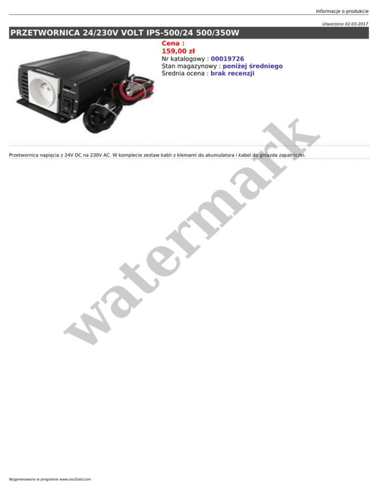 Informacje o produkcie Utworzono 02-03-2017 PRZETWORNICA 24/230V VOLT IPS-500/24 500/350W Cena : 159,00 zł er m ar k Nr katalogowy : 00019726 Stan magazynowy : poniżej średniego Średnia ocena : brak recenzji w at Przetwornica napięcia z 24V DC na 230V AC. W komplecie zestaw kabli z klemami do akumulatora i kabel do gniazda zapalniczki. Wygenerowano w programie www.oscGold.com