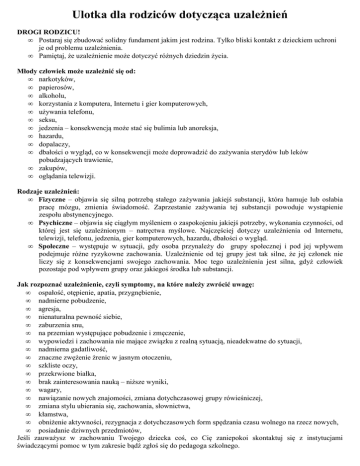 Ulotka dla rodziców dotycząca uzależnień DROGI RODZICU! • Postaraj się zbudować solidny fundament jakim jest rodzina. Tylko bliski kontakt z dzieckiem uchroni je od problemu uzależnienia. • Pamiętaj, że uzależnienie może dotyczyć różnych dziedzin życia. Młody człowiek może uzależnić się od: • narkotyków, • papierosów, • alkoholu, • korzystania z komputera, Internetu i gier komputerowych, • używania telefonu, • seksu, • jedzenia – konsekwencją może stać się bulimia lub anoreksja, • hazardu, • dopalaczy, • dbałości o wygląd, co w konsekwencji może doprowadzić do zażywania sterydów lub leków pobudzających trawienie, • zakupów, • oglądania telewizji. Rodzaje uzależnień: • Fizyczne – objawia się silną potrzebą stałego zażywania jakiejś substancji, która hamuje lub osłabia pracę mózgu, zmienia świadomość. Zaprzestanie zażywania tej substancji powoduje wystąpienie zespołu abstynencyjnego. • Psychiczne – objawia się ciągłym myśleniem o zaspokojeniu jakiejś potrzeby, wykonania czynności, od której jest się uzależnionym – natręctwa myślowe. Najczęściej dotyczy uzależnienia od Internetu, telewizji, telefonu, jedzenia, gier komputerowych, hazardu, dbałości o wygląd. • Społeczne – występuje w sytuacji, gdy osoba przynależy do grupy społecznej i pod jej wpływem podejmuje różne ryzykowne zachowania. Uzależnienie od tej grupy jest tak silne, że jej członek nie liczy się z konsekwencjami swojego zachowania. Moc tego uzależnienia jest silna, gdyż człowiek pozostaje pod wpływem grupy oraz jakiegoś środka lub substancji. Jak rozpoznać uzależnienie, czyli symptomy, na które należy zwrócić uwagę: • ospałość, otępienie, apatia, przygnębienie, • nadmierne pobudzenie, • agresja, • nienaturalna pewność siebie, • zaburzenia snu, • na przemian występujące pobudzenie i zmęczenie, • wypowiedzi i zachowania nie mające związku z realną sytuacją, nieadekwatne do sytuacji, • nadmierna gadatliwość, • znaczne zwężenie źrenic w jasnym otoczeniu, • szkliste oczy, • przekrwione białka, • brak zainteresowania nauką – niższe wyniki, • wagary, • nawiązanie nowych znajomości, zmiana dotychczasowej grupy rówieśniczej, • zmiana stylu ubierania się, zachowania, słownictwa, • kłamstwa, • obniżenie aktywności, rezygnacja z dotychczasowych form spędzania czasu wolnego na rzecz nowych, • posiadanie dziwnych przedmiotów, Jeśli zauważysz w zachowaniu Twojego dziecka coś, co Cię zaniepokoi skontaktuj się z instytucjami świadczącymi pomoc w tym zakresie bądź zgłoś się do pedagoga szkolnego.