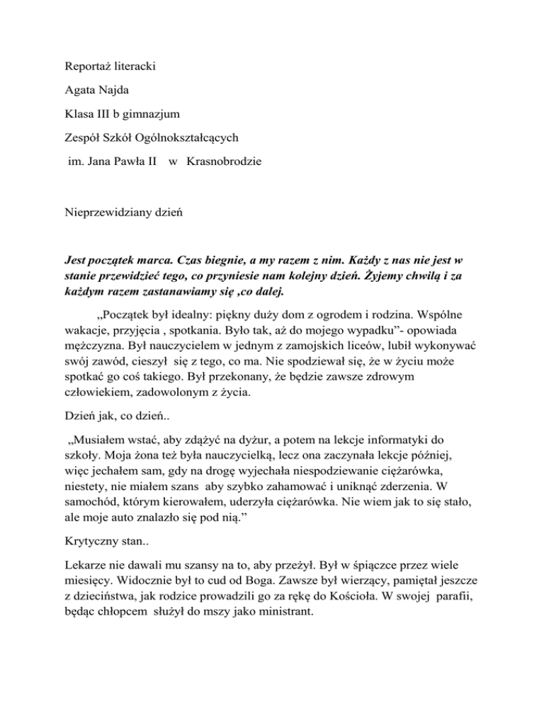 Reportaż literacki Agata Najda Klasa III b gimnazjum Zespół Szkół Ogólnokształcących im. Jana Pawła II w Krasnobrodzie Nieprzewidziany dzień Jest początek marca. Czas biegnie, a my razem z nim. Każdy z nas nie jest w stanie przewidzieć tego, co przyniesie nam kolejny dzień. Żyjemy chwilą i za każdym razem zastanawiamy się ,co dalej. „Początek był idealny: piękny duży dom z ogrodem i rodzina. Wspólne wakacje, przyjęcia , spotkania. Było tak, aż do mojego wypadku”- opowiada mężczyzna. Był nauczycielem w jednym z zamojskich liceów, lubił wykonywać swój zawód, cieszył się z tego, co ma. Nie spodziewał się, że w życiu może spotkać go coś takiego. Był przekonany, że będzie zawsze zdrowym człowiekiem, zadowolonym z życia. Dzień jak, co dzień.. „Musiałem wstać, aby zdążyć na dyżur, a potem na lekcje informatyki do szkoły. Moja żona też była nauczycielką, lecz ona zaczynała lekcje później, więc jechałem sam, gdy na drogę wyjechała niespodziewanie ciężarówka, niestety, nie miałem szans aby szybko zahamować i uniknąć zderzenia. W samochód, którym kierowałem, uderzyła ciężarówka. Nie wiem jak to się stało, ale moje auto znalazło się pod nią.” Krytyczny stan.. Lekarze nie dawali mu szansy na to, aby przeżył. Był w śpiączce przez wiele miesięcy. Widocznie był to cud od Boga. Zawsze był wierzący, pamiętał jeszcze z dzieciństwa, jak rodzice prowadzili go za rękę do Kościoła. W swojej parafii, będąc chłopcem służył do mszy jako ministrant. Moja rodzina „Najbardziej żal mi mojej rodziny, ponieważ to właśnie oni przeżyli początkowo największy szok i przerażenie. Teraz został mi jedynie brat, który jeszcze mnie odwiedza. Tak naprawdę nie wiem ,co bym bez niego zrobił, gdyż pozostał mi tylko on. Moja żona odeszła ode mnie po wypadku, a dzieci- Karol i Diana -też z pewnością mają już swoje życie. Odwiedzili mnie raz, dawno temu, lecz teraz nie wiem co u nich. Niedawno umarł mój tata, a moja mama nie utrzymuje już ze mną kontaktu, więc nie wiem, co u niej. Pomimo tego nadal bardzo ją kocham”. Nowe miejsce Po wypadku, po tej całej traumie i przeżyciach znalazł się w Domu Pomocy Społecznej w Krasnobrodzie. całe jego ciało jest sparaliżowane , więc jeździ na wózku inwalidzkim . Wymaga też stałej opieki, gdyż nie jest w stanie radzić sobie sam. Żyje ze świadomością, że nie jestem już tamtym człowiekiem, którym był przed wypadkiem. Jego zachowanie również się zmieniło. Osoba po wypadku zachowuje się inaczej, więc może to początkowo przerażać inne osoby. Jednak większość to rozumie i rozumie i wspiera takie osoby jak pan Adam, w tym, co przeżyły. Nowe życie „Moje życie wygląda teraz inaczej, zdążyłem się do tego przyzwyczaić. Jednak cieszę się, że nie jestem sam. Ważne dla mnie jest to, że pozostał mi jeszcze brat, który mnie odwiedza i dużo opowiada o świecie, cieszę się , że mogłem poznać też inne osoby, który przeżyły podobną sytuację do mojej. Dziękuje każdego dnia Bogu za to, co mam. Dziękuję za to ,że mam gdzie mieszkać i nie pozostałem sam. Zostałem otoczony przyjaznymi dla mnie osobami, na które zawsze mogę liczyć. Jedynie żałuję, że kontakt z moimi dziećmi zaginął. Moim marzeniem jest to, żeby jeszcze kiedyś je zobaczyć i z nimi porozmawiać, o tym, jak żyją. Wiem jedynie tylko o nich to, że udało im się skończyć studia, więc moje dawne marzenie z pewnością się spełniło”. Inny świat „Jak wyglądałoby życie, gdyby wypadek się nie zdarzył ? Często zadaję sobie to pytanie. Czy byłoby lepsze? Może byłoby znacznie gorsze? Może mój los potoczyłby się całkiem inaczej. Może byłbym całkiem innym człowiekiem. Myślałbym tylko o sobie i o swojej karierze. Byłbym człowiekiem zadufanym w sobie nie potrafiącym współczuć innym. Lecz co dalej??” Inne osoby „W mediach ciągle słyszę o różnych osobach, które potrzebują pomocy i niekoniecznie są to tylko ludzie po wypadkach samochodowych, lecz na przykład, dzieci, które cierpią na różne, czasem nieznane lekarzom choroby. To właśnie je każdy z nas powinien wpierać i pomagać im”. Dzisiaj „Myślę, że moje życie nie jest najgorsze. Ważne jest to, że żyję. Sądzę, że i tak wiele osiągnąłem, w końcu byłem informatykiem ; chciałem nim zostać od dzieciństwa. Byłem szczęściarzem, który potrafił zyskać tak wiele w tak krótkim czasie. Lecz może nie potrafiłem kiedyś tak bardzo docenić tego, co miałem?” Widocznie tak miało potoczyć się jego życie, bo przecież: ,, Co nam pisane , nigdzie zapisane nie jest /Zbyt nagle się dzieje i nieprzewidziane”, jak w wierszu Urszuli Kozioł.