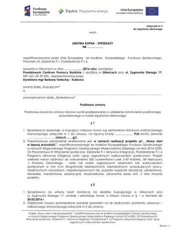 55 Załącznik nr 2 do Zapytania ofertowego -wzórUMOWA KUPNA - SPRZEDAŻY NR ……………. współfinansowana przez Unię Europejską ze środków Europejskiego Funduszu Społecznego, Priorytetu IX, Działania 9.1, Poddziałania 9.1.6. zawarta w Gliwicach w dniu ……………….2016 roku pomiędzy: Powiatowym Centrum Pomocy Rodzinie z siedzibą w Gliwicach przy ul. Zygmunta Starego 17, NIP: 631-22-39-300, reprezentowaną przez: Dyrektora mgr Barbarę Terlecką - Kubicius zwaną dalej „Kupującym” a ……….……………………………………..……..................................................................................................................... zwaną/zwanym dalej „Sprzedawcą”. Podstawa umowy Podstawę zawarcia umowy stanowi wynik postępowania o udzielenie zamówienia publicznego prowadzonego w trybie zapytania ofertowego §1 1. Sprzedawca sprzedaje, a Kupujący nabywa towar wg zestawienia ilościowo-wartościowego stanowiącego załącznik nr 1 do umowy, na łączną kwotę ……………… PLN brutto (słownie ………………………. złotych ...... gr). 2. Przedmiotowe zamówienie realizowane jest w ramach realizacji projektu pt.: „Nowy start w lepszą przyszłość”, współfinansowanego ze środków Europejskiego Funduszu Społecznego w ramach Regionalnego Programu Operacyjnego Województwa Śląskiego na lata 2014-2020, Oś Priorytetowa IX Włączenie społeczne, Działanie 9.1 Aktywna integracja, Poddziałanie 9.1.6 Programy aktywnej integracji osób i grup zagrożonych wykluczeniem społecznym. Projekt zakłada wzrost zdolności do zatrudnienia 200 uczestników/-czek (142 Kobiety, 58 Mężczyzn) z Powiatu Gliwickiego - osób lub rodzin zagrożonych ubóstwem lub wykluczeniem społecznym w tym m.in długotrwale bezrobotnych, bezrobotnych, poszukujących pracy, nieaktywnych zawodowo, niepełnosprawnych itp. poprzez wsparcie doradcze, szkoleniowe, trenerskie, warsztatowe, edukacyjne, środowiskowe, zdrowotne przez min. 2 lata trwania projektu. §2 1. Sprzedawca na własny koszt dostarczy do siedziby Kupującego w Gliwicach przy ul. Zygmunta Starego 17, wniesie i zainstaluje towar, o którym mowa w § 1 w terminie do 30.03.2016 r. 2. Odebranie towaru potwierdzone zostanie spisaniem na tę okoliczność protokołu zdawczo – odbiorczego stanowiącego załącznik nr 2 do umowy. Projekt „Nowy start w lepszą przyszłość” współfinansowany jest ze środków Europejskiego Funduszu Społecznego w ramach Regionalnego Programu Operacyjnego Województwa Śląskiego na lata 2014-2020, Oś Priorytetowa IX Włączenie społeczne, Działanie 9.1 Aktywna integracja, Poddziałanie 9.1.6 Programy aktywnej integracji osób i grup zagrożonych wykluczeniem społecznym Strona -1- 55 §3 1. Kupujący zapłaci Sprzedawcy za dostarczony towar – przelewem, na jego konto wskazane na rachunku/fakturze - w terminie 14 dni od dnia otrzymania rachunku/faktury wraz z protokołem odbioru, stanowiącym załącznik nr 2 do umowy, 2. Kupujący zobowiązuje się zapłacić za dostarczony towar w terminie określonym w ust. 1, z zastrzeżeniem dostępności na rachunku bankowym Zamawiającego środków na finansowanie działań realizowanych w Projekcie, o którym mowa w § 1 ust. 2 umowy, przekazywanych przez Instytucję Zarządzającą. 3. W przypadku zmiany terminów wpłaty transz środków finansowych przez Instytucję Zarządzającą, którą jest Urząd Marszałkowski Województwa Śląskiego, w wyniku której nastąpi opóźnienie terminu wypłaty należności, Sprzedawca oświadcza, iż zrzeka się odsetek z tytułu opóźnienia wypłaty należności. §4 1. Sprzedawca zapewnia gwarancję typu door to door / on site next business day 1 za zakupiony towar na okres 24 miesięcy. 2. W przypadku, gdy po pierwszej naprawie towary nadal będą wykazywały wady, Sprzedawca wymieni wadliwe towary na inne, w terminie 3 dni od daty wezwania go przez Kupującego do wymiany towaru, bez żadnej dopłaty, nawet gdyby w międzyczasie ich ceny uległy podwyżce. 3. Sprzedawca będzie dokonywał napraw gwarancyjnych na miejscu u Kupującego, w ciągu 3 dni od zgłoszenia wady. 4. W przypadku nie usunięcia wad w określonym wyżej terminie, Kupujący będzie uprawniony do usunięcia tych wad na koszt Sprzedawcy. §5 1. Sprzedawca zapłaci Kupującemu kary umowne z następujących tytułów: 1) za opóźnienie w wykonaniu przedmiotu umowy w wysokości 0,1% wartości zamówienia za każdy dzień zwłoki, 2) z tytułu odstąpienia od umowy z przyczyn niezależnych od Kupującego w wysokości 5% wartości zamówienia, 3) za opóźnienie w usunięciu wad stwierdzonych przy odbiorze w wysokości 0,1% wartości zamówienia za każdy dzień zwłoki liczony od upływu terminu wyznaczonego na usunięcie wad, 4) za niewydanie towaru wolnego od wad w zamian towaru wadliwego (§ 4, ust. 2) w wysokości 0,1% wartości zamówienia za każdy dzień opóźnienia. 2. Kupujący może dochodzić na zasadach ogólnych odszkodowania przewyższającego zastrzeżone kary umowne. Projekt „Nowy start w lepszą przyszłość” współfinansowany jest ze środków Europejskiego Funduszu Społecznego w ramach Regionalnego Programu Operacyjnego Województwa Śląskiego na lata 2014-2020, Oś Priorytetowa IX Włączenie społeczne, Działanie 9.1 Aktywna integracja, Poddziałanie 9.1.6 Programy aktywnej integracji osób i grup zagrożonych wykluczeniem społecznym Strona -2- 55 §6 1. Załączniki do umowy nr 1 „ Zestawienie ilościowo wartościowe” oraz nr 2 „ Protokół zdawczo – odbiorczy „, stanowią integralną część umowy. 2. Wszelkie zmiany i uzupełnienia niniejszej umowy wymagają aneksu w formie pisemnej. 3. W sprawach nieuregulowanych niniejszą umową mają zastosowanie przepisy Kodeksu cywilnego. 4. Ewentualne spory wynikłe na tle niniejszej umowy będą rozpoznawane przez właściwy rzeczowo Sąd powszechny w Gliwicach. §7 Umowę sporządzono w dwóch jednobr