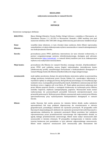 REGULAMIN nabywania neoznaczka w ramach Envelo §1 DEFINICJE Zmieniono następujące definicje: BOK PPUC: Biuro Obsługi Klientów Poczta Polska Usługi Cyfrowe z siedzibą w Warszawie, ul. Stanisława Żaryna 2 C, 02-593 w Warszawie. Kontakt z BOK możliwy jest pod numerem telefonu: 801 500 200 i drogą elektroniczną pod adresem: [email protected]. Dane wszelkie dane tekstowe, w tym również dane osobowe, które Klient wprowadza samodzielnie w trakcie dokonywania wyboru neoznaczka w ramach udostępnionych mu funkcjonalności Envelo. Klienta: Envelo: prowadzona przez PPUC platforma internetowa (w tym również webserwis), w postaci zorganizowanego systemu teleinformatycznego, dostępna pod adresem internetowym http://envelo.pl/, w ramach której możliwe jest m.in. dokonywanie wyboru oraz nabywanie neoznaczków. Moje konto: prowadzone dla Klienta (w ramach Envelo), zwanego również „Użytkownikiem”, przez PPUC pod unikalną nazwą (login) indywidualne, interaktywne konto (elektroniczny profil), umożliwiające korzystanie z funkcjonalności dostępnych w ramach Mojego konta dla Klienta (Użytkownika) do niego zalogowanego. neoznaczek: znak opłaty pocztowej, słuzący do potwierdzenia uiszczenia opłaty za powszechną usługę pocztową swiadczoną przez Pocztę Polską S.A., zawierający informację o wysokosci opłaty za usługę pocztową, Kod graficzny pozwalający na weryfikację jego waznosci oraz, w przypadku przesyłek poleconych, dodatkowo umieszczany jest kod kreskowy wraz z ciągiem cyfr oraz litera „R”. Znak opłaty pocztowej nabywany jest przez Klienta poprzez Envelo, a następnie drukowany na wybranym przez Klienta nosniku: kopercie, etykiecie samoprzylepnej, papierze. Neoznaczek może zostać wykorzystany do powszechnych przesyłek listowych nierejestrowanych oraz przesyłek poleconych. Wybrany przez Klienta neoznaczek może zostać przez Klienta spersonalizowany przy wykorzystaniu funkcjonalności dostępnych w ramach Envelo. Klient: osoba fizyczna lub osoba prawna (w imieniu której działa osoba należycie upoważniona) lub inny podmiot dopuszczony do uczestniczenia w obrocie gospodarczym, posiadający zdolność do czynności prawnych. W przypadku osób fizycznych nieposiadających zdolności do czynności prawnych lub osób fizycznych z ograniczoną zdolnością do czynności prawnych Klient powinien być należycie reprezentowany przez przedstawiciela ustawowego lub odpowiednio działać za zgodą takiego przedstawiciela ustawowego. Klient może nabyć neoznaczek (lub neoznaczki) w imieniu własnym. W przypadku występowania w imieniu osoby trzeciej konieczne jest posiadanie w tym zakresie odpowiedniego umocowania. Klient może nabywać neoznaczek (lub neoznaczki) jako Konsument lub Strona 1 z 20 Przedsiębiorca. W powyższym celu Klient w trakcie nabywania neoznaczka (-ów) proszony jest o odpowiednie określenie swojego statusu. Kod graficzny: kod graficzny („data matrix”) zdefiniowany zgodnie z warunkami kodowania przewidzianymi dla cyfrowego znaku opłaty pocztowej, zaszyfrowany i podpisany elektronicznie, identyfikujący neoznaczek poprzez zapisanie w nim podstawowych informacji obejmujących co najmniej: numer identyfikacyjny, nominał oraz datę jego ważności. Kod graficzny jest podstawowym elementem identyfikującym ważność danego neoznaczka. Kod kreskowy: Kod kreskowy wraz z ciągiem cyfr oraz umieszczoną literą „R” jest zdefiniowany zgodnie z warunkami kodowania przewidzianymi dla numeru nadania przesyłki poleconej. Kod kreskowy umożliwia identyfikację przesyłki poleconej przez skanery elektroniczne. Konsument: Klient będący konsumentem w rozumieniu art. 22 (1) Kodeksu cywilnego. Operator Płatności Elektronicznych: podmiot dokonujący autoryzacji, czyli potwierdzenia, że osoba posługująca się daną kartą płatniczą lub kontem bankowym jest uprawniona do dokonania płatności (np. posiada wystarczające środki na koncie), a także rozliczania i przetwarzania transakcji, którym jest firma eCard S.A. z siedzibą w Gdańsku 80-387, przy ul. Arkońskiej 11, wpisana do rejestru przedsiębiorców prowadzonego przez Sąd Rejonowy Gdańsk-Północ w Gdańsku VII Wydział Gospodarczy KRS pod numerem 0000042304, kapitał zakładowy 16 840 000 zł (w całości wpłacony), NIP: 5213103040. PPUC: Poczta Polska Usługi Cyfrowe Sp. z o.o. z siedzibą w Warszawie, ul. Stanisława Żaryna 2 C, 02-593 Warszawa, wpisaną do Rejestru Przedsiębiorców prowadzonego przez Sąd Rejonowy dla m. st. Warszawy w Warszawie, XIII Wydział Gospodarczy Krajowego Rejestru Sądowego, pod numerem KRS: 0000425263, kapitał zakładowy 11 000 000,00 zł, NIP: 525-25-33-454. Poczta Poczta Polska Spółka Akcyjna z siedzibą w Warszawie (adres: ul. Stawki 2, 00-940 Warszawa) wpisana do Rejestru Przedsiębiorców prowadzonego przez Sąd Rejonowy dla m.st. Warszawy w Warszawie, XII Wydział Gospodarczy Krajowego Rejestru Sądowego, pod numerem KRS 0000334972, kapitał zakładowy 774 140 000 zł. (w całości wpłacony), NIP: 525-000-73-13 – przedsiębiorca uprawniony do wykonywania działalności pocztowej na podstawie wpisu do rejestru operatorów pocztowych, zgodnie z Ustawą z dnia 23 listopada 2012 r. Prawo pocztowe (Dz.U. z 2012 r. poz. 1529). Polska S.A.: System Informatyczny: Umowa: system teleinformatyczny pozostający w dyspozycji PPUC, wykorzystywany w celu oferowania neoznaczków do nabycia, obejmujący w szczególności sprzęt komputerowy, serwery, urządzenia peryferyjne oraz oprogramowanie. umowa nabycia neoznaczka zawarta drogą elektroniczną pomiędzy PPUC a Klientem przy wykorzystaniu Envelo. Umowy zawierane są z Klientami posiadającymi status Konsumenta albo Przedsiębiorcy. Wyłącznie w stosunku do Klientów posiadających status Przedsiębiorcy w celu zawarcia Umowy konieczny jest wymóg posiadania Strona 2 z 20 miejsca zamieszkania lub siedziby na terytorium Rzeczypospolitej Polskiej. PPUC informuje, że w zależności od wyboru 