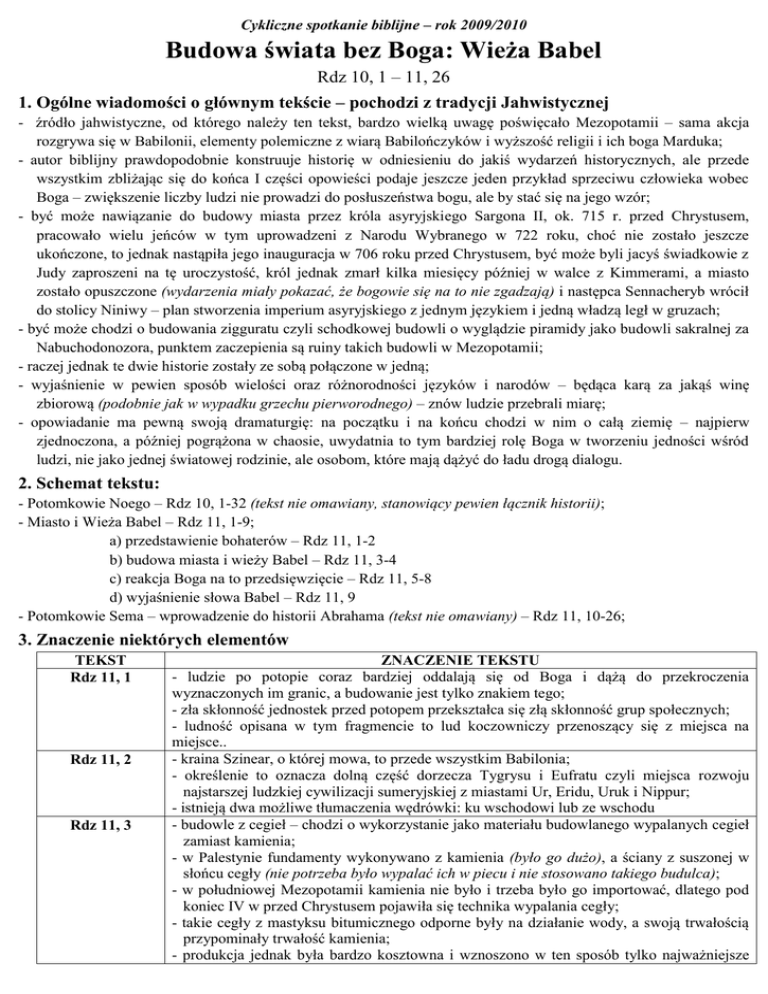 Cykliczne spotkanie biblijne – rok 2009/2010 Budowa świata bez Boga: Wieża Babel Rdz 10, 1 – 11, 26 1. Ogólne wiadomości o głównym tekście – pochodzi z tradycji Jahwistycznej - źródło jahwistyczne, od którego należy ten tekst, bardzo wielką uwagę poświęcało Mezopotamii – sama akcja rozgrywa się w Babilonii, elementy polemiczne z wiarą Babilończyków i wyższość religii i ich boga Marduka; - autor biblijny prawdopodobnie konstruuje historię w odniesieniu do jakiś wydarzeń historycznych, ale przede wszystkim zbliżając się do końca I części opowieści podaje jeszcze jeden przykład sprzeciwu człowieka wobec Boga – zwiększenie liczby ludzi nie prowadzi do posłuszeństwa bogu, ale by stać się na jego wzór; - być może nawiązanie do budowy miasta przez króla asyryjskiego Sargona II, ok. 715 r. przed Chrystusem, pracowało wielu jeńców w tym uprowadzeni z Narodu Wybranego w 722 roku, choć nie zostało jeszcze ukończone, to jednak nastąpiła jego inauguracja w 706 roku przed Chrystusem, być może byli jacyś świadkowie z Judy zaproszeni na tę uroczystość, król jednak zmarł kilka miesięcy później w walce z Kimmerami, a miasto zostało opuszczone (wydarzenia miały pokazać, że bogowie się na to nie zgadzają) i następca Sennacheryb wrócił do stolicy Niniwy – plan stworzenia imperium asyryjskiego z jednym językiem i jedną władzą legł w gruzach; - być może chodzi o budowania zigguratu czyli schodkowej budowli o wyglądzie piramidy jako budowli sakralnej za Nabuchodonozora, punktem zaczepienia są ruiny takich budowli w Mezopotamii; - raczej jednak te dwie historie zostały ze sobą połączone w jedną; - wyjaśnienie w pewien sposób wielości oraz różnorodności języków i narodów – będąca karą za jakąś winę zbiorową (podobnie jak w wypadku grzechu pierworodnego) – znów ludzie przebrali miarę; - opowiadanie ma pewną swoją dramaturgię: na początku i na końcu chodzi w nim o całą ziemię – najpierw zjednoczona, a później pogrążona w chaosie, uwydatnia to tym bardziej rolę Boga w tworzeniu jedności wśród ludzi, nie jako jednej światowej rodzinie, ale osobom, które mają dążyć do ładu drogą dialogu. 2. Schemat tekstu: - Potomkowie Noego – Rdz 10, 1-32 (tekst nie omawiany, stanowiący pewien łącznik historii); - Miasto i Wieża Babel – Rdz 11, 1-9; a) przedstawienie bohaterów – Rdz 11, 1-2 b) budowa miasta i wieży Babel – Rdz 11, 3-4 c) reakcja Boga na to przedsięwzięcie – Rdz 11, 5-8 d) wyjaśnienie słowa Babel – Rdz 11, 9 - Potomkowie Sema – wprowadzenie do historii Abrahama (tekst nie omawiany) – Rdz 11, 10-26; 3. Znaczenie niektórych elementów TEKST Rdz 11, 1 Rdz 11, 2 Rdz 11, 3 ZNACZENIE TEKSTU - ludzie po potopie coraz bardziej oddalają się od Boga i dążą do przekroczenia wyznaczonych im granic, a budowanie jest tylko znakiem tego; - zła skłonność jednostek przed potopem przekształca się złą skłonność grup społecznych; - ludność opisana w tym fragmencie to lud koczowniczy przenoszący się z miejsca na miejsce.. - kraina Szinear, o której mowa, to przede wszystkim Babilonia; - określenie to oznacza dolną część dorzecza Tygrysu i Eufratu czyli miejsca rozwoju najstarszej ludzkiej cywilizacji sumeryjskiej z miastami Ur, Eridu, Uruk i Nippur; - istnieją dwa możliwe tłumaczenia wędrówki: ku wschodowi lub ze wschodu - budowle z cegieł – chodzi o wykorzystanie jako materiału budowlanego wypalanych cegieł zamiast kamienia; - w Palestynie fundamenty wykonywano z kamienia (było go dużo), a ściany z suszonej w słońcu cegły (nie potrzeba było wypalać ich w piecu i nie stosowano takiego budulca); - w południowej Mezopotamii kamienia nie było i trzeba było go importować, dlatego pod koniec IV w przed Chrystusem pojawiła się technika wypalania cegły; - takie cegły z mastyksu bitumicznego odporne były na działanie wody, a swoją trwałością przypominały trwałość kamienia; - produkcja jednak była bardzo kosztowna i wznoszono w ten sposób tylko najważniejsze Rdz 11, 4 Rdz 4, 5 Rdz 4, 8 Rdz 11, 9 budynki publiczne. - pierwszym problemem jest URBANIZACJA: - Sumerowie zakładali już w Mezopotamii miasta na początku III wieku przed Chrystusem; - miasta nie służyły mieszkaniu ludzi, ale obejmowały budynki publiczne, światy nie i spichlerze otoczone murem (ludność w większości była jeszcze koczownicza); - początkowo władze sprawowała starszyzna świątynna, więc nie były potrzebne budowle państwowo, ale mogły istnieć rezydencje urzędników; - z czasem budowa miast stała się strategią zapobiegania rozproszeniu ludzi, dawało większe możliwości jeśli chodzi o nawadnianie ziemi i nabywanie nadwyżek złota (do trudności związanych z koczowniczym trybem życia nawiązuje historia Abrahama i Lota – Rdz 13); - drugim jest WIEŻA – to symbol świętej góry, jako miejsca wypoczynku bóstw; - zigguraty stanowiły środek do spotkania się ze swoim bogiem; - często budowle świątynne same w sobie stanowiły miasto lub były jego punktem szczególnym, wokół którego organizowało się życie; - zigguraty miały być elementami podtrzymującymi schody z nieba, po których schodziły bóstwa, aby w poświęconej sobie świątyni udzielić ludziom błogosławieństwa lub ich posłańcy, aby objawić ludziom jakieś prawdy; - zigguraty budowane były wewnętrznym szkieletem z cegły wypalanej na słońcu, a wewnątrz wypełniane ziemią i gruzem, na zewnątrz stosowano cegłę wypalaną w piecu; - nie było tam jakiś specjalnych pomieszczeń, a jedynie na szczycie znajdowała się komnata dla bóstwa z łóżkiem i stołem z wciąż świeżym pokarmem – wolno tam było wchodzić tylko kapłanom z dostarczanym świeżym jedzeniem - element schodów pojawia się w mitologii sumeryjskiej oraz w śnie Jakuba (por. Rdz 28, 12); - może to być bezpośrednie nawiązanie do wieży mar duka w cent