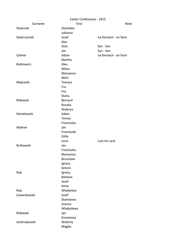 Surname Stawniak Swierczynski Celmer Butkiewicz Majewski Ritlewski Danielewski Wykner Rutkowski Rajs Rajs Lewandowski Ritlewski Jendrzejewski Easter Confessions - 1915 First Note Stanislaw Julianna Jozef na farmach - on farm Apa. Stan. Syn - Son Jan Syn - Son Adam na farmach - on farm Martha Alex. Wikta Maryanna Mich. Tomasz Fra. Fra. Stana. Bernard Rozalia Walerya Adam Teresa Franciszka Jan Franciszek Zofia Leon Lost his card Jan Franciszka Maryanna Bronislaw Ignacy Antoni Ignacy Barbara Jozef Anna Wladyslaw Jozef Stanislawa Joanna Wladyslawa Jan Konstanya Walenty Magda. Gorzynski Gorney Pieniaszek Kaczynska Wasielewska Witkowska Wasielewski Ruchaj Olszewski Jaworski Gorzynski Guzinski Majewski Julianna Julian Katarzyna Jozef Izydor Leon Walenty II Elizbieta Jan Helena Stefan Ludwik Zofia Jozefa Jadwiga Antonia Jan Franc. Helena Stanislaw Zofia Wladyslawa Wlad. Boleslaw Wojciech Adam Teresa Jan Franciszka Katarzyna Franciszek Rozalia Franciszek Jan Paulina Jadwiga Maryanna Jozef Antoni Leon Franciszek Maryanna Teresa Kazimierz Agnieszka Leon Lucya stora (blind) Ojciec - Father Syn - Son Kwiatkowski Norkowski Kwiatkowski Dabrowski Pawlaczyk Pawlaczyk Marciszewski Judkiewicz Krysinski Sztuczko Stawniak Jaskiewicz Ciesielska Szymkowiak Marcin Rozalia Franciszek Leon Jan Katarzyna Szczepan Franciszek Maryanna Izydor Leon Stan. Mateusz Agnieszka Wladyslaw Maciej Magdalena Marcin Piotr Franciszka Dominik Jozef Aniela Franciszek Apollonia Anna Bronislaw Jozef Anna Maryanna Lucya Kazimierz Barbara Walenty Jozefa Pelagia Jan Ludwik Piotr Maryanna Wikta. Wala. Franciszka Franc. Wlad. Antoni Stanislawa Lewandowski Jendrzejewski Kuligowski Gorzynski Luczak Gorzynski Kapela Sadowski Gruszczynski Rydlewski Czarchorowska Telga Sadowski Jan Jozefa Adam Marta Maryanna Joanna Anastazya Adam Marcin Maryanna Franciszek Julia Marcjan Katarzyna Wojciech Helena Jan Teofil Melania Stan. Mich. Mar. Wojciech Jozefa Helena Marta Jan Michal Tomasz Apa. Leon Lucja Stana. Mich. Wera. Max. Wala. Marciej Marya Adam Kal. Anna Leon Jan Brona. Jan Anasta. Cichocki Furmanska Romanowski Danielewski Jadwdzewska Sledzik Celmer Kwiatkowski Ugorek Pawlaczyk Pieniaszek Bilicki Danielewski Marta Fran. Zofia Leon Jan Maks. Franciszek Marya Jozef Jadwiga Marya Ant. Franca Stan. Wlad. Stan. Wikta. Zofia Rozalia Lukasz Apollonia Franciszka Stanislaw Prakzeda Floryan Kasimierz Katarzyna Wojciech Maryanna Boleslaw Szczpan Weronika Bronislawa Stan. Jan Tomasz Wlada. Ignacy Aeiela Jan Leokadya Cecylia Antoni Micha. Ignacy Andrzej Marya Chiwelewska Kaminski Ciesinski Janus Wojicieczak Wisniewski Wieczorek Mikolajewski Wisniewski Nowicki Jaworski Ciesielski Dabkowski Lewandowski Kwiatkowski Marya Walenty Marcin Tekla Pawel Rozalia Stanis. Marta Helena Jozef Stanislaw Franc Joanna Apollonia Antoni Katarzyna Helena Marta Franciszek Jozef Maryanna Jan Rozalia Anasta. Marcin Walerya Lambert Walerya Wawrszyn Jozefa Helena Joanna Wlad. Mich. Mich. Cecylia Jozef Joanna Jan Kazimierz Rozalia Walerya Wawrszyn Rozalia Michal Bronislaw Piotr un farmach Graczyk Jaskulski Pastwikowski Telga Kosmowska Nejman Gorney Starweather Gotowa Sledzinska Aniolowska Pulkownik Wydrzewski Ewino Zeglarska Appolonia Cecylia Jan Ignacy Franciszek Maryanna Franciszek Adam Enoa? Antoni Elzbieta Walenty Marya Melaw. Leokadya Szczpan Teofila Franciszka Stanislaw Jozef Apollonia Jan Stanislawa Boleslaw Walenty I Agniska Jan Maryanna Franciszka Maryanna Jakob Walerya Weronika Maryanna Andrzej Maryanna Jozefa Wladyslaw Helena Jan Mateusz Maryanna Leokadya Boleslaw Antonia Marta Maryanna Rice Rice Radac Rucki Witkowski Gorney Brucki Ciszek Depczynski Lubomski Sledzinski Danielewski Kaniecka Kwiatkowski Kurzawski Stanley Pelagia Antoni Rozalia Edward Salaem? Elizbieta Wlada. Franciszek Ignacy Anna Rozalia Leon Bronislawa Wladyslaw Joanna Wojciech Franciszka Boleslaw Franciszek Martha Franciszek Rozalia Franciszek Fra. Jan Franciszka Franciszek Maryanna Szczpan Rozalia Ludwik Agnieszka Maryanna Franciszka Stanislaw Jan Wladyslaw Stanislaw Prakseda Franciszek Anastazya Jan Franciszek Bronislawa Wladyslaw Antoni 17 Kwiatkowski Zwiewska Karlowski Wojcieszak Radzimski Karlowski Kryzinski Magier Mager Magier Kuzmierska Podlewski Ciszek Furmanski Jaworski Nowicki Franciszek Maryanna Wladyslaw Franciszek Antoni Helena Franciszek Helena Stanislaw Maryanna Jan Maryanna Antoni Katarzyna Antoni Rozalia Wladyslaw Zofia Alojzy Antoni Feliks Bronislawa Maryanna Jan Bernard Marta Teodor Maryanna Roman Franciszka Boleslawa Alfons Alexander Zofia Olympia Florentyna Jozef Maryanna Weronika Maryanna Marta Leon Franciszek Matylda Jendrzej Jozef Kazimierz na pewno nie byl - certainly was not Orlowicz Gurzinski Juzwiak Sterczynski Kroska Jasniewski Marcinewska McCabe Brucki Labewski Jablonsi Piatek Lubawy Maryanna Antoni Maryanna Anastazya Maryanna Wlendyslawa Isabella Jan Maryanna Jan Michalina Elizbieta Teresa Zofia Wlad Tomasz Agneszka Bronislawa Leokadya Zofia Jan Maryanna Franciszek Zofia Maryanna Zusanna Franciszka Wlada. Helena Pawel Jan Stanislawa Michal Josef Agata Michal Magdalena Jan Stefania Bronislawa Rozalia Helena Weronika Piotr Agneszka Pelagia Maryanna Syn - Son Borkowski Juzwiak Szule Kaniecki Lukazik Markowski Radzimski Radzimski Zwiewka Olszewski Franciszek Stefan Franciszek Marta Maryanna Jan Bernard Franciszek Anna Agneszka Franciszek Marya Weronika Wojciech Julia Wlad Joanna Maryanna Marta Luceja Marcin Aulmina Wlad. Ignacy Aulmina Jan Hel. Bel. Franc. Marya Wladyslaw Maryanna Anasta. Fra. Jan Marta Bronislawa Klara Zofia Fra. Marta Maryanna Michal Anasta. Fra. Wla. Marta Babunia - Grandmother Nejman Norkowski Ciesienski Szybanski Witkowski Maniewski Stawniak Kurzawski Blissett Sterczynski Gorzynski Zwiewka Mikolajewski Furmamski Balcarczyk Salwicki Jasniewski Danielewski Nowicka Kanieski Franciszek Zofia Anna Stanisl. Marcyanna Tomasz Konstanty Maryanna Brona Adam Wincenty Szczpan Rozalia Franciszek Walerya Michal Jan Maryanna Franciszek Pelagia Franciszek Arthur Anastazya St