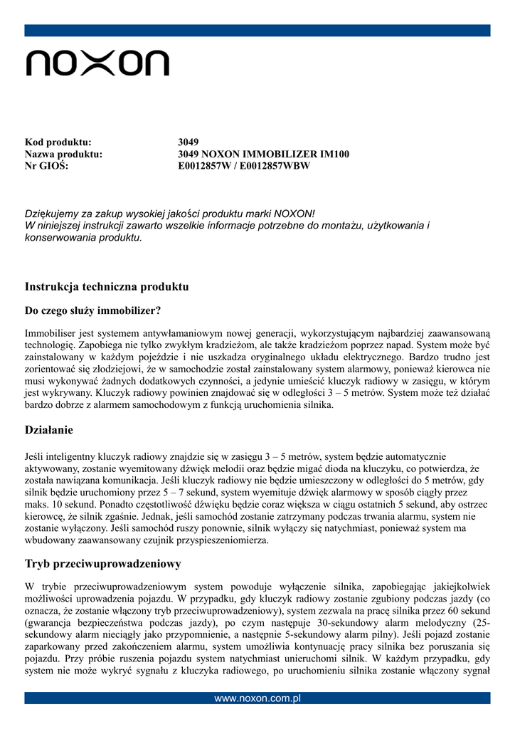 Kod produktu: Nazwa produktu: Nr GIOŚ: 3049 3049 NOXON IMMOBILIZER IM100 E0012857W / E0012857WBW Dziękujemy za zakup wysokiej jako ści produktu marki NOXON! W niniejszej instrukcji zawarto wszelkie informacje potrzebne do montażu, użytkowania i konserwowania produktu. Instrukcja techniczna produktu Do czego służy immobilizer? Immobiliser jest systemem antywłamaniowym nowej generacji, wykorzystującym najbardziej zaawansowaną technologię. Zapobiega nie tylko zwykłym kradzieżom, ale także kradzieżom poprzez napad. System może być zainstalowany w każdym pojeździe i nie uszkadza oryginalnego układu elektrycznego. Bardzo trudno jest zorientować się złodziejowi, że w samochodzie został zainstalowany system alarmowy, ponieważ kierowca nie musi wykonywać żadnych dodatkowych czynności, a jedynie umieścić kluczyk radiowy w zasięgu, w którym jest wykrywany. Kluczyk radiowy powinien znajdować się w odległości 3 – 5 metrów. System może też działać bardzo dobrze z alarmem samochodowym z funkcją uruchomienia silnika. Działanie Jeśli inteligentny kluczyk radiowy znajdzie się w zasięgu 3 – 5 metrów, system będzie automatycznie aktywowany, zostanie wyemitowany dźwięk melodii oraz będzie migać dioda na kluczyku, co potwierdza, że została nawiązana komunikacja. Jeśli kluczyk radiowy nie będzie umieszczony w odległości do 5 metrów, gdy silnik będzie uruchomiony przez 5 – 7 sekund, system wyemituje dźwięk alarmowy w sposób ciągły przez maks. 10 sekund. Ponadto częstotliwość dźwięku będzie coraz większa w ciągu ostatnich 5 sekund, aby ostrzec kierowcę, że silnik zgaśnie. Jednak, jeśli samochód zostanie zatrzymany podczas trwania alarmu, system nie zostanie wyłączony. Jeśli samochód ruszy ponownie, silnik wyłączy się natychmiast, ponieważ system ma wbudowany zaawansowany czujnik przyspieszeniomierza. Tryb przeciwuprowadzeniowy W trybie przeciwuprowadzeniowym system powoduje wyłączenie silnika, zapobiegając jakiejkolwiek możliwości uprowadzenia pojazdu. W przypadku, gdy kluczyk radiowy zostanie zgubiony podczas jazdy (co oznacza, że zostanie włączony tryb przeciwuprowadzeniowy), system zezwala na pracę silnika przez 60 sekund (gwarancja bezpieczeństwa podczas jazdy), po czym następuje 30-sekundowy alarm melodyczny (25sekundowy alarm nieciągły jako przypomnienie, a następnie 5-sekundowy alarm pilny). Jeśli pojazd zostanie zaparkowany przed zakończeniem alarmu, system umożliwia kontynuację pracy silnika bez poruszania się pojazdu. Przy próbie ruszenia pojazdu system natychmiast unieruchomi silnik. W każdym przypadku, gdy system nie może wykryć sygnału z kluczyka radiowego, po uruchomieniu silnika zostanie włączony sygnał www.noxon.com.pl melodyczny jako przypomnienie wprowadzenia kodu PIN, a następnie 10 sygnałów w jednym tonie. W przypadku błędnego wprowadzenia kodu także zostanie wyemitowany dźwięk melodii. Jeśli kluczyk radiowy znajduje się w odpowiedniej odległości, system odblokuje silnik. W normalnych warunkach bateria może być używana przez co najmniej pół roku lub dłużej, a następnie powinna zostać na czas wymieniona. Po włączeniu zapłonu, jeśli syrena wydaje 3 sygnały dźwiękowe na minutę, oznacza to, że bateria powinna zostać wymieniona na nową. Zaleca się umieszczenie w samochodzie zapasowej baterii CR2032, tak aby mogła być użyta w nagłej sytuacji. Jeśli alarm zostanie włączony podczas jazdy, należy zatrzymać samochód w ciągu 30 sekund, przed unieruchomieniem silnika. Gdy pojazd znajdzie się w stanie unieruchomionego silnika, kierownica zostanie usztywniona, a nawet trudno będzie nacisnąć pedał hamulca, ponieważ przestanie wówczas działać wzmacniacz płynowy. Jest to bardzo niebezpieczne, szczególnie gdy samochód jedzie z dużą prędkością. Nie należy umieszczać klucza radiowego w portfelu lub razem z kluczykami do samochodu. Odprowadzenie samochodu na parking/tryb obsługi W przypadku, gdy kierowca musi zaparkować pojazd w celu jego obsługi, a nie chce ujawniać, że w samochodzie jest zainstalowany system alarmowy, zalecane jest umieszczenie kluczyka radiowego w ukrytym miejscu wewnątrz samochodu i poczekanie przez chwilę. Sprawdzenie poprawnego działania inteligentnego kluczyka radiowego Jeśli kluczyk radiowy znajduje się już w pojeździe, ale nie jest emitowany dźwięk melodii, należy go sprawdzić. W celu otwarcia jego obudowy należy użyć noża, a następnie dopasować baterię CR2032. Jeśli bateria jest w dobrym stanie, dioda powinna zapalić się 3 razy. Jeśli poziom mocy baterii jest niski, dioda będzie migać bardzo słabo. Jeśli dioda nie będzie migać w ogóle, oznacza to, że bateria się wyczerpała. Zmiana baterii Po zapaleniu silnika, jeśli system wydaje 3 sygnały dźwiękowe na minutę, oznacza to niski poziom mocy baterii. Należy wówczas wymienić baterię na nową. Należy otworzyć obudowę za pomocą noża i wymienić baterię, a następnie zamknąć obudowę. Należy pamiętać, aby poprawnie umieścić baterię, zgodnie z oznaczeniami biegunowości. Uwaga: Nie jest konieczne umieszczenie baterii przed użyciem. Aktywowany kod PIN Kod PIN składa się z 3 cyfr. Należy umieścić kluczyk radiowy poza zasięgiem i włączyć zapłon. System włączy dźwięk alarmowy trwający 60 sekund. Po wyłączeniu się dźwięku alarmu należy wyłączyć zapłon, a następnie włączyć go natychmiast ponownie. Czas pomiędzy tymi czynnościami nie powinien przekroczyć 1 sekundy. Gdy silnik będzie uruchomiony przez około 8 sekund, zostanie wyemitowany pojedynczy sygnał dźwięku melodii jako przypomnienie o wprowadzeniu pierwszego numeru. Następnie zostanie wyemitowanych 10 sygnałów „Di”. Należy policzyć sygnały dźwiękowe „Di”, aż ich liczba będzie się zgadzać z pierwszą cyfrą kodu PIN, a następnie wyłączyć zapłon. (Pierwsza cyfra kodu PIN została wprowadzona). Na