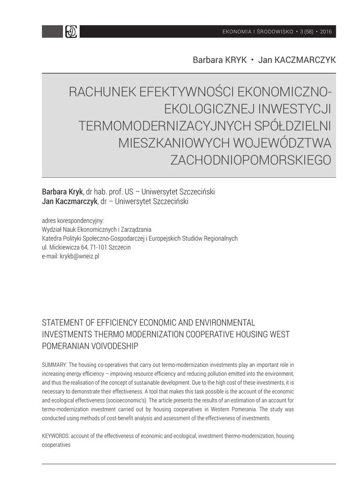EKONOMIA I ŚRODOWISKO • 3 (58) • 2016 Barbara KRYK • Jan KACZMARCZYK RACHUNEK EFEKTYWNOŚCI EKONOMICZNOEKOLOGICZNEJ INWESTYCJI TERMOMODERNIZACYJNYCH SPÓŁDZIELNI MIESZKANIOWYCH WOJEWÓDZTWA ZACHODNIOPOMORSKIEGO Barbara Kryk, dr hab. prof. US – Uniwersytet Szczeciński Jan Kaczmarczyk, dr – Uniwersytet Szczeciński adres korespondencyjny: Wydział Nauk Ekonomicznych i Zarządzania Katedra Polityki Społeczno-Gospodarczej i Europejskich Studiów Regionalnych ul. Mickiewicza 64, 71-101 Szczecin e-mail: [email protected] STATEMENT OF EFFICIENCY ECONOMIC AND ENVIRONMENTAL INVESTMENTS THERMO MODERNIZATION COOPERATIVE HOUSING WEST POMERANIAN VOIVODESHIP SUMMARY: The housing co-operatives that carry out termo-modernization investments play an important role in increasing energy efficiency – improving resource efficiency and reducing pollution emitted into the environment, and thus the realisation of the concept of sustainable development. Due to the high cost of these investments, it is necessary to demonstrate their effectiveness. A tool that makes this task possible is the account of the economic and ecological effectiveness (socioeconomic’s). The article presents the results of an estimation of an account for termo-modernization investment carried out by housing cooperatives in Western Pomerania. The study was conducted using methods of cost-benefit analysis and assessment of the effectiveness of investments. KEYWORDS: account of the effectiveness of economic and ecological, investment thermo-modernization, housing cooperatives 238 Studia i materiały EKONOMIA I ŚRODOWISKO 3 (58) • 2016 Wstęp Efektywność energetyczna jest jednym z podstawowych wyzwań strategii Europa 2020 oraz jej inicjatyw przewodnich: Europa efektywnie korzystająca z zasobów i Unia innowacji. Efektywność energetyczna należy do najbardziej opłacalnych sposobów zwiększania bezpieczeństwa dostaw energii oraz ograniczenia emisji gazów cieplarnianych i innych zanieczyszczeń. Pod wieloma względami można ją postrzegać jako największe źródło energii, jakim dysponuje Europa. Z tego powodu Unia Europejska wyznaczyła sobie za cel zmniejszenie do 2020 roku zużycia energii pierwotnej o 20% w porównaniu do 2007 roku. W unijnym Planie na rzecz efektywności energetycznej wskazano, że największy potencjał w zakresie oszczędności energetycznej przedstawiają budynki. Stąd skupiono się na instrumentach uruchamiających procesy renowacji budynków publicznych i prywatnych oraz poprawy energooszczędności stosowanych w nich elementów składowych i używanych w nich urządzeń. W kontekście powyższego – istotną rolę w zwiększeniu efektywności energetycznej, polepszaniu zasobooszczędności i ograniczaniu zanieczyszczeń emitowanych do środowiska przyrodniczego, a tym samym w realizacji koncepcji rozwoju zrównoważonego, odgrywają spółdzielnie mieszkaniowe. Spółdzielnie mieszkaniowe realizują koncepcję rozwoju zrównoważonego między innymi przez inwestycje termomodernizacyjne, które mają na celu głównie zmniejszenie zapotrzebowania i zużycia energii cieplnej, a przez to obniżenie kosztów ponoszonych na podgrzewanie wody, ogrzewanie pomieszczeń mieszkalnych, usługowych i biurowych. Inwestycje te obejmują zmiany budowlane poprawiające właściwości termiczne przegród (inwestycje w strukturze budowlanej) oraz zmiany w systemie ogrzewania podnoszące jego sprawność (inwestycje w systemie grzewczym)1. Każda inwestycja termomodernizacyjna, która powoduje oszczędności zasobów naturalnych, wzrost efektywności energetycznej i redukcję zanieczyszczeń jest ze społecznego punktu widzenia potrzebna, a nawet oczekiwana. Jeżeli przy tym występują korzyści ekonomiczne, to taka inwestycja jest nie tylko pożądana z punktu widzenia społecznego i ekologicznego, ale też ekonomicznego. Najbardziej wymierne i długotrwałe oszczędności przynoszą inwestycje wymagające dużych nakładów, z uwagi na to, że dotyczą elementów najbardziej wpływających na utratę ciepła. Są to działania takie, jak: ocieplenie ścian, ocieplenie stropów, dachu i podłóg oraz wymiana lub 1 Opracowano na podstawie ustawy z dnia 21 listopada 2008 r. o wspieraniu termomodernizacji i remontów (Dz. U. nr 223, poz. 1459 z późń. zm.); R. Babut, M. Dworzyńska-Opatczyk, A. Pogorzelski, Ochrona cieplna budynków i termomodernizacja, Warszawa 1996. EKONOMIA I ŚRODOWISKO 3 (58) • 2016 Studia i materiały modernizacja instalacji wewnętrznej doprowadzającej ciepło do budynków2. Ze względu na wysokie koszty inwestycji termomodernizacyjnych istnieje konieczność wykazania ich efektywności, co nie jest zadaniem łatwym. Narzędziem ułatwiającym realizację tego zadania jest rachunek efektywności ekonomiczno-ekologicznej (sozoekonomiczny, rachunek ekonomiczny ochrony środowiska). Rachunek efektywności ekonomiczno-ekologicznej to ogół czynności obliczeniowych i analitycznych (na przykład czynności rachunkowych, ekonometrycznych, bilansowych, porównawczych, odnoszących się do kosztów, wyników, cen), które wykorzystuje się do ustalenia celowości ekonomicznej, ekologicznej, a nawet społecznej i stopnia opłacalności zamierzonego przedsięwzięcia. Czynności te polegają przede wszystkim na ustaleniu i obliczeniu ilościowych oraz wartościowych nakładów (kosztów) i efektów w trzech wspomnianych wymiarach, na określeniu – w miarę potrzeby – różnych wariantów rozwiązań dla tego samego przedsięwzięcia oraz na uzasadnieniu wariantu optymalnego w danych warunkach (biorąc pod uwagę skuteczność) w celu podjęcia przez uprawniony do tego organ odpowiedniej decyzji [zmody ikowana samodzielnie de inicja rachunku ekonomicznego Klimas 2000, s. 483]3. Rachunek sozoekonomiczny może być wykorzystywany na różnych poziomach kreacji decyzji o inwestycjach proochronnych. Pozwala on ustalić dla działalności gospodarczej taki przedział tolerancji, w któ