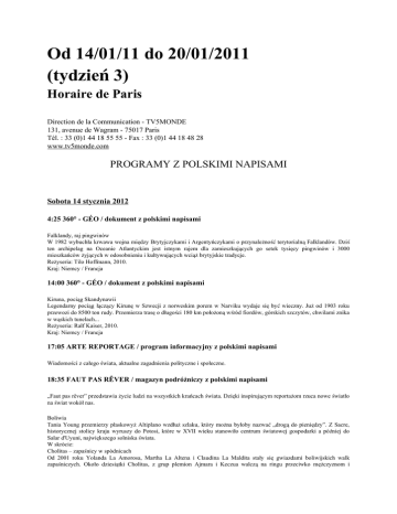 Od 14/01/11 do 20/01/2011 (tydzień 3) Horaire de Paris Direction de la Communication - TV5MONDE 131, avenue de Wagram - 75017 Paris Tél. : 33 (0)1 44 18 55 55 - Fax : 33 (0)1 44 18 48 28 www.tv5monde.com PROGRAMY Z POLSKIMI NAPISAMI Sobota 14 stycznia 2012 4:25 360° - GÉO / dokument z polskimi napisami Falklandy, raj pingwinów W 1982 wybuchła krwawa wojna między Brytyjczykami i Argentyńczykami o przynależność terytorialną Falklandów. Dziś ten archipelag na Oceanie Atlantyckim jest istnym rajem dla zamieszkujących go setek tysi ęcy pingwinów i 3000 mieszkańców żyjących w odosobnieniu i kultywujących wciąż brytyjskie tradycje. Reżyseria: Tilo Hoffmann, 2010. Kraj: Niemcy / Francja 14:00 360° - GÉO / dokument z polskimi napisami Kiruna, pociąg Skandynawii Legendarny pociąg łączący Kirunę w Szwecji z norweskim porem w Narviku wydaje się by ć wieczny. Ju ż od 1903 roku przewozi do 8500 ton rudy. Przemierza trasę o długości 180 km położoną wśród fiordów, górskich szczytów, chwilami znika w wąskich tunelach... Reżyseria: Ralf Kaiser, 2010. Kraj: Niemcy / Francja 17:05 ARTE REPORTAGE / program informacyjny z polskimi napisami Wiadomości z całego świata, aktualne zagadnienia polityczne i społeczne. 18:35 FAUT PAS RÊVER / magazyn podróżniczy z polskimi napisami „Faut pas rêver” przedstawia życie ludzi na wszystkich krańcach świata. Dzięki inspirującym reportażom rzuca nowe światło na świat wokół nas. Boliwia Tania Young przemierzy płaskowyż Altiplano wzdłuż szlaku, który można byłoby nazwa ć „drog ą do pieni ędzy”. Z Sacre, historycznej stolicy kraju wyruszy do Potosi, które w XVII wieku stanowiło centrum światowej gospodarki a pó źniej do Salar d'Uyuni, największego solniska świata. W skrócie: Cholitas – zapaśnicy w spódnicach Od 2001 roku Yolanda La Amorosa, Martha La Altena i Claudina La Maldita stały się gwiazdami boliwijskich walk zapaśniczych. Około dziesiątki Cholitas, z grup plemion Ajmara i Keczua walczą na ringu przeciwko m ężczyznom i regularnie z nimi wygrywają… Les mirages z Salar d'Uyuni Znajdujące się na wysokości 3600 m n.p.m. Salar d'Uyuni jest największym i najwyżej po ło żonym solniskiem na świecie. Pozostałość po wyschniętym słonym jeziorze prezentuje surowy i jednocześnie niezwykle piękny krajobraz. Pod solną skorupą znajduje się ponad połowa światowych złóż litu, cennego miękkiego metalu wykorzystywanego do produkcji akumulatorów do samochodów elektrycznych i sprzętów elektronicznych. Cud w Copacabanie Copacabana, przy brzegach jeziora Titicaca, jest miejscem jedynego w swoim rodzaju zwyczaju. W pierwszy weekend sierpnia, z okazji święta Matki Boskiej, Boliwijczycy i Peruwiańczycy tłumnie przybywają na plaże, by poświęcić swoje auta i prosić, by ich spełniły się ich najdroższe pragnienia. Zamaskowani pucybuci z La Paz W La Paz 3 000 pucybutów chodzi po ulicach w dużych kapturach, by nie zosta ć rozpoznanymi. Tutaj, zawód ten uznany jest za urągający godności i chcąc uniknąć społecznego wykluczenia, pucybuci pracują anonimowo. Bach w Amazonii Bach w sercu amazońskiej dżungli. Brzmi niezwykle jednak jest to dziedzictwo po misji Jezuitów w rejonie Chiquitania. W małej wiosce rolniczej Urubicha, gdzie żyją mieszkańcy z indiańskiego plemienia Chiquitanos, rozbrzmiewa muzyki barokowej w wykonaniu orkiestry symfonicznej . Przemyt owadów Biolog Fernando Guerra Serrudo, badacz Instytutu ekologii w Uniwersytetu w La Paz, od walczy z przemytem rzadkich gatunków owadów. Latający ludzie z Yungas W górach na północ od La Paz, ludzie nie chodzą to pracy, tylko do niej...lecą. Region jest królestwem producentów koki. Na co dzień, by przedostać się z jednego krańca doliny do drugiego, używaj ą oni sznurów, do których s ą przyczepieni za pomocą zwykłych drutów. Prowadzenie: Tania Young. 21:00 LE PLUS GRAND CABARET DU MONDE / rozrywka z polskimi napisami Patrick Sébastien i jego goście zabawiają widzów pokazami magii. Goście: Marlène Jobert, Frédérique Bel, Lorie, Indra, Fabrice Éboué, Laurent Baffie, Philippe Lavil, Jean-Luc Reichmann, Jean-Hugues Anglade, Philippe Geluck, Elsa. Pokazy: Pilobolus, Eric Niemen, Daramis et Daylis, Bernard Bilis, Dani Lary, Yu Ho Jin, Adam Trent, les Vavilov, Viktor & Constantin, Momento di passione... Prowadzenie: Patrick Sébastien. Niedziela 15 stycznia 2012 13:05 ÉPICERIE FINE / program kulturalno-kulinarny z polskimi napisami Małże bouchot Jesteśmy w Bretanii w zatoce Saint-Brieuc, najważniejszym miejscu dla francuskiej hodowli ma łż. Tutaj ma łże dorastaj ą zgodnie z rytem pływów na pełnym morzu na specjalnych palach. Metoda ta, która przyby ła do Francji w XIII wieku z Irlandii jest ciągle stosowana przez rodzinę Desbois, która hoduje mięczaki ju ż od trzech pokole ń. Pe łna, j ędrna ma łża bouchot o słodkawym smaku może być spożywana gotowana lub surowa. Jest to naturalny produkt, który można przyrządzić na tysiąc sposobów. Prowadzenie : Guy Martin. 18:55 VU DU CIEL / dokument z polskimi napisami Kanada (część 1) Kanada – ósma potęga gospodarcza i drugi, co do wielkości kraj świata – posiada niezwyk łe bogactwa naturalne, jak wieloryby i białuchy z Saint-Laurent, dzikie łososie czy Malartic przekształcone w kopalnię odkrywkową.. W programie Yann Arthus-Bertrand prezentuje stan ekologiczny obszarów Kanady. Reżyseria: Anastasia Mikova, David Jankowski, 2010. Prowadzenie Yann Arthus-Bertrand. Kraj: Francja 21:00 BAISERS VOLÉS / komediodramat z polskimi napisami Po odbyciu służby wojskowej Antoine Doinel łączy różne dorywcze zajęcia: jest nocnym stróżem, naprawia telewizory, handluje… W końcu zostaje zatrudniony przez specjalistyczną agencję jako „obserwator”. Jego zadaniem jest zdobycie pracy w przedsiębiorstwie, by dyskretnie obserwować pracowników i ich działania... Reżyseria: Fr