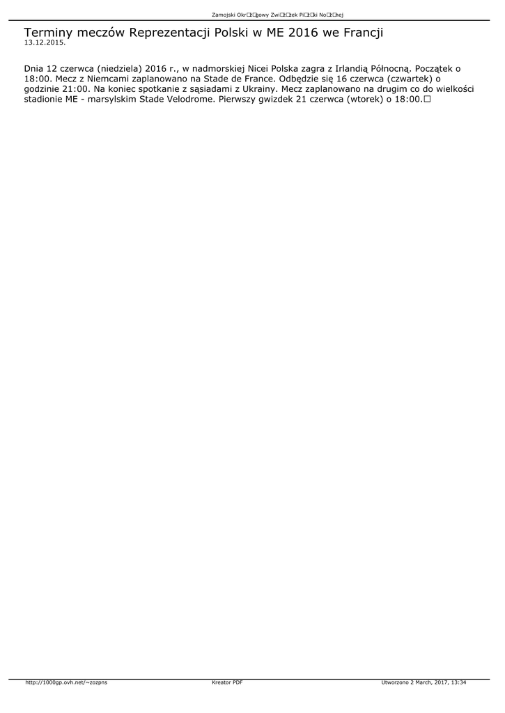 Zamojski Okrïż½gowy Zwiïż½zek Piïż½ki Noïż½nej Terminy meczów Reprezentacji Polski w ME 2016 we Francji 13.12.2015. Dnia 12 czerwca (niedziela) 2016 r., w nadmorskiej Nicei Polska zagra z Irlandią Północną. Początek o 18:00. Mecz z Niemcami zaplanowano na Stade de France. Odbędzie się 16 czerwca (czwartek) o godzinie 21:00. Na koniec spotkanie z sąsiadami z Ukrainy. Mecz zaplanowano na drugim co do wielkości stadionie ME - marsylskim Stade Velodrome. Pierwszy gwizdek 21 czerwca (wtorek) o 18:00. http://1000gp.ovh.net/~zozpns Kreator PDF Utworzono 2 March, 2017, 13:34