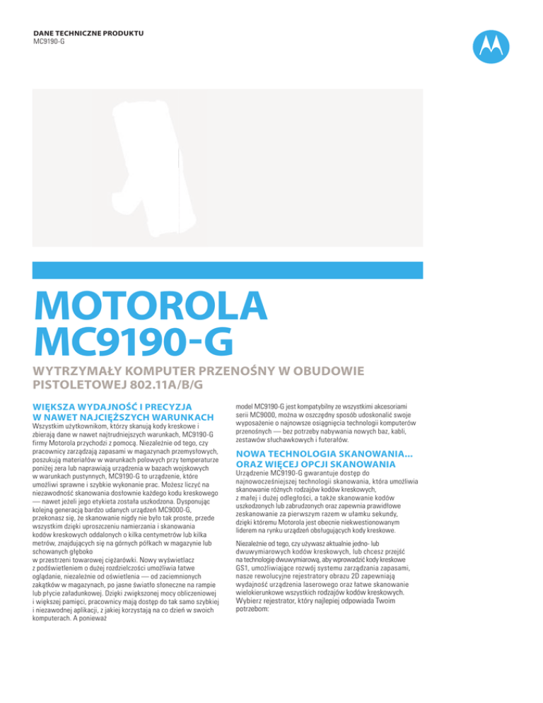 DANE TECHNICZNE PRODUKTU MC9190-G mOTOROlA mC9190-G wyTRZymAły KOmPUTER PRZENOŚNy w ObUDOwIE PIsTOlETOwEj 802.11A/b/G wIęKsZA wyDAjNOŚĆ I PRECyZjA w NAwET NAjCIężsZyCH wARUNKACH Wszystkim użytkownikom, którzy skanują kody kreskowe i zbierają dane w nawet najtrudniejszych warunkach, MC9190-G firmy Motorola przychodzi z pomocą. Niezależnie od tego, czy pracownicy zarządzają zapasami w magazynach przemysłowych, poszukują materiałów w warunkach polowych przy temperaturze poniżej zera lub naprawiają urządzenia w bazach wojskowych w warunkach pustynnych, MC9190-G to urządzenie, które umożliwi sprawne i szybkie wykonanie prac. Możesz liczyć na niezawodność skanowania dosłownie każdego kodu kreskowego — nawet jeżeli jego etykieta została uszkodzona. Dysponując kolejną generacją bardzo udanych urządzeń MC9000-G, przekonasz się, że skanowanie nigdy nie było tak proste, przede wszystkim dzięki uproszczeniu namierzania i skanowania kodów kreskowych oddalonych o kilka centymetrów lub kilka metrów, znajdujących się na górnych półkach w magazynie lub schowanych głęboko w przestrzeni towarowej ciężarówki. Nowy wyświetlacz z podświetleniem o dużej rozdzielczości umożliwia łatwe oglądanie, niezależnie od oświetlenia — od zaciemnionych zakątków w magazynach, po jasne światło słoneczne na rampie lub płycie załadunkowej. Dzięki zwiększonej mocy obliczeniowej i większej pamięci, pracownicy mają dostęp do tak samo szybkiej i niezawodnej aplikacji, z jakiej korzystają na co dzień w swoich komputerach. A ponieważ model MC9190-G jest kompatybilny ze wszystkimi akcesoriami serii MC9000, można w oszczędny sposób udoskonalić swoje wyposażenie o najnowsze osiągnięcia technologii komputerów przenośnych — bez potrzeby nabywania nowych baz, kabli, zestawów słuchawkowych i futerałów. NOwA TECHNOlOGIA sKANOwANIA... ORAZ wIęCEj OPCjI sKANOwANIA Urządzenie MC9190-G gwarantuje dostęp do najnowocześniejszej technologii skanowania, która umożliwia skanowanie różnych rodzajów kodów kreskowych, z małej i dużej odległości, a także skanowanie kodów uszkodzonych lub zabrudzonych oraz zapewnia prawidłowe zeskanowanie za pierwszym razem w ułamku sekundy, dzięki któremu Motorola jest obecnie niekwestionowanym liderem na rynku urządzeń obsługujących kody kreskowe. Niezależnie od tego, czy używasz aktualnie jedno- lub dwuwymiarowych kodów kreskowych, lub chcesz przejść na technologię dwuwymiarową, aby wprowadzić kody kreskowe GS1, umożliwiające rozwój systemu zarządzania zapasami, nasze rewolucyjne rejestratory obrazu 2D zapewniają wydajność urządzenia laserowego oraz łatwe skanowanie wielokierunkowe wszystkich rodzajów kodów kreskowych. Wybierz rejestrator, który najlepiej odpowiada Twoim potrzebom: DANE TECHNICZNE PRODUKTU MC9190-G Nasz rewolucyjny rejestrator dalekodystansowy, model SE4600, umożliwia skanowanie kodu kreskowego z odległości od 8 cali (20,32 cm) do nawet 30 stóp (9,14 m) niezależnie od warunków oświetleniowych — bez potrzeby stosowania specjalnych etykiet odblaskowych. Dwuwymiarowy rejestrator obrazu ogólnego przeznaczenia, model SE4500-SR, zapewnia najlepszy zakres i wydajność podczas skanowania jedno- i dwuwymiarowych kodów kreskowych o średniej i niskiej gęstości. Model SE4500-DL został opracowany z myślą o skanowaniu kodów kreskowych o średniej lub dużej gęstości, które stosuje się w prawach jazdy i innych dokumentach identyfikacyjnych, dzięki czemu doskonale sprawdza się na przejściach granicznych oraz w służbie zdrowia i w branży elektronicznej. Natomiast opcja DPM, SE4500-HD, została stworzona do skanowania kodów kreskowych o bardzo dużej gęstości oraz dosłownie wszystkich kodów Direct Part Mark (DPM) — takich jak kody w formacie dot peen, kody wytrawione laserem, nadruki atramentowe, kody wytrawione chemicznie, kody uzyskiwane na drodze odlewania, tłoczenia i natryskiwania cieplnego — dzięki czemu umożliwia producentom z branży samochodowej i lotniczej łatwe śledzenie i monitorowanie każdej części w celu zwiększenia bezpieczeństwa i spełnienia wymagań przepisów rządowych. Jeżeli konieczne jest skanowanie jedynie kodów jednowymiarowych, dwie opcje umożliwiają przystosowanie urządzenia MC9190-G do określonych warunków skanowania. Nowy model SE960 został zaprojektowany z myślą o skanowaniu średniozakresowym z bliska, podczas gdy SE1524 umożliwia natychmiastowe skanowanie kodów jednowymiarowych z odległości nawet 45 stóp (13,72 m). Niezależnie od wybranego aparatu użytkownicy zawsze otrzymują gwarancję prawidłowego skanowania za pierwszym razem, która gwarantuje utrzymanie działalności i większą wydajność pracowników — wszystkie nasze urządzenia umożliwiają skanowanie zadrapanych, brudnych i źle wydrukowanych kodów, które są powszechnie spotykane w magazynach wewnętrznych i zewnętrznych oraz w warunkach dystrybucyjnych. Najlepsza w branży, sprawdzona wytrzymała konstrukcja Udało nam się udoskonalić to, co i tak było najlepsze. Model MC9090-G jest powszechnie znany ze swej wytrzymałości — jednak MC9190-G wyznacza nową jakość w tej dziedzinie. Podobnie jak jego poprzednik, model MC9190-G przeszedł wszystkie wiodące branżowe testy wytrzymałości, niezawodności po oddziaływaniu gorąca, zimna, pyłu, deszczu i rozlania filiżanki kawy — a także test 2000 następujących po sobie uderzeń w naszym obrotowym bębnie do wstrząsów. Na podstawie wyników testów Opis usług PLATFORMA O DUŻYCH MOŻLIWOŚCIACH O WYDAJNOŚCI PRACY APLIKACJI ZBLIŻONEJ DO KOMPUTERÓW STACJONARNYCH Motorola MAX MPA 2.0 Nasza architektura technologiczna, oparta na najlepszych w klasie standardach, która zapewnia wiele korzyści: Najbardziej zaawansowane systemy operacyjne w urządzeniach przenośnych System operacyjny Windows® Mobile® 6.5 firmy Microsoft zwiększa interoperacyjnoś