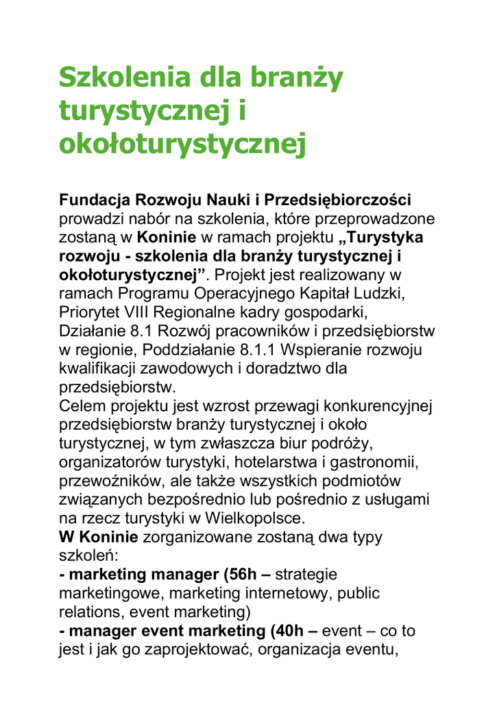 Szkolenia dla branży turystycznej i okołoturystycznej Fundacja Rozwoju Nauki i Przedsiębiorczości prowadzi nabór na szkolenia, które przeprowadzone zostaną w Koninie w ramach projektu „Turystyka rozwoju - szkolenia dla branży turystycznej i okołoturystycznej”. Projekt jest realizowany w ramach Programu Operacyjnego Kapitał Ludzki, Priorytet VIII Regionalne kadry gospodarki, Działanie 8.1 Rozwój pracowników i przedsiębiorstw w regionie, Poddziałanie 8.1.1 Wspieranie rozwoju kwalifikacji zawodowych i doradztwo dla przedsiębiorstw. Celem projektu jest wzrost przewagi konkurencyjnej przedsiębiorstw branży turystycznej i około turystycznej, w tym zwłaszcza biur podróży, organizatorów turystyki, hotelarstwa i gastronomii, przewoźników, ale także wszystkich podmiotów związanych bezpośrednio lub pośrednio z usługami na rzecz turystyki w Wielkopolsce. W Koninie zorganizowane zostaną dwa typy szkoleń: - marketing manager (56h – strategie marketingowe, marketing internetowy, public relations, event marketing) - manager event marketing (40h – event – co to jest i jak go zaprojektować, organizacja eventu, psychologiczne aspekty I uwarunkowania eventu, eventy w praktyce, planowanie organizacja i zarządzanie projektami eventowymi dla dzieci) Szkolenia poprowadzą najlepsi trenerzy z Poznania. Każdy uczestnik będzie miał możliwość skorzystania z dostępu do platformy e-learnigowej, na której zostaną zamieszczone dodatkowe materiały, zadania, case'y oraz platforma wymiany doświadczeń. W projekcie mogą wziąć udział osoby spełniające łącznie oba warunki: - osoby zatrudnione lub prowadzące własną działalność gospodarczą na terenie województwa wielkopolskiego, - pracownicy mikro- lub małych przedsiębiorstw zatrudnieni na podstawie umowy o pracę, zgłoszeni do udziału w projekcie przez pracodawcę. Szczegółowe informacje, w tym dokładny plan szkoleń dostępne są w biurze projektu. Kontakt: tel. 502 517 283, (61) 853 36 97, e-mail: [email protected] Strona internetowa projektu: www.turystyka.fundacjarozwoju.org.pl
