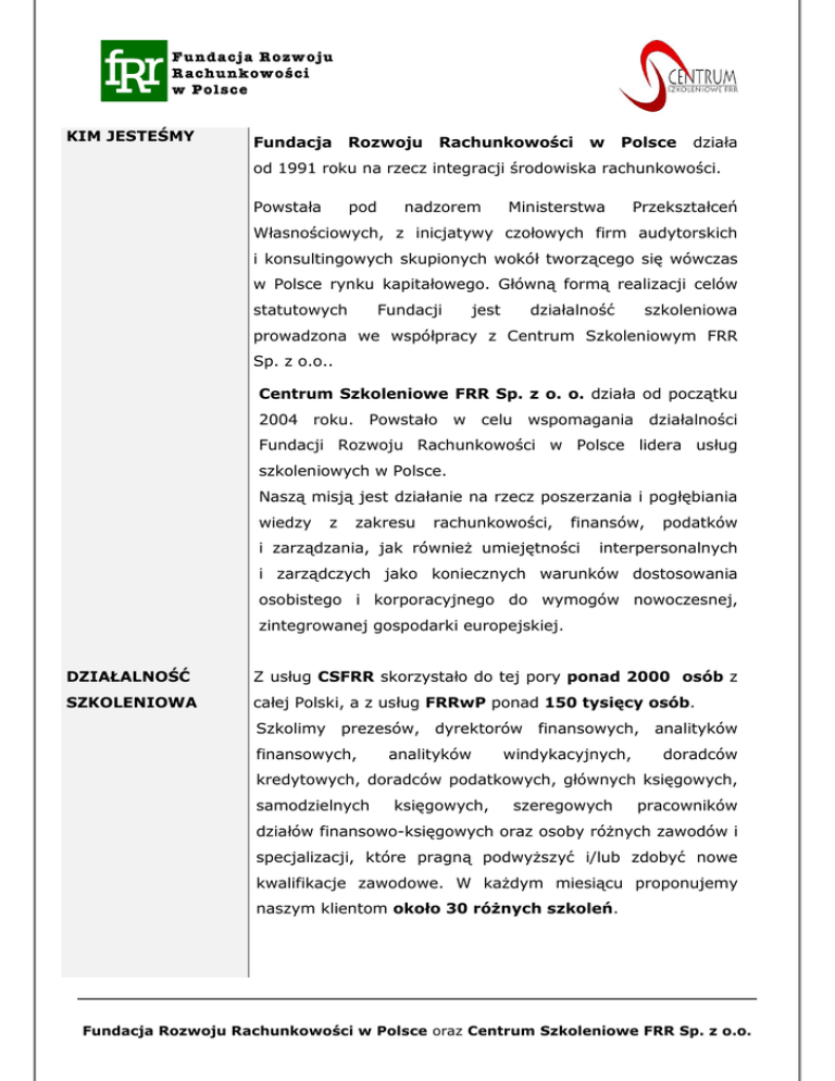 KIM JESTEŚMY Fundacja Rozwoju Rachunkowości w Polsce działa od 1991 roku na rzecz integracji środowiska rachunkowości. Powstała pod nadzorem Ministerstwa Przekształceń Własnościowych, z inicjatywy czołowych firm audytorskich i konsultingowych skupionych wokół tworzącego się wówczas w Polsce rynku kapitałowego. Główną formą realizacji celów statutowych Fundacji jest działalność szkoleniowa prowadzona we współpracy z Centrum Szkoleniowym FRR Sp. z o.o.. Centrum Szkoleniowe FRR Sp. z o. o. działa od początku 2004 roku. Powstało w celu wspomagania działalności Fundacji Rozwoju Rachunkowości w Polsce lidera usług szkoleniowych w Polsce. Naszą misją jest działanie na rzecz poszerzania i pogłębiania wiedzy z zakresu rachunkowości, finansów, i zarządzania, jak również umiejętności podatków interpersonalnych i zarządczych jako koniecznych warunków dostosowania osobistego i korporacyjnego do wymogów nowoczesnej, zintegrowanej gospodarki europejskiej. DZIAŁALNOŚĆ Z usług CSFRR skorzystało do tej pory ponad 2000 osób z SZKOLENIOWA całej Polski, a z usług FRRwP ponad 150 tysięcy osób. Szkolimy prezesów, dyrektorów finansowych, analityków finansowych, analityków windykacyjnych, doradców kredytowych, doradców podatkowych, głównych księgowych, samodzielnych księgowych, szeregowych pracowników działów finansowo-księgowych oraz osoby różnych zawodów i specjalizacji, które pragną podwyższyć i/lub zdobyć nowe kwalifikacje zawodowe. W każdym miesiącu proponujemy naszym klientom około 30 różnych szkoleń. Fundacja Rozwoju Rachunkowości w Polsce oraz Centrum Szkoleniowe FRR Sp. z o.o. Tematyka szkoleń obejmuje zagadnień dotyczących szerokie spektrum rachunkowości, finansów, zarządzania, kwalifikacji interpersonalnych, sprzedaży oraz audytu. Programy szkoleń uwzględniają wszelkie zmiany w obowiązujących przepisach, uczestnicy zajęć mają możliwość zapoznania się z nowymi regulacjami prawnymi. Wykładowcy służą również swoja pomocą w przypadku niejasnej interpretacji nowych przepisów. Programy zajęć dostosowane są do potrzeb naszych odbiorców. Uwzględniają specyfikę firm krajowych, a także zagranicznych działających na polskim rynku, ich struktury organizacyjne, formę własności, problemy z jakimi borykają się w trakcie działalności. Dają również szansę wychwycenia możliwości i zagrożeń dla funkcjonowania firmy. Problematyka uczestników zajęć - dotyczy szkolenie przeanalizowania, a jest nawet bezpośrednio często spraw miejscem rozwiązania ich konkretnych bolączek. Zajęcia wzbogacone konkretnymi przykładami pozwalają pracować z uwzględnieniem rzeczywistych problemów i pokazać praktyczne sposoby ich rozwiązania. W trakcie zajęć oraz po ich zakończeniu uczestnicy mają możliwość zadawania pytań i dyskusji z wykładowcą. W ten sposób uzyskują odpowiedzi na nurtujące ich pytania. Fundacja Rozwoju Rachunkowości w Polsce oraz Centrum Szkoleniowe FRR Sp. z o.o. Formy szkoleń: Szkolenia / warsztaty zawodowe Szkolenia / warsztaty otwarte Szkolenia / warsztaty zamknięte Szkolenia / warsztaty wyjazdowe Zakres tematyczny: Finanse – księgowość Prawo – zarządzanie Podatki Sprzedaż Kwalifikacje interpersonalne Pozyskiwanie funduszy unijnych Audyt WYKŁADOWCY O jakości naszej oferty szkoleniowej w głównej mierze decyduje wysoki poziom i odpowiednie przygotowanie wykładowców. Współpracujemy z wybitnymi specjalistami o szerokiej wiedzy teoretycznej i praktycznej, z dużym doświadczeniem i umiejętnościami dydaktycznymi. Są to m.in. eksperci i praktycy z: Ministerstwa Finansów, Urzędu Kontroli Skarbowej, Komisji Papierów Wartościowych, Narodowego Banku Polskiego, dyrektorzy i konsultanci w spółkach giełdowych i kancelariach prawniczych, partnerzy „wielkiej czwórki” i innych firm konsultingowych, wykładowcy najlepszych polskich wyższych uczelni. Fundacja Rozwoju Rachunkowości w Polsce oraz Centrum Szkoleniowe FRR Sp. z o.o. Przykłady realizowanych tematów szkoleniowych: Amortyzacja bilansowa i podatkowa Analiza sprawozdań finansowych Audyt informatyczny według wymogów UE Bezpieczny kredyt - zarządzanie ryzykiem kredytowym w banku Biura rachunkowe - egzamin Biznes plan Budżet- zmiany w ustawie Cash Flow Cash Flow dla zaawansowanych Ceny projektów inwestycyjnych Czytanie sprawozdań finansowych Derywaty, aspekty prawne, podatkowe Dyscyplina finansów publicznych Finanse spółek kapitałowych Gospodarka materiałowa Gwarancje bankowe Instrumenty finansowe Kapitał początkowy- obowiązki pracodawcy Kapitały własne i zysk Karty podatnika a księgowość podatkowa Klasyfikacja budżetowe Konsolidacja sprawozdań finansowych Koszty pracy. Rozliczanie, opodatkowanie i efektywność różnych form zatrudnienia Kredyty bankowe Książka przychodów i rozchodów Kurs przygotowujący do egzaminu na doradcę podatkowego Kurs przygotowujący do egzaminu państwowego na audytora wewnętrznego Kurs przygotowujący do usługowego prowadzenia ksiąg Leasing Leasing w świetle nowelizacji Międzynarodowe Standardy Rachunkowości a polskie prawo bilansowe Fundacja Rozwoju Rachunkowości w Polsce oraz Centrum Szkoleniowe FRR Sp. z o.o. Międzynarodowe Standardy Rachunkowości w towarzystwach ubezpieczeń Naruszenie dyscypliny finansów publicznych Narzędzia w zarządzaniu finansami Nowe możliwości w finansach Nowe prawo dewizowe Nowe prawo upadłościowe i naprawcze- wpływy postępowania w przedmiocie... (banki) Obowiązki pracodawcy- ZUS Ocena wiarygodności kontrahenta Od bilansu do bilansu Opcje i kontrakty terminowe Operacje dokumentowe- akred., inkaso Operacje na kapitałach zakładowych Opodatkowanie spółek prawa handlowego Podatek dochodowy od osób fizycznych Podatek dochodowy od osób prawnych Podatek odroczony Podatek VAT Podatkowe aspekty działalności marketingowej Podstawy zarządzania finansami dla niefinansistów Podziały 