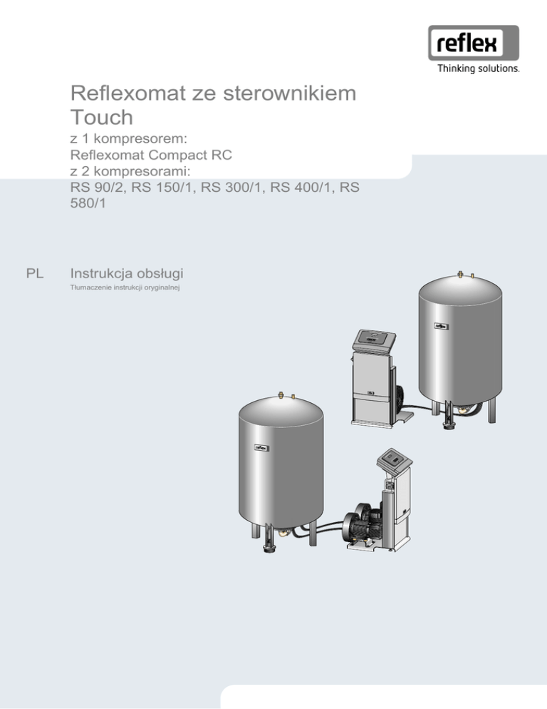 Reflexomat ze sterownikiem Touch z 1 kompresorem: Reflexomat Compact RC z 2 kompresorami: RS 90/2, RS 150/1, RS 300/1, RS 400/1, RS 580/1 PL Instrukcja obsługi Tłumaczenie instrukcji oryginalnej 01.06.2014 Spis treści Pols ki Reflexomat ze sterowni kiem Touc h 01.06.2014 Spis treści 1 Wskazówki do instrukcji obsługi............................................................................................. 6 2 Odpowiedzialność i rękojmia .................................................................................................. 6 3 Bezpieczeństwo........................................................................................................................ 7 3.1 3.2 3.3 3.4 3.5 3.6 4 Objaśnienie symboli ..........................................................................................................................7 3.1.1 Wskazówki zawarte w instrukcji..........................................................................................7 3.1.2 Symbole bezpieczeństwa zawarte w instrukcji ...................................................................7 Wymogi stawiane pracownikom ........................................................................................................8 Sprzęt ochrony indywidualnej ...........................................................................................................8 Eksploatacja zgodna z przeznaczeniem ...........................................................................................8 Niedopuszczalne warunki eksploatacji .............................................................................................8 Ryzyko szczątkowe ...........................................................................................................................9 Opis urządzeń......................................................................................................................... 10 4.1 4.2 4.3 4.4 4.5 4.6 Opis .................................................................................................................................................10 Widok poglądowy ............................................................................................................................11 Identyfikator .....................................................................................................................................12 4.3.1 Tabliczka znamionowa .....................................................................................................12 4.3.2 Kod typu ............................................................................................................................12 Funkcja ............................................................................................................................................13 Zakres dostawy ...............................................................................................................................15 Opcjonalne wyposażenie dodatkowe ..............................................................................................15 5 Dane techniczne ..................................................................................................................... 16 6 Montaż..................................................................................................................................... 20 6.1 6.2 6.3 6.4 6.5 6.6 7 Warunki montażu ............................................................................................................................21 6.1.1 Sprawdzenie stanu dostawy .............................................................................................21 Przygotowania .................................................................................................................................21 Wykonanie.......................................................................................................................................22 6.3.1 Pozycjonowanie ................................................................................................................22 6.3.2 Ustawianie zbiorników ......................................................................................................23 6.3.3 Podłączenie do instalacji ..................................................................................................24 6.3.4 Montaż miernika poziomu .................................................................................................27 Warianty uzupełniania i odgazowywania wody ...............................................................................28 6.4.1 Funkcja .............................................................................................................................28 Przyłącze elektryczne .....................................................................................................................31 6.5.1 Schemat elektryczny modułu przyłączeniowego ..............................................................32 6.5.2 Schemat elektryczny modułu sterowania .........................................................................34 6.5.3 Złącze RS-485 ..................................................................................................................35 Potwierdzenie montażu i uruchomienia ..........................................................................................36 Pierwsze uruchomienie.......................................................................................................... 37 7.1 7.2 7.3 7.4 7.5 7.6 7.7 4 — Polski Sprawdzenie warunków pierwszego uruchomienia ........................................................................37 Wyznaczanie minimalnego ciśnienia roboczego P0 dla sterownika ...............................................38 Edycja procedury rozruchu sterownika ...........................................................................................40 Odpowietrzanie zbiorników 