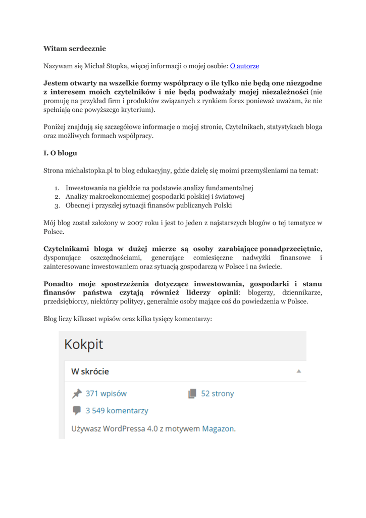 Witam serdecznie Nazywam się Michał Stopka, więcej informacji o mojej osobie: O autorze Jestem otwarty na wszelkie formy współpracy o ile tylko nie będą one niezgodne z interesem moich czytelników i nie będą podważały mojej niezależności (nie promuję na przykład firm i produktów związanych z rynkiem forex ponieważ uważam, że nie spełniają one powyższego kryterium). Poniżej znajdują się szczegółowe informacje o mojej stronie, Czytelnikach, statystykach bloga oraz możliwych formach współpracy. I. O blogu Strona michalstopka.pl to blog edukacyjny, gdzie dzielę się moimi przemyśleniami na temat: 1. Inwestowania na giełdzie na podstawie analizy fundamentalnej 2. Analizy makroekonomicznej gospodarki polskiej i światowej 3. Obecnej i przyszłej sytuacji finansów publicznych Polski Mój blog został założony w 2007 roku i jest to jeden z najstarszych blogów o tej tematyce w Polsce. Czytelnikami bloga w dużej mierze są osoby zarabiające ponadprzeciętnie, dysponujące oszczędnościami, generujące comiesięczne nadwyżki finansowe i zainteresowane inwestowaniem oraz sytuacją gospodarczą w Polsce i na świecie. Ponadto moje spostrzeżenia dotyczące inwestowania, gospodarki i stanu finansów państwa czytają również liderzy opinii: blogerzy, dziennikarze, przedsiębiorcy, niektórzy politycy, generalnie osoby mające coś do powiedzenia w Polsce. Blog liczy kilkaset wpisów oraz kilka tysięcy komentarzy: II. Nagrody i wyróżnienia Finałowa dziesiątka Ekonomiczny Blogu roku 2014: maj 2014; spośród 105 zakwalifikowanych do rywalizacji blogów wewnętrzna komisja portalu money.pl zakwalifikowała mój blog do dziesięciu finalistów Osiem giełdowych blogów, które warto znać: kwiecień 2014; wyróżnienie Gazety Giełdy Parkiet dla ciekawych blogów o inwestowaniu III. Statystyki bloga: 2532 subskrybentów newslettera Google Analytics: dane za ostatni miesiąc (6 październik 2014- 5 listopad 2014): Liczba unikalnych użytkowników: 14 105 Liczba odwiedzin bloga: 24 186 Liczba odsłon stron bloga: 45 799 Średni czas trwania wizyty: 2 minuty i 34 sekundy Wysoka lojalność: 50% użytkowników to osoby powracające na bloga Prawie 40% czytelników pochodzi z województwa mazowieckiego (Warszawa) 2305 fanów na Facebooku: Michał Stopka Inwestor Profesjonalny Według statystyk Facebooka, które reprezentują niewielką część Czytelników, blog czytają głównie mężczyźni (prawie 80%) i osoby w wieku 25-34 lat (prawie połowa fanów na Facebooku): IV. Potencjalne formy współpracy: 1. Partner artykułu Logo Partnera pojawi się przy artykule, który ukaże się na moim blogu. Usługa obejmuje również rozesłanie informacji o artykule do subskrybentów newslettera oraz w mediach społecznościowych (Facebook). Artykuł będzie zawierał wyraźną informację o Partnerze artykułu wraz z linkiem do wskazanej strony przez Partnera. Nie akceptuję zewnętrznych publikacji: artykuł przy którym pojawi się logo Partnera będzie mojego autorstwa i będzie dotyczył tematyki powiązanej z historycznymi wpisami na moim blogu. 2. Partner bloga Logo Partnera pojawi się na moim blogu przez okres jednego miesiąca (pod zapisem na newsletter po prawej stronie bloga). Ponadto Logo Partnera pojawi się przy dwóch artykułach, które ukażą się na moim blogu. Dokładnie na tych samych zasadach jak opisano w punkcie pierwszym powyżej. 3. Przygotowanie materiałów szkoleniowych, edukacyjnych lub analiz na wybrane tematy Materiały mogą dotyczyć na przykład inwestowania, gospodarki, finansów osobistych lub metod wyceny 4. Szkolenia i prelekcje na wybrane tematy Zakres tematyczny może być związany z szeroko rozumianymi rynkami kapitałowymi i gospodarką. Dzięki mojemu szkoleniu: ”Michał Stopka: praktyczna analiza gospodarki, spółek i wycena firm” mam doświadczenie w pracy z kursantami oraz umiejętność przekazywania w przystępny sposób mojej wiedzy i doświadczenia. Opinie osób, które wzięły udział w moich szkoleniach znajdują się tutaj: Szkolenia: opinie uczestników Jestem również otwarty na wszelkiego rodzaju współpracę niestandardową, szczególnie, że mam bardzo wiele pomysłów w zakresie rozbudowy merytorycznej zawartości mojego bloga V. Cennik Jeżeli jesteś zainteresowany/zainteresowana szczegółowym cennikiem proszę o kontakt. W mailu proszę podać dokładny opis na czym miałaby polegać ewentualna współpraca. Obiecuję, że odpiszę na każdego maila.