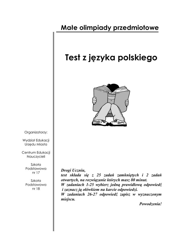 Małe olimpiady przedmiotowe Test z języka polskiego Organizatorzy: Wydział Edukacji Urzędu Miasta Centrum Edukacji Nauczycieli Szkoła Podstawowa nr 17 Szkoła Podstawowa nr 18 Drogi Uczniu, test składa się z 25 zadań zamkniętych i 2 zadań otwartych, na rozwiązanie których masz 80 minut. W zadaniach 1-25 wybierz jedną prawidłową odpowiedź i zaznacz ją ołówkiem na karcie odpowiedzi. W zadaniach 26-27 odpowiedź zapisz w wyznaczonym miejscu. Powodzenia! Lekcje eliksirów odbywały się w jednym z lochów. Było tam zimniej niŜ w reszcie zamku, a w dodatku wzdłuŜ ścian stały półki pełne słojów, w których pływały najróŜniejsze marynowane zwierzęta. JuŜ to wystarczyło, Ŝeby dostać gęsiej skórki, kiedy się tam weszło. Snape, podobnie jak Flitwick, zaczął od odczytania listy i podobnie jak Flitwick zatrzymał się przy nazwisku Harry’ego. -Ach, tak – powiedział cicho – Harry Potter. Nasza nowa znakomitość. Draco Malfoy i jego przyjaciele Crabbe i Goyle parsknęli śmiechem, zakrywając twarze rękami. Snape skończył odczytywać nazwiska i spojrzał po klasie. Oczy miał czarne jak Hagrid, ale nie było w nich ani krzty ciepła. Były to oczy zimne i puste, przywodzące na myśl ciemne tunele. - Jesteście tutaj, Ŝeby się nauczyć subtelnej, a jednocześnie ścisłej sztuki przyrządzania eliksirów – zaczął. Mówił prawie szeptem, ale słyszeli kaŜde słowo; Snape, podobnie jak profesor McGonagall, potrafił utrzymywać w klasie ciszę bez podnoszenia głosu. – Nie ma tutaj głupiego wymachiwania róŜdŜkami, więc być moŜe wielu z was uwaŜa, Ŝe to w ogóle nie jest magia. Nie oczekuję od was, Ŝe naprawdę docenicie piękno kipiącego kotła i unoszącej się z niego roziskrzonej pary, delikatną moc płynów, które pełzną przez Ŝyły człowieka, aby oczarować umysł i usidlić zmysły… Mogę was nauczyć, jak uwięzić w butelce sławę, uwarzyć chwałę, a nawet powstrzymać śmierć, jeśli tylko nie jesteście bandą bałwanów, jakich zwykle muszę nauczać. Po tym krótkim przemówieniu znowu zapadła głucha cisza. Harry i Ron wymienili spojrzenia, unosząc brwi. Hermiona Granger prawie zsunęła się z krzesła, sprawiając wraŜenie osoby, która zamierza udowodnić, Ŝe nie jest bałwanem. - Potter! – powiedział znienacka Snape – Co mi wyjdzie, jeśli dodam sproszkowanego korzenia asfodelusa do nalewki z piołunu? Sproszkowanego korzenia czego? Do nalewki z czego? Harry zerknął na Rona, ale ten sprawiał wraŜenie kompletnie ogłupiałego i z pewnością taki był. Ręka Hermiony wystrzeliła w powietrze. - Nie wiem, panie profesorze – odpowiedział Harry. Wargi Snape’a wykrzywiły się w drwiącym uśmiechu. - Aha! Najwyraźniej sława to nie wszystko. ZlekcewaŜył podniesioną rękę Hermiony. - Spróbujemy jeszcze raz. Potter, gdzie będziesz szukał, jeśli ci powiem, Ŝebyś znalazł mi bezoar? 2 Hermiona wyciągnęła rękę tak wysoko, jak zdołała, nie opuszczając swojej ławki, ale Harry nie miał zielonego pojęcia, co to jest bezoar. Starał się nie patrzeć na Malfoya, Crabbe’a i Goyle’a, którzy trzęśli się ze śmiechu. - Nie wiem, panie profesorze. - Wydaje mi się, Ŝe nie zaglądałeś do Ŝadnej ksiąŜki, zanim tu przyjechałeś, co Potter? Harry zmusił się, by spojrzeć prosto w te zimne oczy. Oczywiście zaglądał do ksiąŜek u Dursleyów, ale czyŜby Snape oczekiwał, Ŝe zapamięta kaŜdy przepis? Snape wciąŜ nie dostrzegał drŜącej ręki Hermiony. - Potter, jaka jest róŜnica między mordownikiem a tojadem Ŝółtym? Hermiona wstała, celując dwoma palcami w sklepienie lochu. - Nie wiem – powiedział cicho Harry – Myślę jednak, Ŝe wie Hermiona, więc dlaczego pan jej nie zapyta? Rozległy się pojedyncze śmiechy; Harry napotkał spojrzenie Seamusa, który puścił do niego oko. Snape nie był jednak zachwycony. - Siadaj – warknął na Hermionę – A więc dowiedz się, Potter, Ŝe asfodelus i piołun dają napój usypiający o takiej mocy, Ŝe znany jest równieŜ jako wywar Ŝywej śmierci. Bezoar to kamień tworzący się w Ŝołądku kozy, który chroni przed wieloma truciznami. Jeśli chodzi o mordownik i tojad Ŝółty, to jest to ta sama roślina, nazywana równieŜ akonitem. Dlaczego tego nie zapisujecie? Zrobił się ruch, wszyscy sięgnęli po pióra i pergaminy. - Potter – twoja ignorancja pozbawiła właśnie Gryffindor jednego punktu. J. K. Rowling, Harry Potter i kamień filozoficzny Odpowiedz na pytania na podstawie powyŜszego tekstu. 1) Co to jest eliksir? a) b) c) d) płyn powstający z róŜnych ziół i nalewek płyn o magicznych właściwościach płyn mogący zapewnić sławę i chwałę wszystkie odpowiedzi są poprawne 2) Dlaczego uczniowie zachowywali się cicho podczas lekcji? a) b) c) d) lekcja eliksirów to trudny przedmiot nauczyciel mówił cicho w lochu nie moŜna było krzyczeć ze względu na szacunek do nauczyciela 3 3) Dlaczego uczniowie dostali gęsiej skórki na lekcji eliksirów? a) b) c) d) ze strachu i zakłopotania z powodu gorąca i duchoty w lochu z powodu zimna i strachu ze wzruszenia i niepokoju 4) Jak działa eliksir? a) b) c) d) powoduje śmierć wpływa na intelekt uwalnia zmysły zwęŜa Ŝyły 5) Jaki był stosunek nauczyciela do innych umiejętności uczonych w szkole? a) b) c) d) pełen podziwu naboŜny obojętny Ŝadna odpowiedź nie jest poprawna 6) Skąd wiemy, Ŝe Snape lubi przyrządzanie eliksirów? a) b) c) d) wypowiada się o tym z humorem mówi o tym wprost nie wypowiada się na ten temat nazywa to sztuką 7) Jaki zabieg językowy został uŜyty w wypowiedzi nauczyciela: Mogę was nauczyć, jak uwięzić w butelce sławę, uwarzyć chwałę...? a) b) c) d) przenośnia onomatopeja epitet porównanie 8) Jakie uczucie nauczyciela kryje się w stwierdzeniu: - Ach, tak – powiedział cicho – Harry Potter. Nasza nowa znakomitość. a) b) c) d) zadziwienie zachwyt ironia nienawiść 9