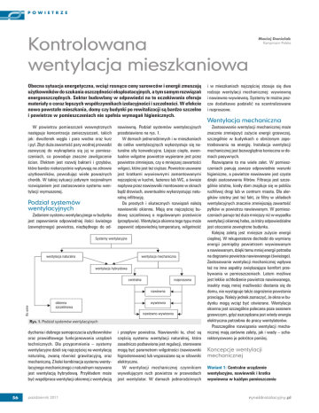POWIETRZE Kontrolowana wentylacja mieszkaniowa Obecna sytuacja energetyczna, wciąż rosnące ceny surowców i energii zmuszają użytkowników do szukania oszczędności eksploatacyjnych, a tym samym rozwiązań energooszczędnych. Sektor budowlany w odpowiedzi na te oczekiwania oferuje materiały o coraz lepszych współczynnikach izolacyjności i szczelności. W efekcie nowo powstałe mieszkania, domy czy budynki po rewitalizacji są bardzo szczelne i powietrze w pomieszczeniach nie spełnia wymagań higienicznych. Maciej Danielak Kampmann Polska i w mieszkaniach najczęściej stosuje się dwa rodzaje wentylacji mechanicznej: wywiewną i nawiewno-wywiewną. Systemy te można jeszcze dodatkowo podzielić na scentralizowane i rozproszone. Wentylacja mechaniczna W powietrzu pomieszczeń wewnętrznych następuje koncentracja zanieczyszczeń, takich jak: dwutlenek węgla i para wodna oraz kurz i pył. Zbyt duża zawartość pary wodnej prowadzi zazwyczaj do wykraplania się jej w pomieszczeniach, co powoduje znaczne zawilgocenie ścian. Efektem jest rozwój bakterii i grzybów, które bardzo niekorzystnie wpływają na zdrowie użytkowników, powodując wiele poważnych chorób. W takiej sytuacji jedynym racjonalnym rozwiązaniem jest zastosowanie systemu wentylacji wymuszonej. Podział systemów wentylacyjnych Zadaniem systemu wentylacyjnego w budynku jest zapewnienie odpowiedniej ilości świeżego (zewnętrznego) powietrza, niezbędnego do od- nawiewną. Podział systemów wentylacyjnych przedstawiono na rys. 1. W domach jednorodzinnych i w mieszkaniach do celów wentylacyjnych wykorzystuje się naturalne siły konwekcyjne. Lżejsze ciepłe, ewentualnie wilgotne powietrze wypierane jest przez powietrze zimniejsze, czy o mniejszej zawartości wilgoci, które jest też cięższe. Powietrze usuwane jest kratkami wywiewnymi zamontowanymi najczęściej w kuchni, łazience lub WC, a świeże napływa przez nawiewniki montowane w oknach bądź drzwiach, ewentualnie wykorzystując naturalną infiltrację. Do prostych i skutecznych rozwiązań należą nawiewniki okienne. Mają one najczęściej budowę szczelinową o regulowanym prześwicie (przepływie). Wentylacja okienna tego typu może zapewnić odpowiednią temperaturę, wilgotność Systemy wentylacyjne wentylacja naturalna wentylacja mechaniczna wentylacja hybrydowa centralna rozproszona Rys. autora nawiewna okienna szczelinowa wywiewna nawiewno-wywiewna Rys. 1. Podział systemów wentylacyjnych dychania i dobrego samopoczucia użytkowników oraz prawidłowego funkcjonowania urządzeń technicznych. Dla przypomnienia – systemy wentylacyjne dzieli się najczęściej na wentylację naturalną, zwaną również grawitacyjną, oraz mechaniczną. Z kolei kombinacja systemu wentylacyjnego mechanicznego z naturalnym nazywana jest wentylacją hybrydową. Przykładem może być współpraca wentylacji okiennej z wentylacją 56 październik 2011 i przepływ powietrza. Nawiewniki te, choć są częścią systemu wentylacji naturalnej, która zasadniczo pozbawiona jest regulacji, sterowane mogą być parametrem wilgotności (nawiewniki higrosterowane) lub wyposażane są w siłowniki elektryczne. W wentylacji mechanicznej czynnikiem wywołującym ruch powietrza w przewodach jest wentylator. W domach jednorodzinnych Zastosowanie wentylacji mechanicznej może znacznie zmniejszyć zużycie energii grzewczej, szczególnie w budynkach o obniżonym zapotrzebowaniu na energię. Instalacja wentylacji mechanicznej jest bezwzględnie konieczna w domach pasywnych. Rozwiązanie to ma wiele zalet. W pomieszczeniach panują zawsze odpowiednie warunki higieniczne, a powietrze nawiewane jest czyste dzięki zastosowaniu filtrów. Filtracja jest szczególnie istotna, kiedy dom znajduje się w pobliżu ruchliwej drogi lub w centrum miasta. Dla alergików istotny jest też fakt, że filtry w układach wentylacyjnych znacznie zmniejszają zawartość pyłków w powietrzu nawiewanym. W pomieszczeniach panuje też dużo mniejszy niż w wypadku wentylacji okiennej hałas, za który odpowiedzialne jest otoczenie zewnętrzne budynku. Kolejną zaletą jest mniejsze zużycie energii cieplnej. W rekuperatorze dochodzi do wymiany energii pomiędzy powietrzem wywiewanym a nawiewanym, dzięki temu mniej energii potrzeba na dogrzanie powietrza nawiewanego (świeżego). Zastosowanie wentylacji mechanicznej wpływa też na inne aspekty zwiększające komfort przebywania w pomieszczeniach. Latem możliwe jest lekkie ochłodzenie powietrza nawiewanego, insekty mają mniej możliwości dostania się do domu, nie występuje także zagrożenie powstania przeciągu. Należy jednak zaznaczyć, że okna w budynku mogą wciąż być otwierane. Wentylacja okienna jest szczególnie polecana poza sezonem grzewczym, gdyż oszczędzana jest wtedy energia elektryczna potrzebna do pracy wentylatorów. Poszczególne rozwiązania wentylacji mechanicznej mają zarówno zalety, jak i wady – scharakteryzowano je pokrótce poniżej. Koncepcje wentylacji mechanicznej Wariant 1: Centralne urządzenie wentylacyjne, nawiewnik i kratka wywiewna w każdym pomieszczeniu rynekinstalacyjny.pl POWIETRZE Ze względu na łatwy montaż kratki nawiewne i wywiewne montowane są najczęściej blisko siebie. + każde pomieszczenie ma indywidualnie dopasowany wydatek powietrza, – duża liczba przewodów wentylacyjnych. – zmniejszona sprawność energetyczna, – zwiększone ryzyko wystąpienia hałasu, – nawiew i wywiew usytuowane w pobliżu, dlatego zwiększa się prawdopodobieństwo wystąpienia krótkotrwałego zwarcia elektrycznego. Wariant 2: Centralne urządzenie wentylacyjne, nawiewnik w sypialniach, wywiew w kuchni, łazience i WC („wentylacja kaskadowa”) W budynku o przestrzennej architekturze można zrezygnować z niektórych nawiewów. Gdy w budynku jest tylko jedna sypialnia, drugi nawiew powinien się znajdować w pokoju dziennym (salonie). W przeciwnym razie wydatek powietrza nawiewanego do sypi